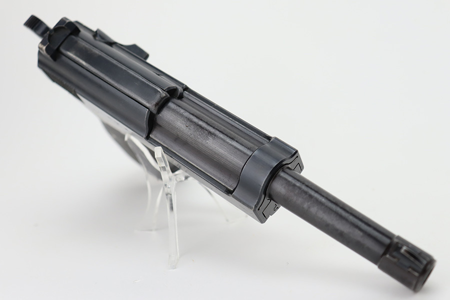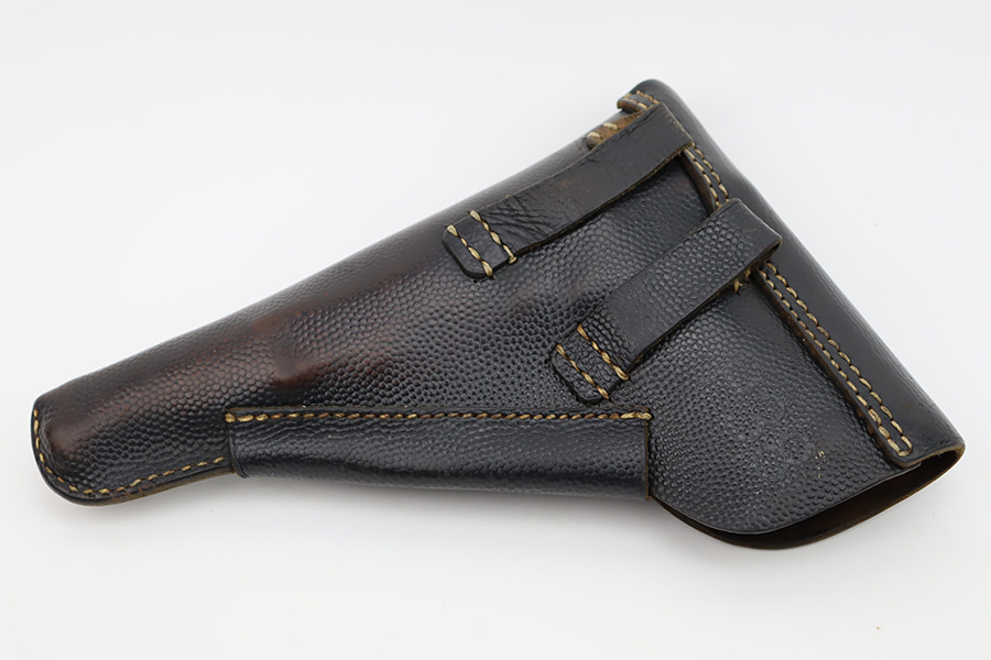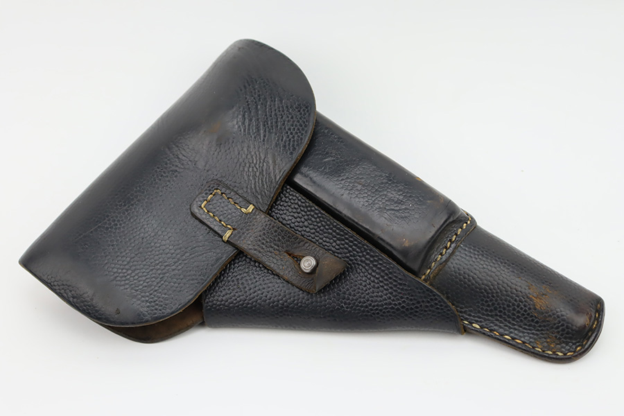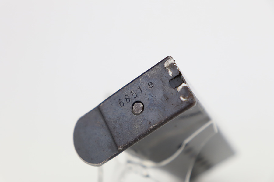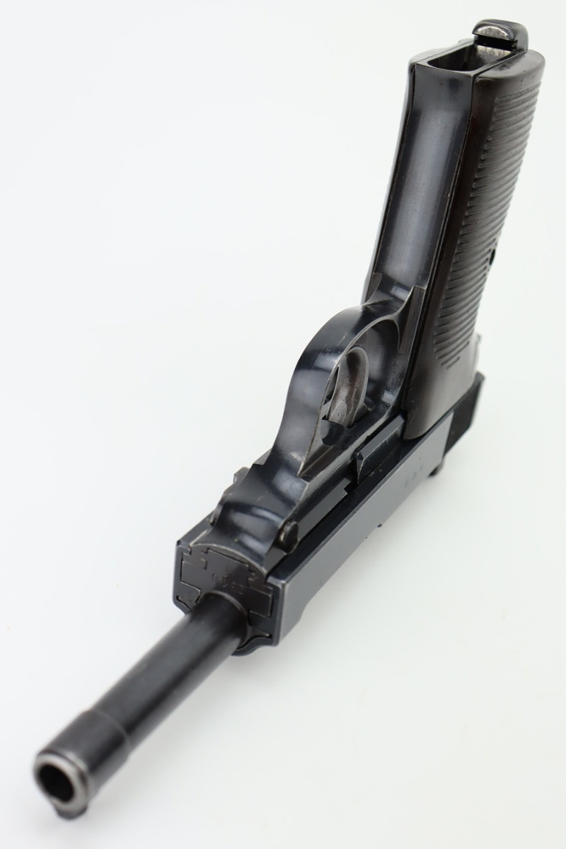 11/6/23 – This is an excellent example of an AC 42 Walther P.38 issued to the Nazi military in 1942. All matching with the proper “Eagle 359” military acceptance proofs throughout. It comes as a rig with a very nice 1944-dated pebble grain holster, one numbered but mismatched magazine, and one post-war magazine. The gun itself has retained about 96% of its original finish with just minor wear around the muzzle and front edges of the slide. Some very light freckling along the barrel and on small spot on the left side of the slide. Fitted with excellent period-correct bakelite grips. Very nice bore with great rifling. De-cocker is functional.
