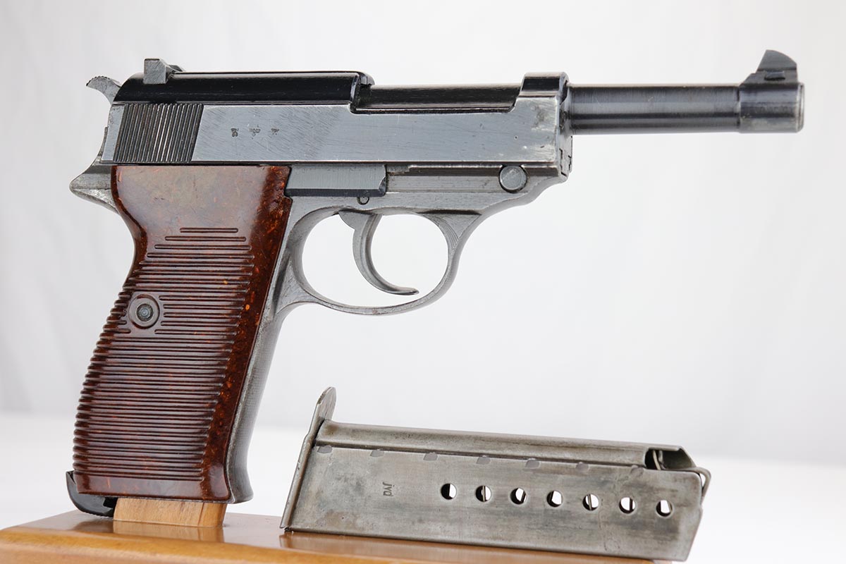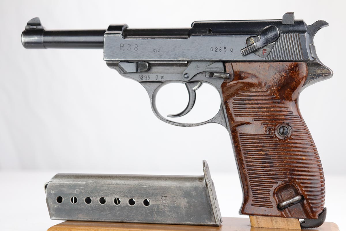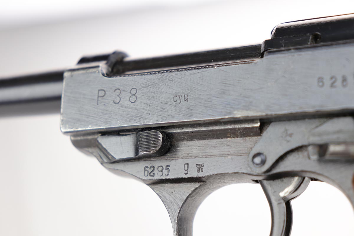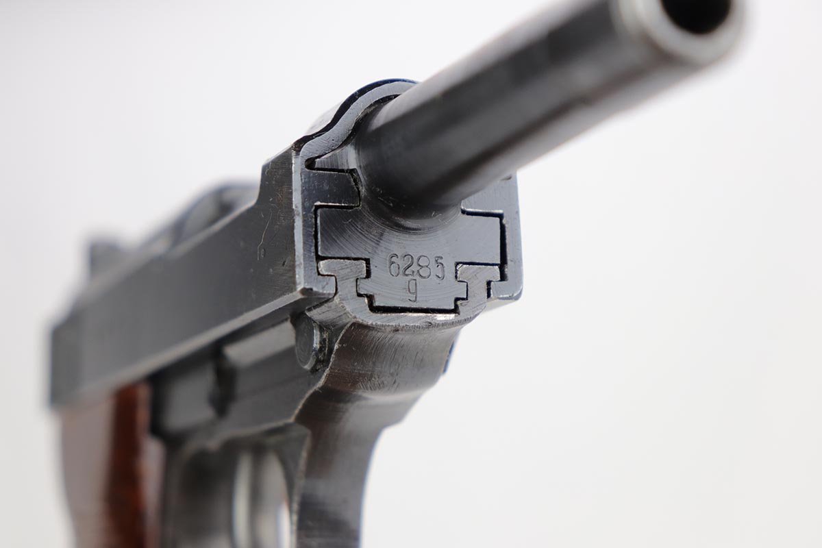 11/15/19 – This is an excellent example of an original 1943/44 Spreewerke P.38. Its original original finish rates about 95% with most of the wear being thinning on the front strap, the muzzle, and discoloration on the tang. It comes with period-correct beautiful reddish grips. The bore is worn. The gun functions properly for the most part, but the decocker does not work. This is a common issue with guns put together with forced labor. The gun shows signs of crude workmanship. Otherwise, the mechanics are just fine. The gun comes with a period-correct JVD magazine numbered to a different gun.