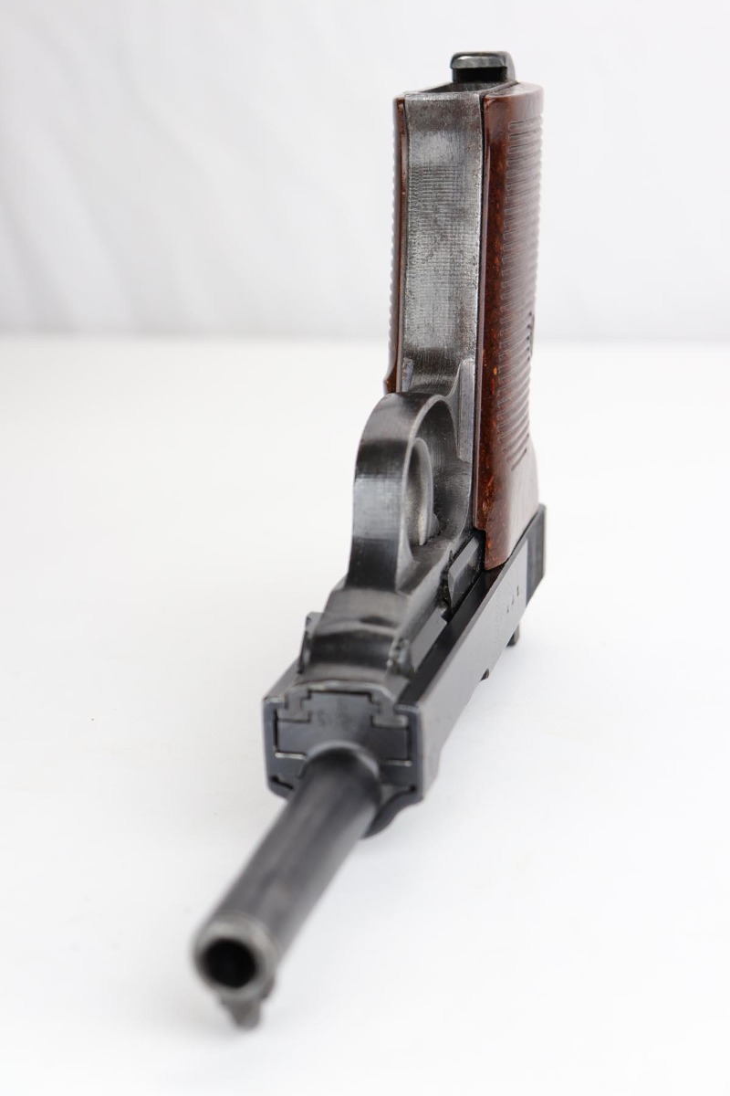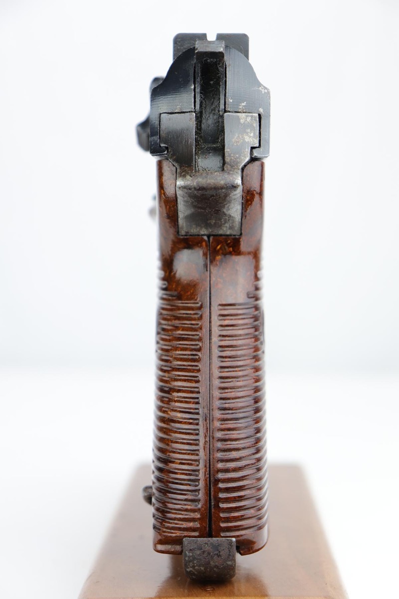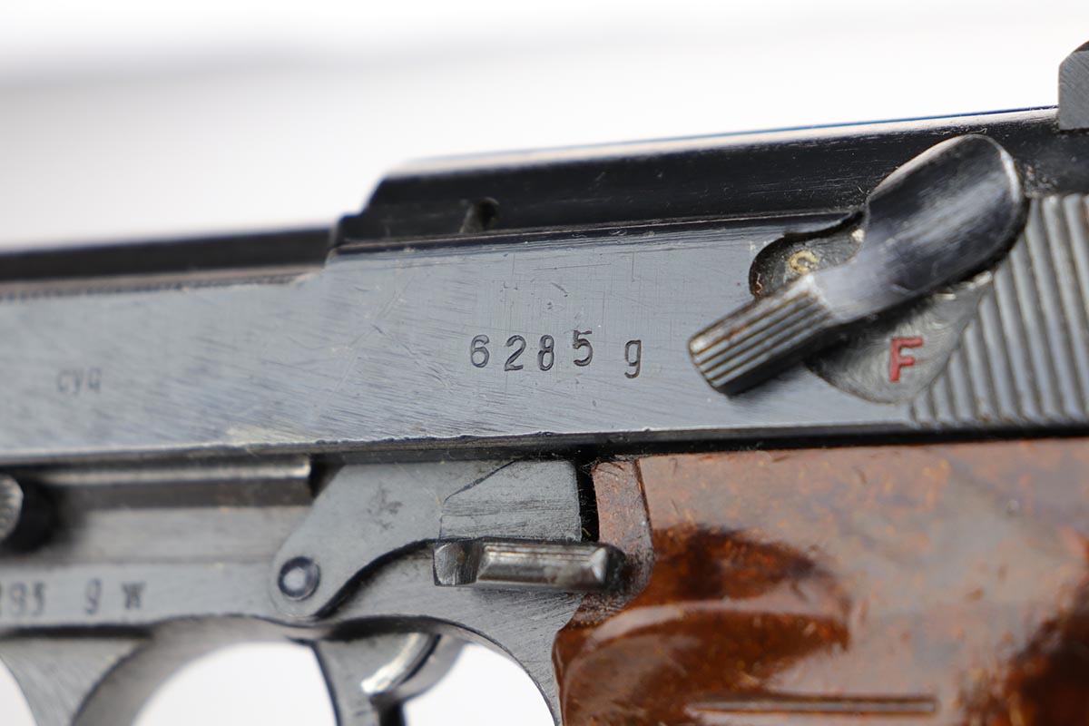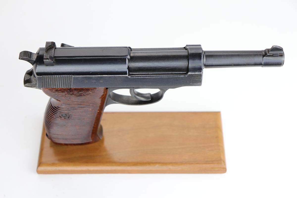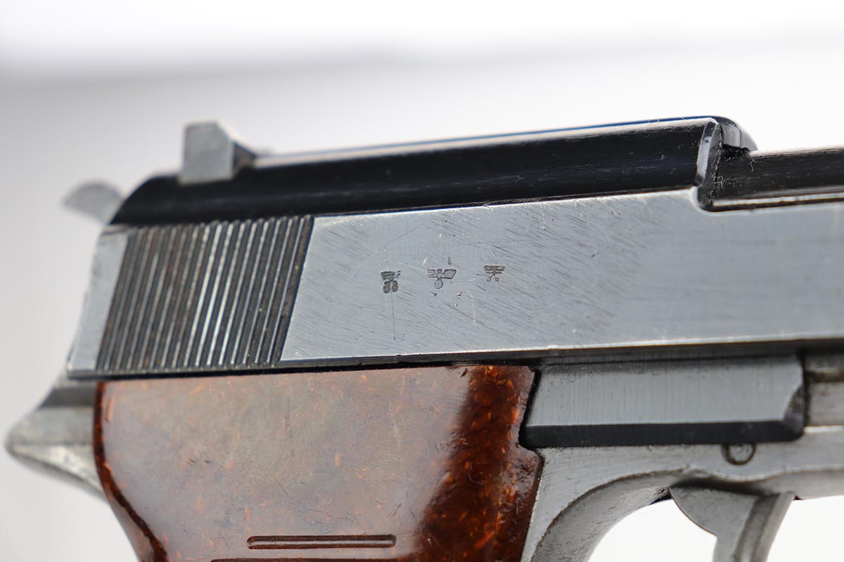 11/15/19 – This is an excellent example of an original 1943/44 Spreewerke P.38. Its original original finish rates about 95% with most of the wear being thinning on the front strap, the muzzle, and discoloration on the tang. It comes with period-correct beautiful reddish grips. The bore is worn. The gun functions properly for the most part, but the decocker does not work. This is a common issue with guns put together with forced labor. The gun shows signs of crude workmanship. Otherwise, the mechanics are just fine. The gun comes with a period-correct JVD magazine numbered to a different gun.
