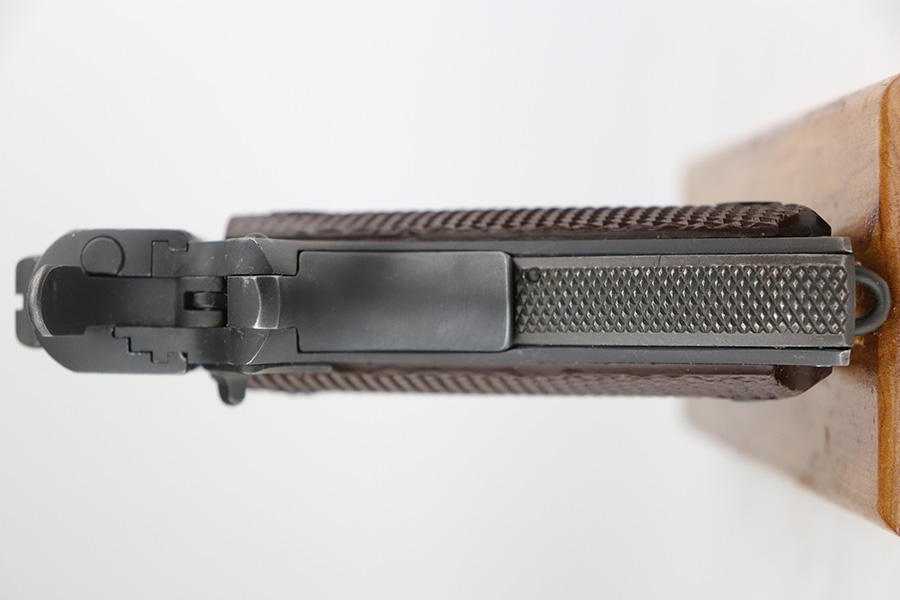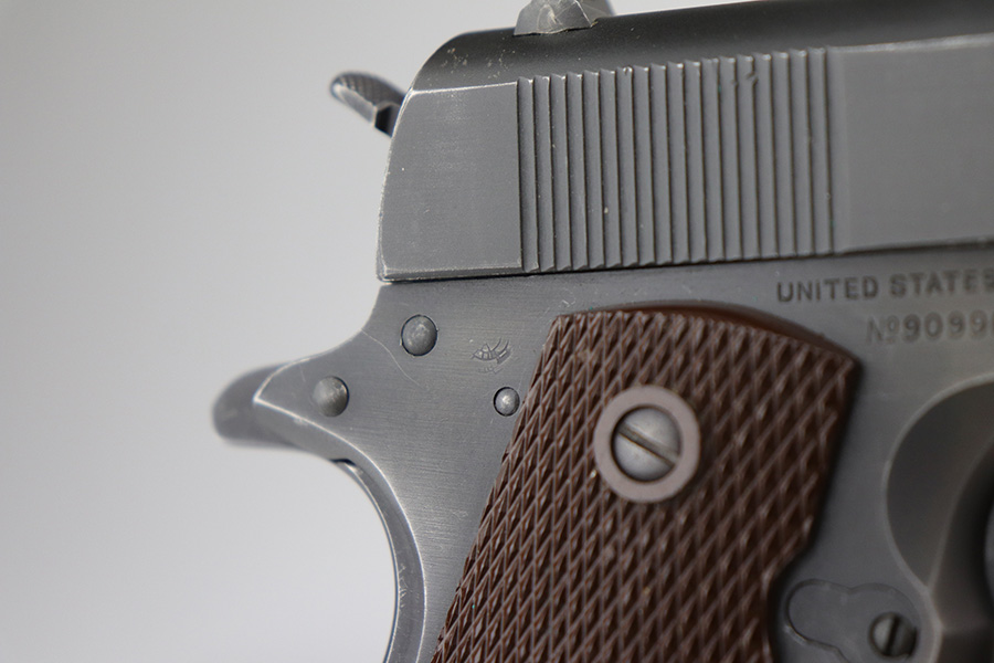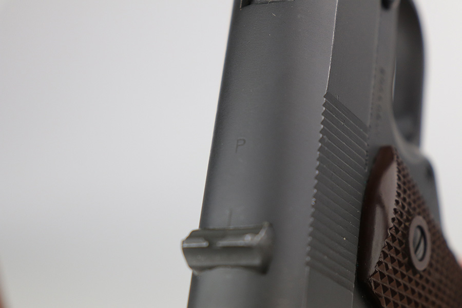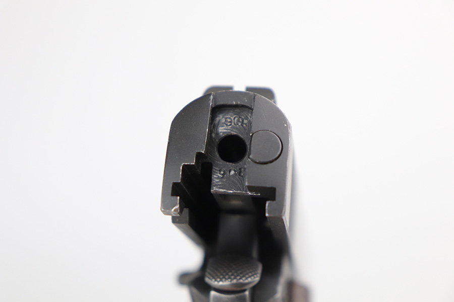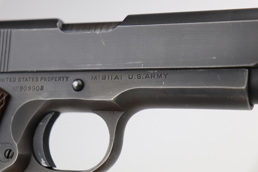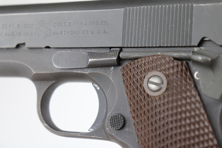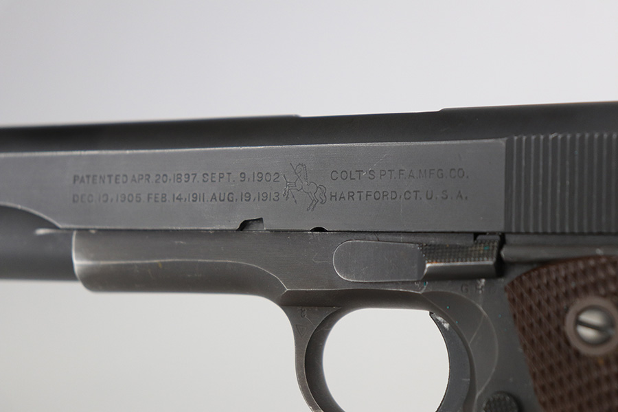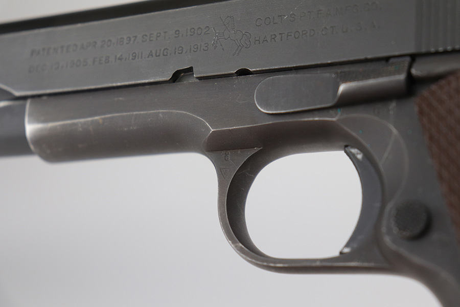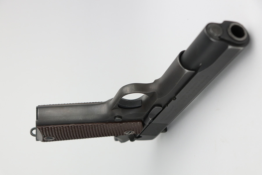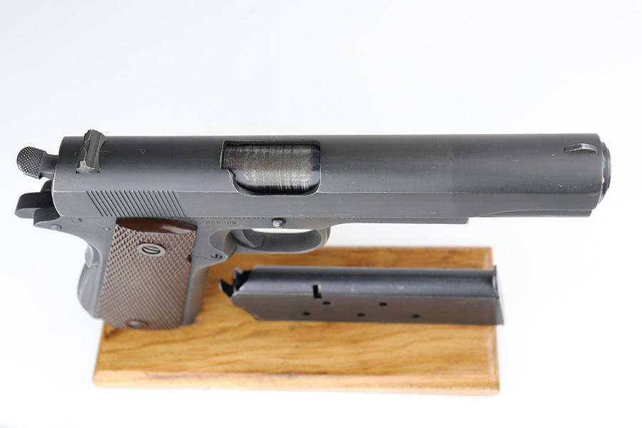 5/4/23 – This is a very nice example of an original Colt 1911A1 rig from 1943. The pistol is all original with matching numbered slide and frame. Correct inspection proofs on slide and frame, and proper Colt barrel with ‘G’ under lug. Original parkerized finish shows standard high edge wear from the holster, and a bit of general dulling of the front strap. Excellent grips and strong bore. Magazine is marked ‘R’ on toe. The rig is complete with an excellent ’44 dated Boyt holster, as well as a canvas belt and mag pouch.