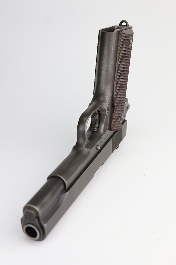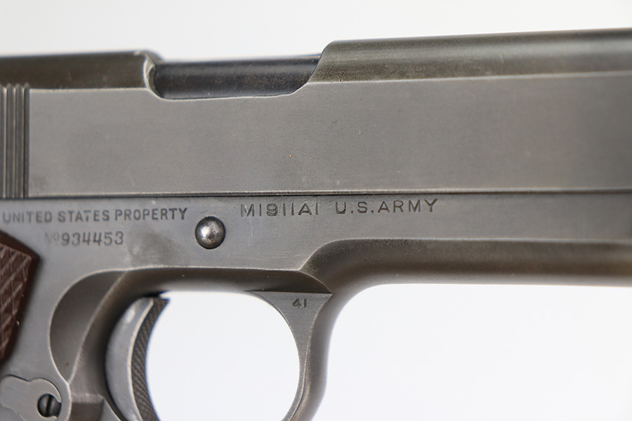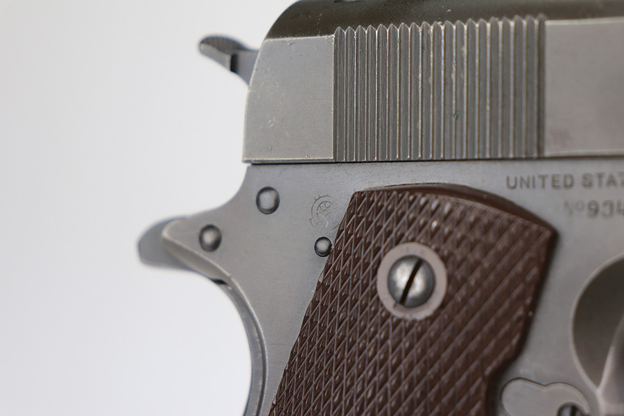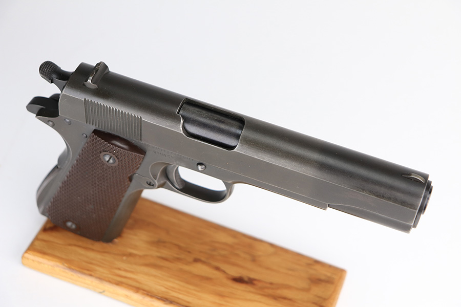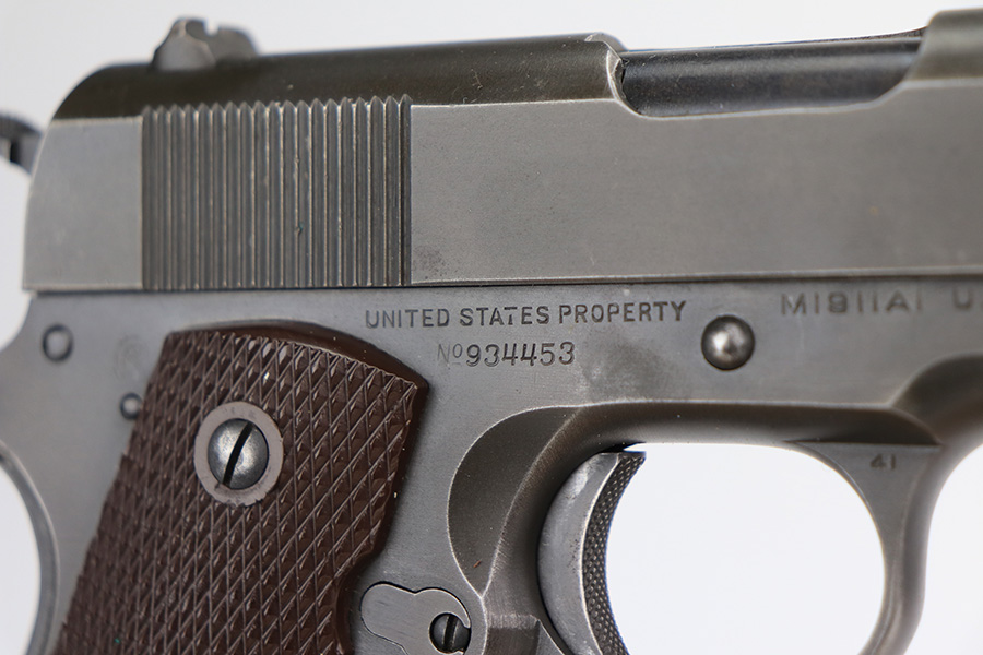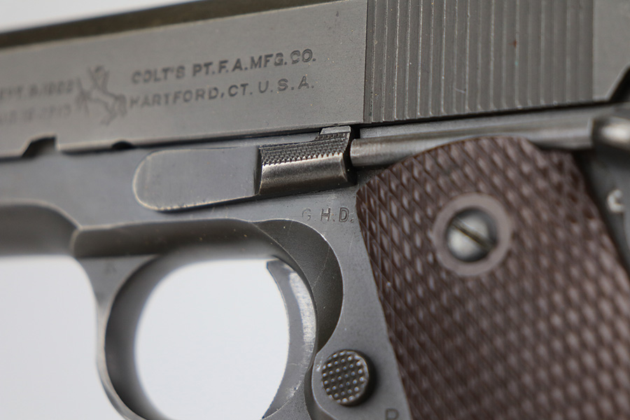 2/24/22 – This is an excellent example of a Colt Model 1911A1 issued to the US military in 1943. The slide is numbered and matching to the frame. The gun has the proper cross-canon military cartouche, “G.H.D.” inspector initials, and is “United States Property” marking on the right side of the frame. It has a period-correct Colt .45 Auto barrel with a large “G” under the lug. This gun is excellent, retaining about 96-97% of its original finish. There is just some very minor wear concentrated around the high edges in general and very minor thinning on the front strap. There is a series of tiny dings at the back left of the slide. Comes with excellent period-correct grips a proper “L” marked magazine. The bore is near-mint.
