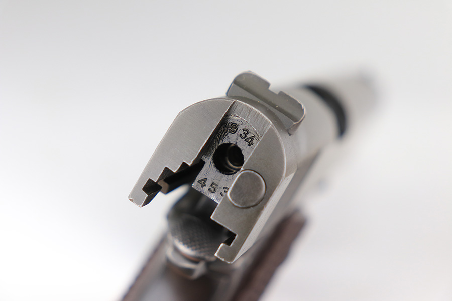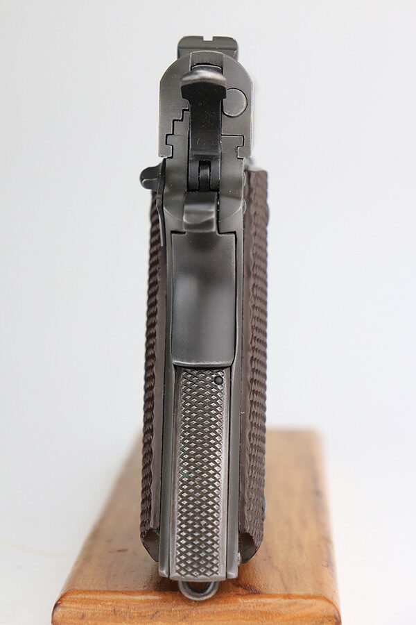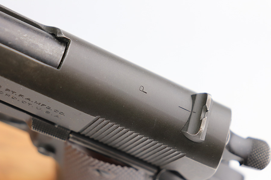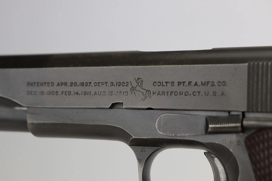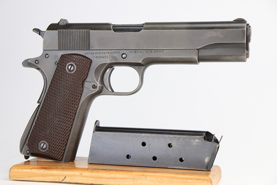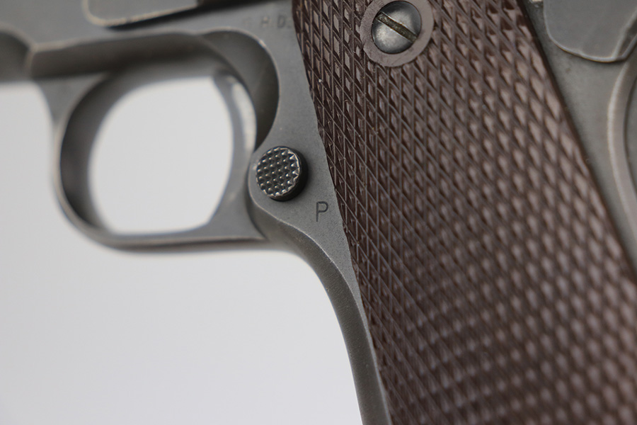 2/24/22 – This is an excellent example of a Colt Model 1911A1 issued to the US military in 1943. The slide is numbered and matching to the frame. The gun has the proper cross-canon military cartouche, “G.H.D.” inspector initials, and is “United States Property” marking on the right side of the frame. It has a period-correct Colt .45 Auto barrel with a large “G” under the lug. This gun is excellent, retaining about 96-97% of its original finish. There is just some very minor wear concentrated around the high edges in general and very minor thinning on the front strap. There is a series of tiny dings at the back left of the slide. Comes with excellent period-correct grips a proper “L” marked magazine. The bore is near-mint.