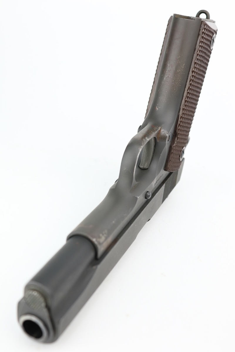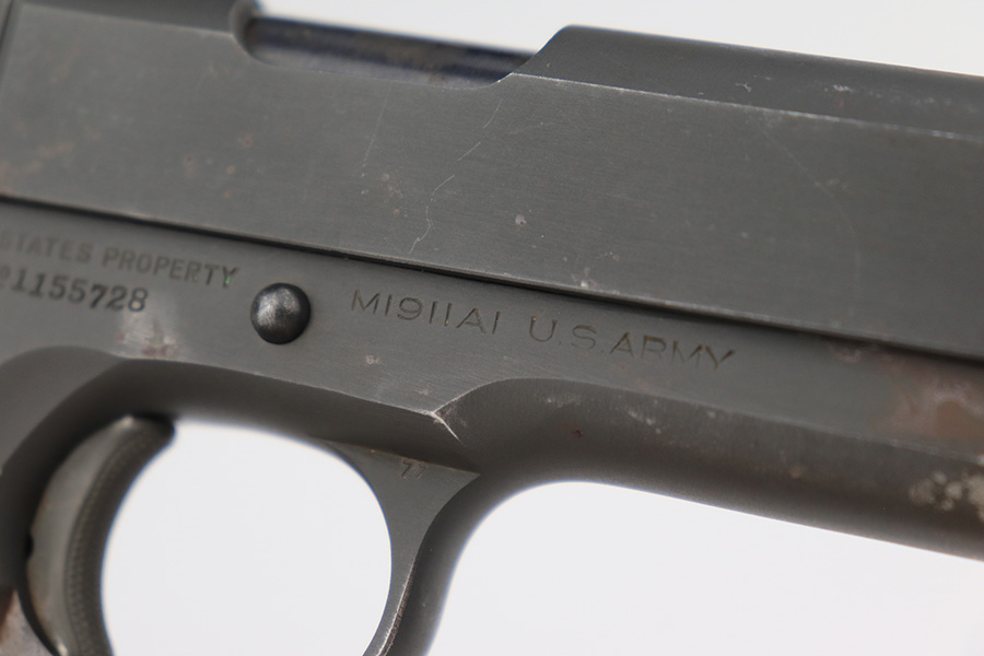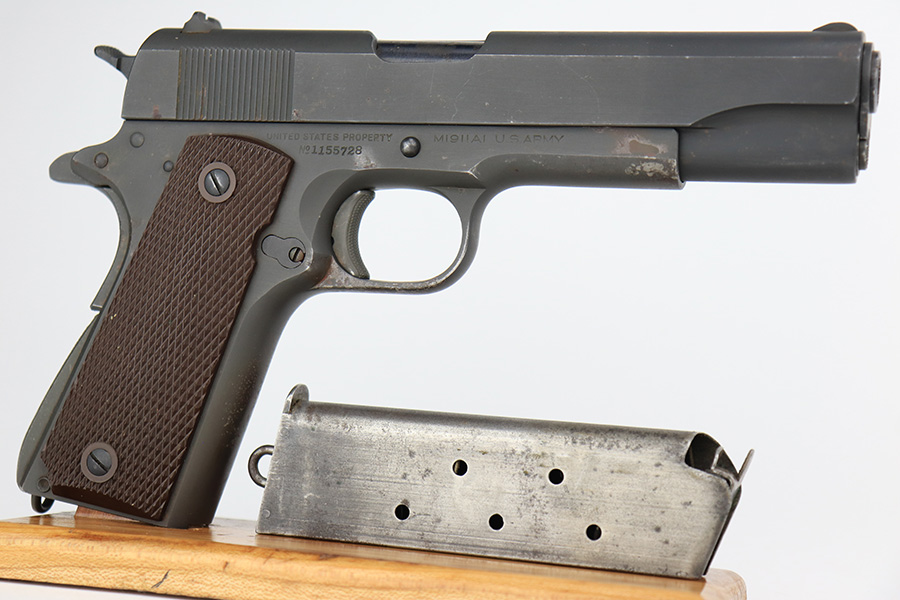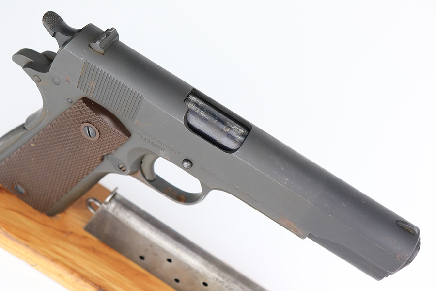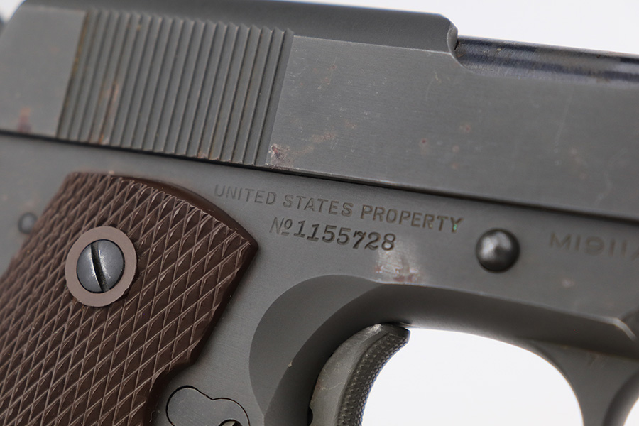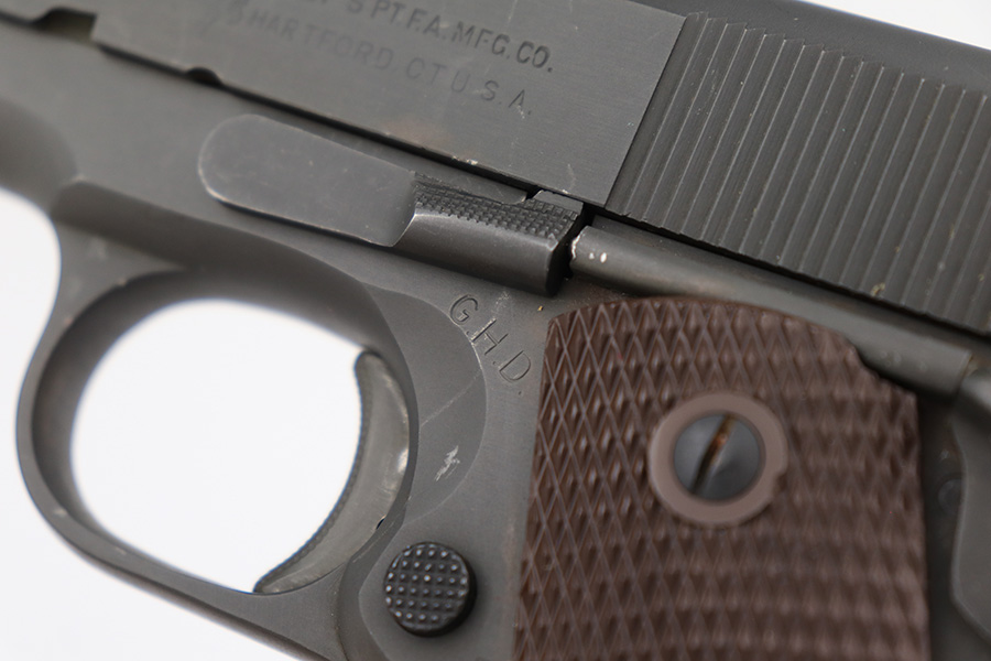 3/31/23 – This is an excellent example of a Colt 1911A1 issued to the US military in 1943. It is “United States Property” marked, has the correct “GHD” inspector initials, and has the proper cross-canon military cartouche on the right side of the tang. It also has a correct Colt barrel with a small “F” under the lug. The gun has retained about 96% of its original finish. There is not much actual finish loss, but there are areas of splotchy discoloration around the front edge of the frame, on the trigger guard, on the front strap, and a few small dots along the slide. Excellent period-correct reddish bakelite grips. Comes with an earlier two-tone magazine with a lanyard loop on the bottom. Mint bore.