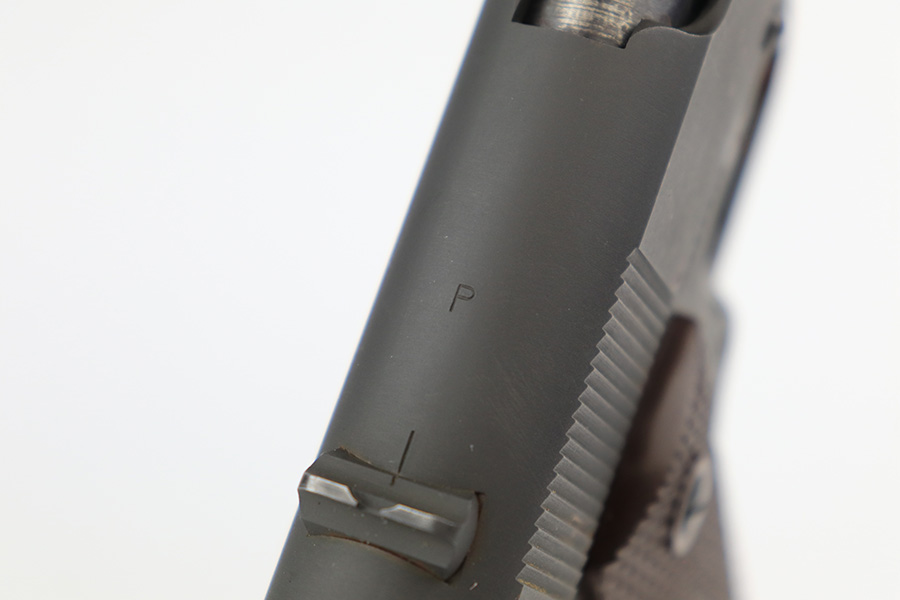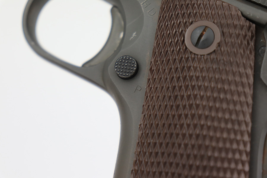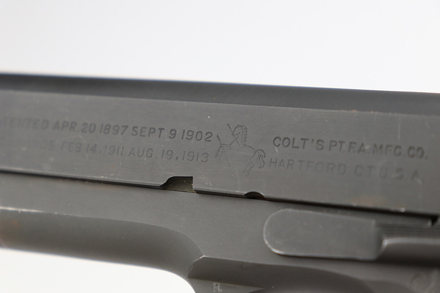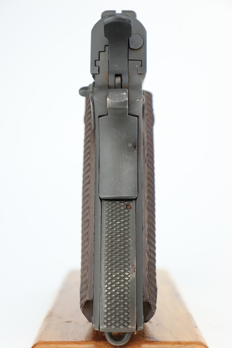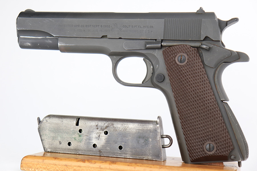 3/31/23 – This is an excellent example of a Colt 1911A1 issued to the US military in 1943. It is “United States Property” marked, has the correct “GHD” inspector initials, and has the proper cross-canon military cartouche on the right side of the tang. It also has a correct Colt barrel with a small “F” under the lug. The gun has retained about 96% of its original finish. There is not much actual finish loss, but there are areas of splotchy discoloration around the front edge of the frame, on the trigger guard, on the front strap, and a few small dots along the slide. Excellent period-correct reddish bakelite grips. Comes with an earlier two-tone magazine with a lanyard loop on the bottom. Mint bore.