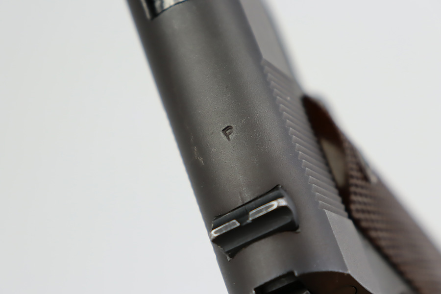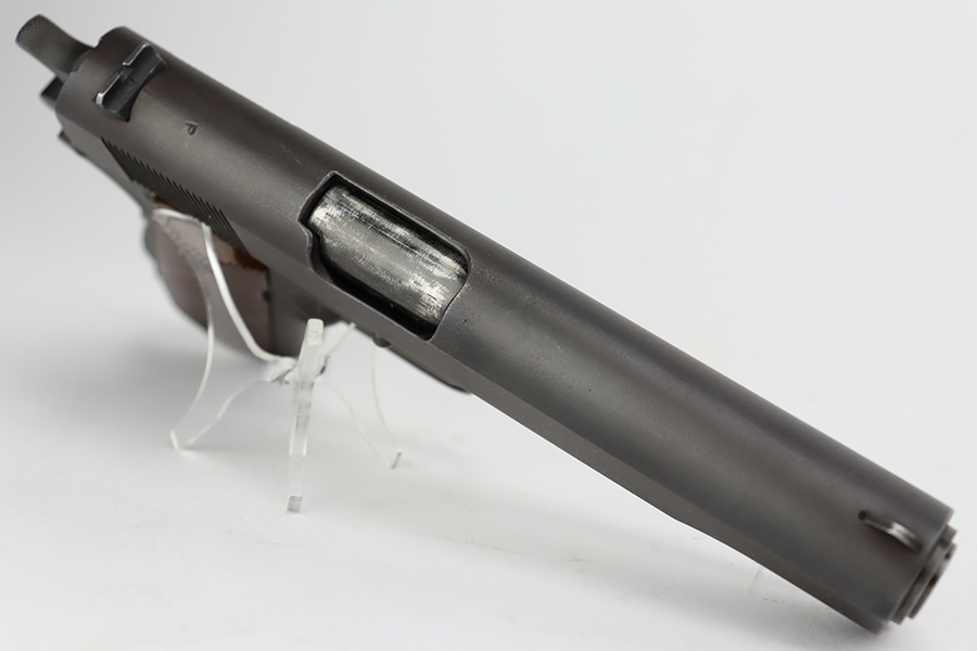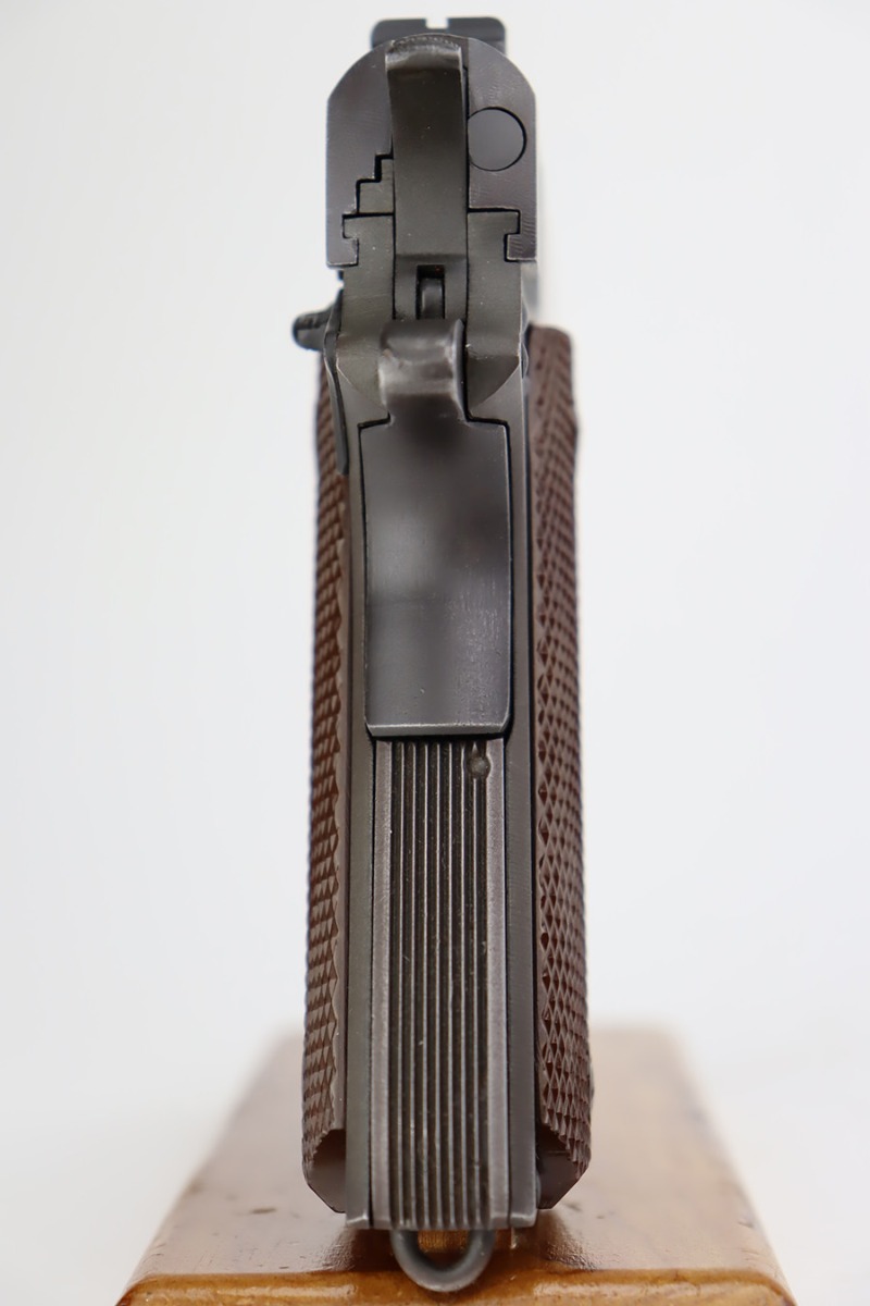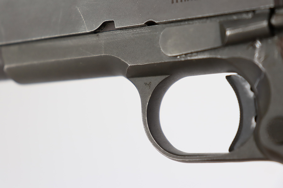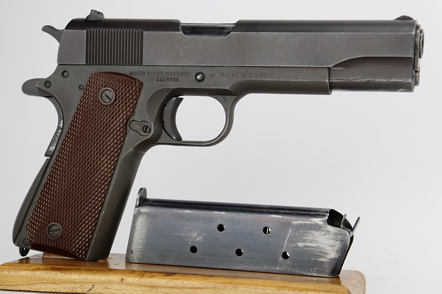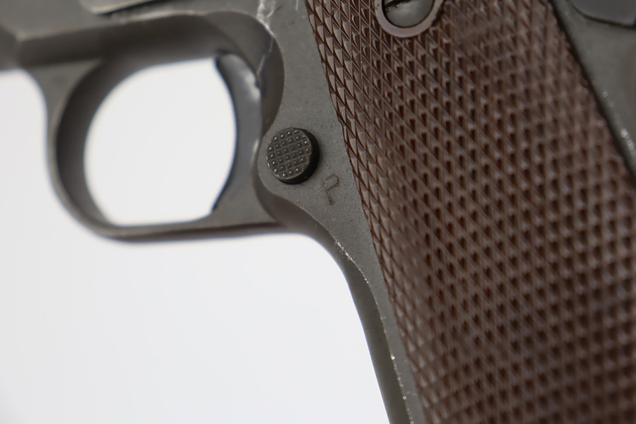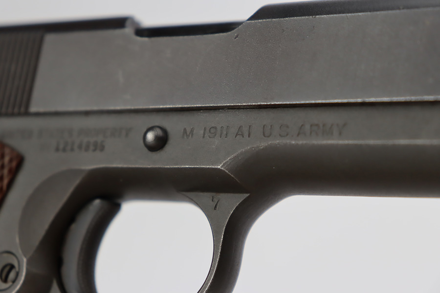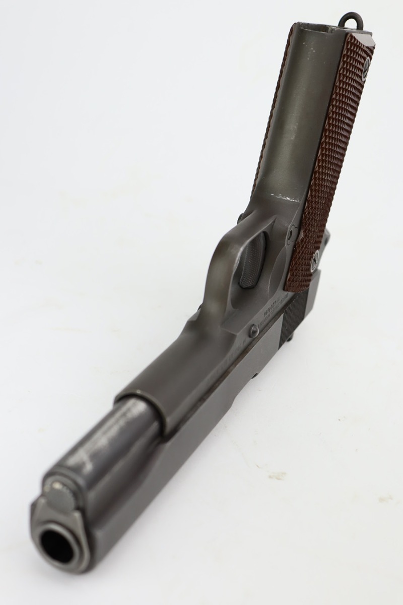 9/6/23 – This is an excellent example of an Ithaca Model 1911A1 issued to the US military in 1943. It is “United States Property” marked, has a cross-canon military cartouche, and has the proper “FJA” inspection initials. Correct “F” marked Flannery barrel. It has retained about 95-96% of its original parkerized finish. The majority of the wear is near the muzzle, on the underside of the slide. One light streak of wear on the front strap and some very light scratches/surface scuffs here and there. Fitted with period-correct reddish plastic grips and comes with one proper “S” marked magazine. Mint bore.
