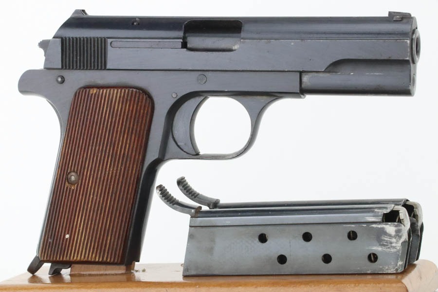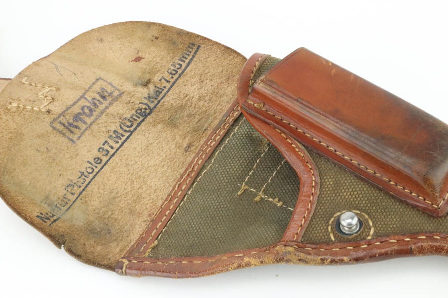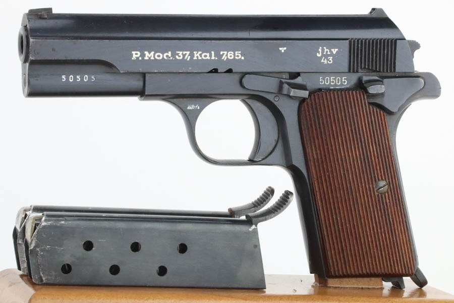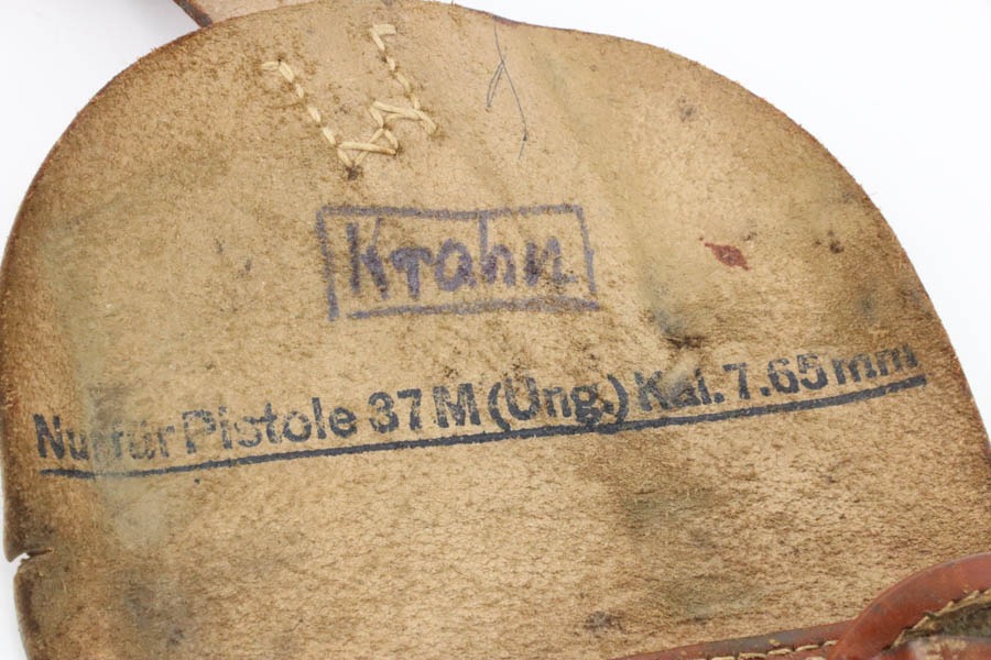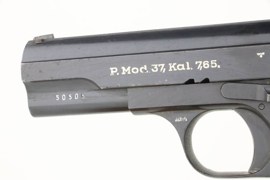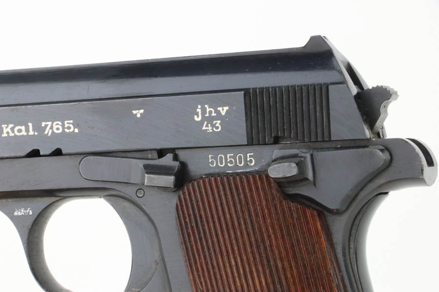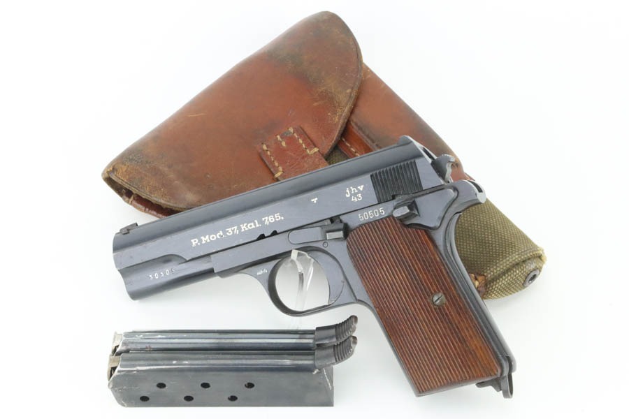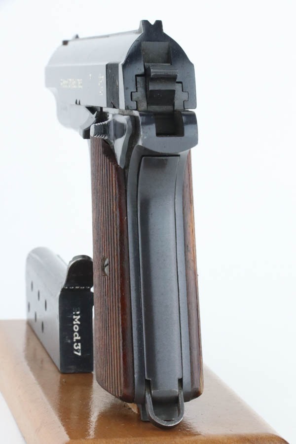 9/30/24 – This is an excellent example of a Femaru Model 37 issued to the Luftwaffe in 1943. All matching with the proper waffen military acceptance proof on the trigger guard. It comes as a rig with one original matching-numbered magazine, one un-numbered Hungarian magazine, and a very nice 1941-dated and “Eagle L2” Luftwaffe proofed holster (very clear ink stamp on the inside). The gun itself has retained nearly all of its original finish, but there is very light freckling on the slide and on the grip straps. Fitted with excellent wood grips. Mint bore.