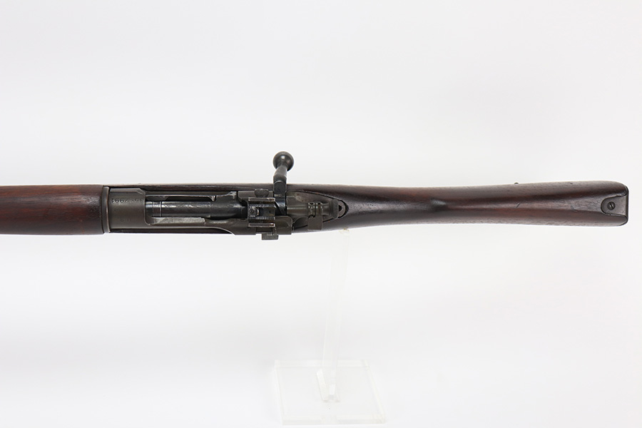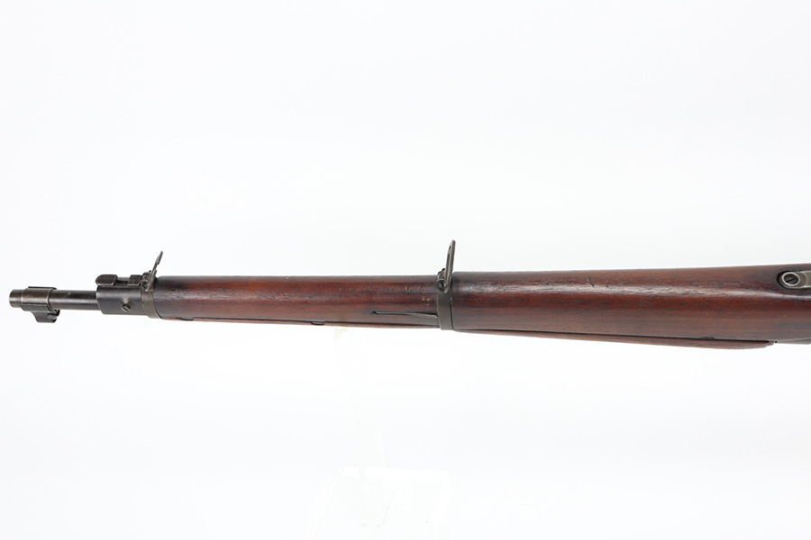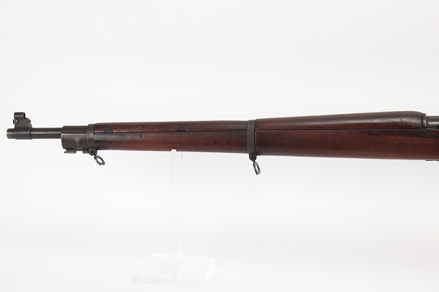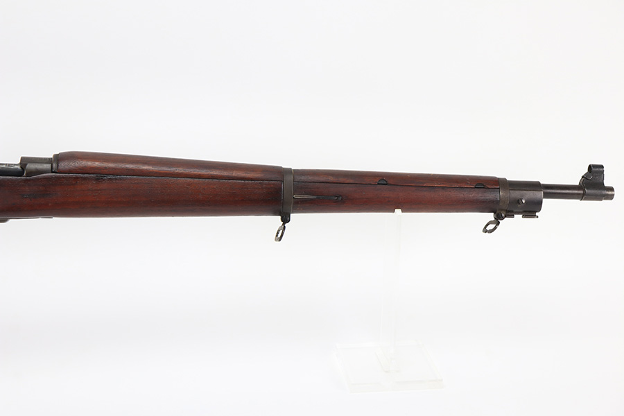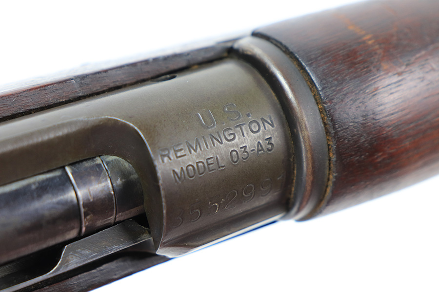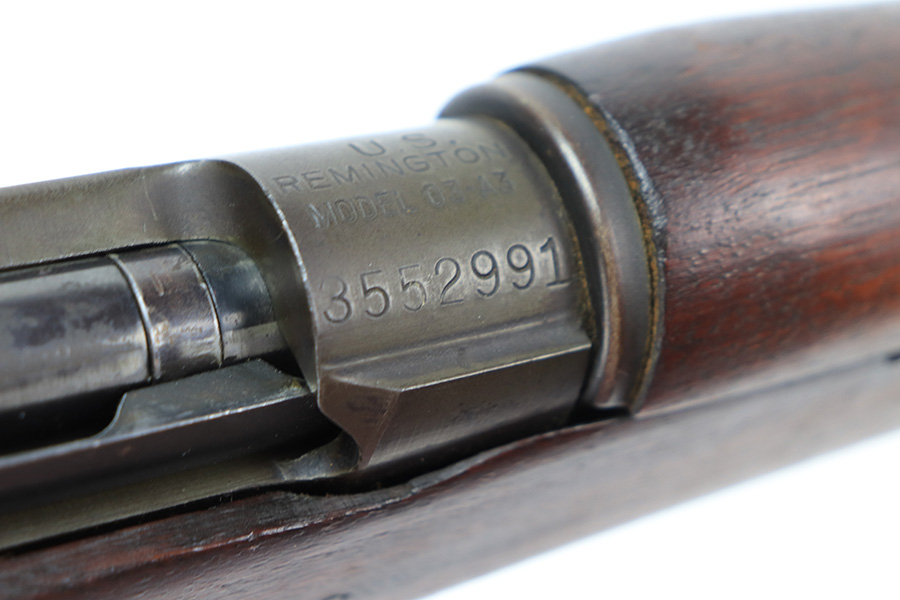3/1/22 – This is an excellent example of a Remington Model 03-A3 issued to the US military in April of 1943. It has a Remington barrel dated March of 1943. The bolt is also marked Remington. The stock has no visible markings, so it was either replaced or sanded. Overall, the gun is in excellent condition. There is very minor thinning on the barrel, some splotchy discoloration on the front barrel band, and a few dots of dark discoloration on the receiver. The stock is minty with a few very minor dings and bruises. The bore has strong rifling, but there are tiny pits throughout. Comes with a period-correct front sight hood.