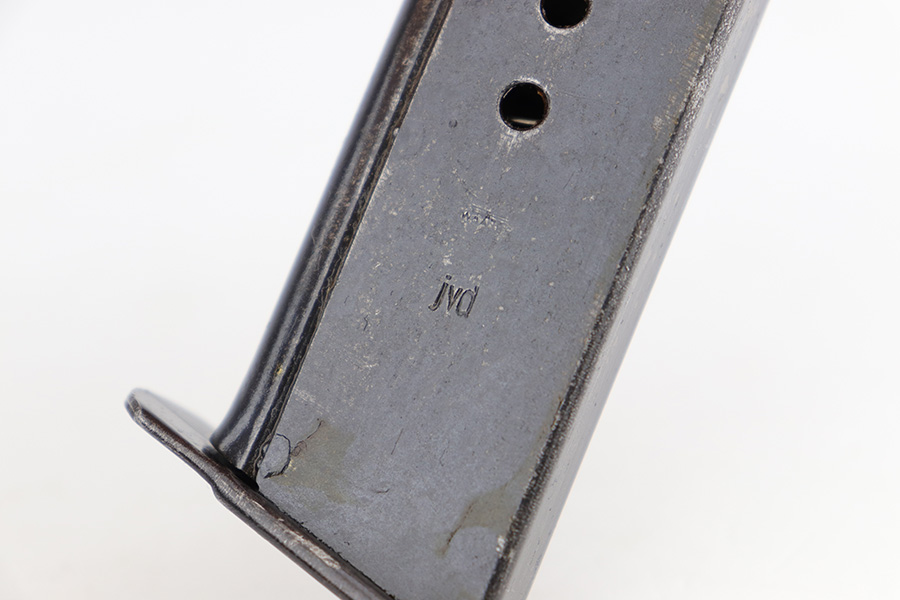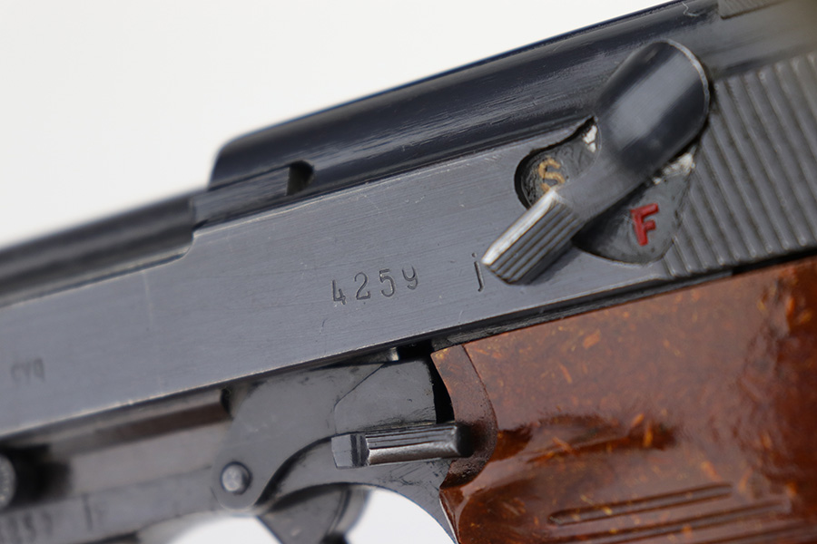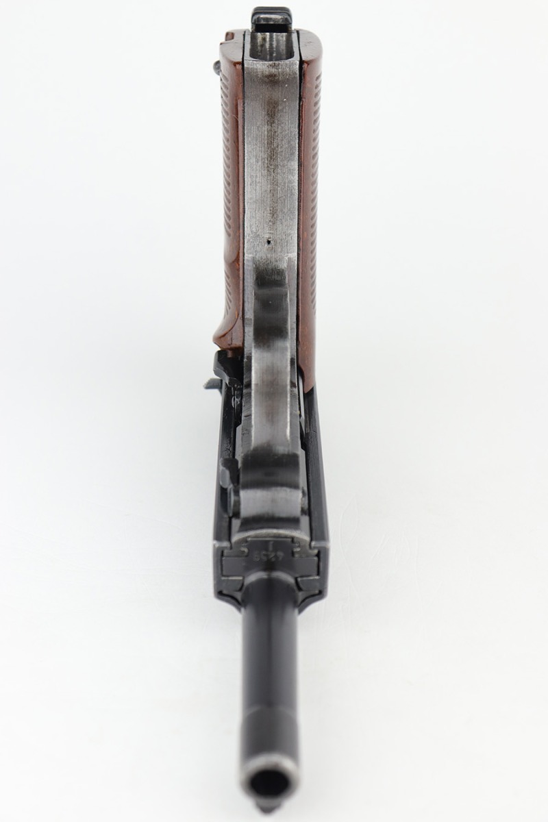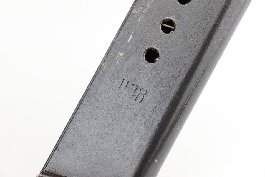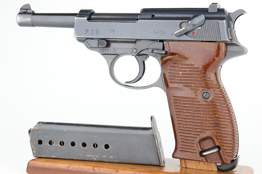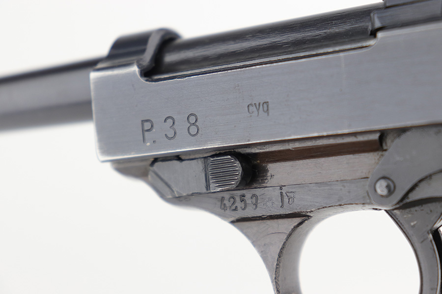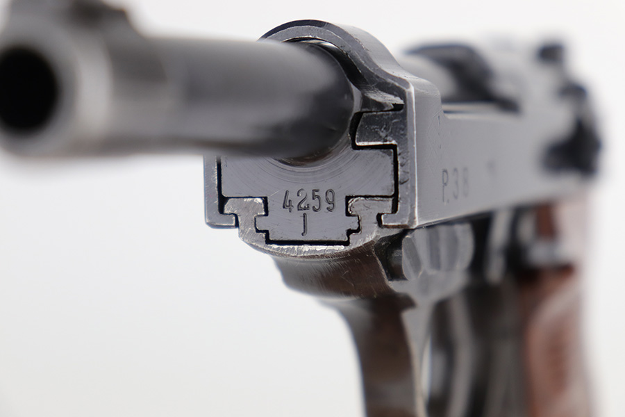 1/13/23 – This is a minty example of a Spreewerk P.38 issued to the Nazi military in November of 1943. It is all matching and has the proper “Eagle 88” military acceptance proofs throughout. There is an “asterisk” marking on the left side of the frame, indicating it failed initial inspection and then repaired at the factory. It has retained around 95% of its finish. Almost all of the wear is on the front strap, but there is also some minor muzzle wear. Fitted with excellent reddish bakelite grips and comes with a period-correct jvd magazine. Factory-new bore. De-cocker is functional.