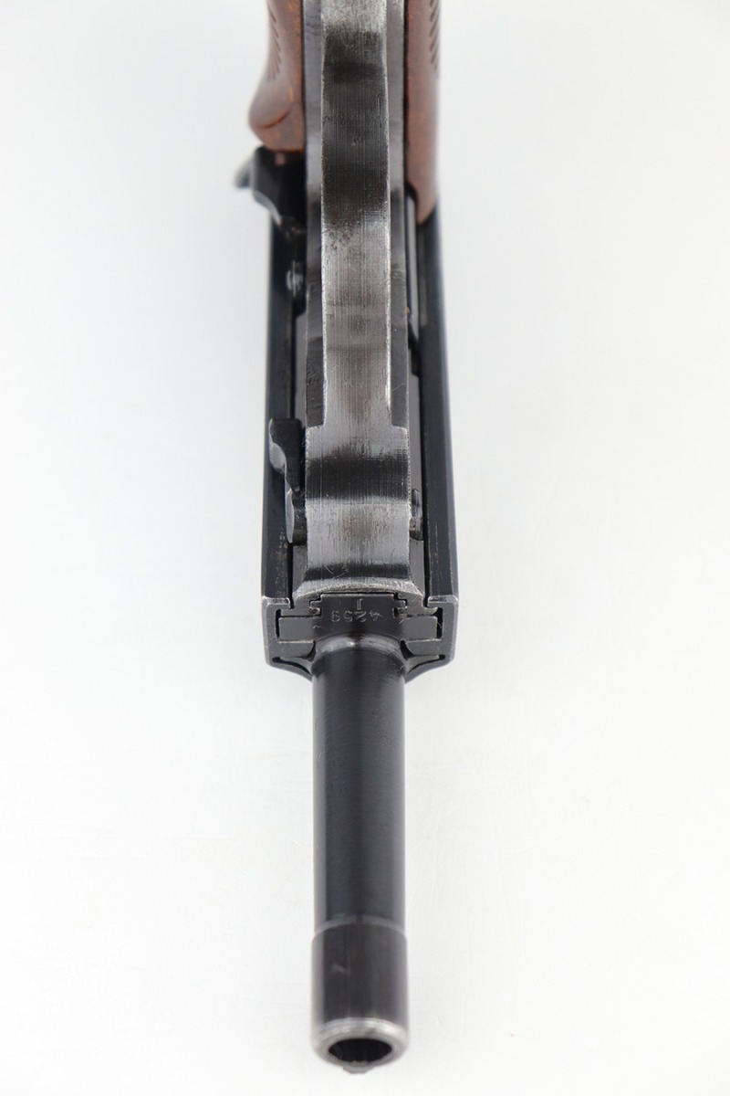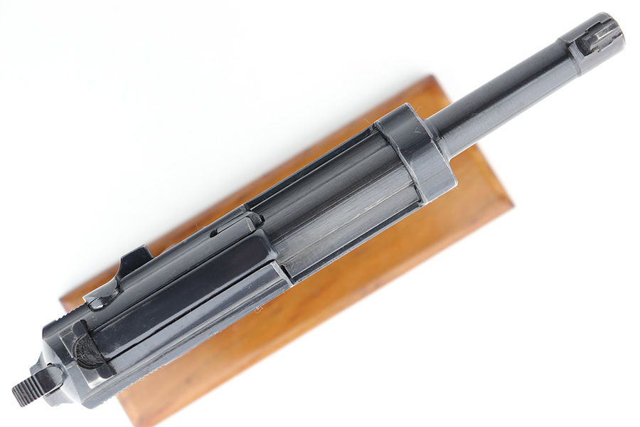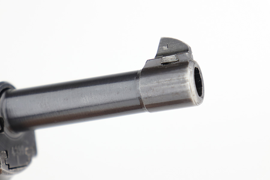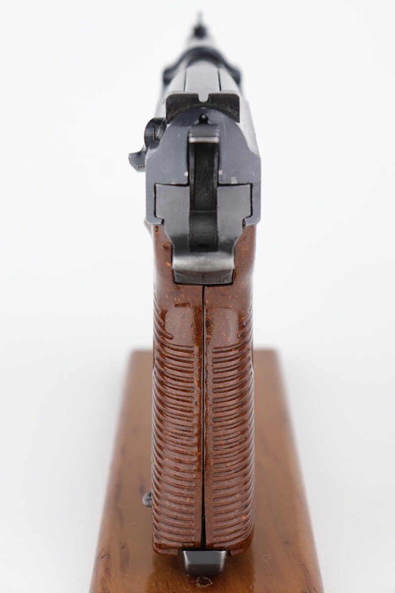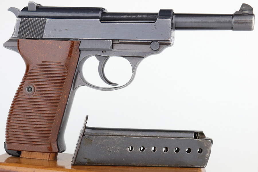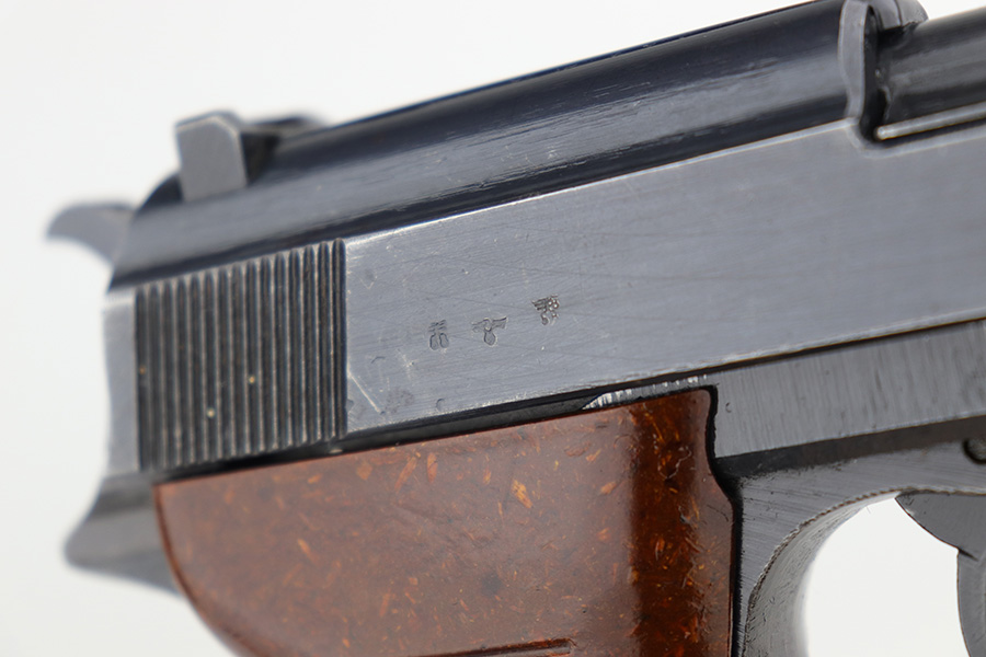 1/13/23 – This is a minty example of a Spreewerk P.38 issued to the Nazi military in November of 1943. It is all matching and has the proper “Eagle 88” military acceptance proofs throughout. There is an “asterisk” marking on the left side of the frame, indicating it failed initial inspection and then repaired at the factory. It has retained around 95% of its finish. Almost all of the wear is on the front strap, but there is also some minor muzzle wear. Fitted with excellent reddish bakelite grips and comes with a period-correct jvd magazine. Factory-new bore. De-cocker is functional.