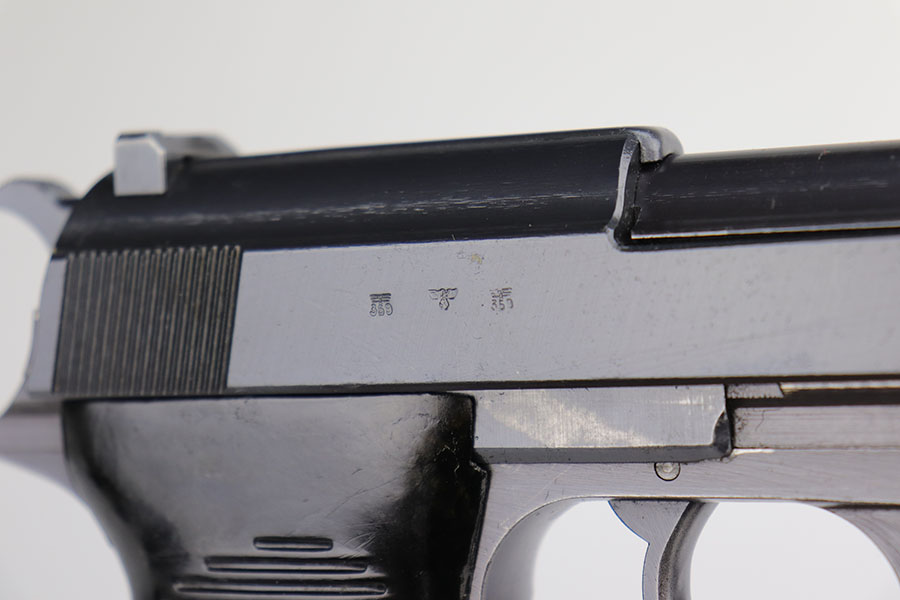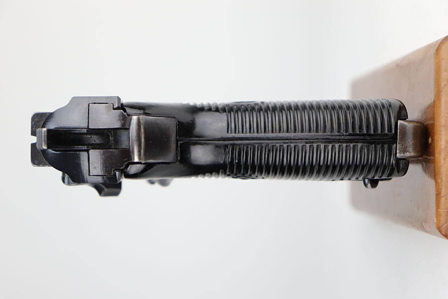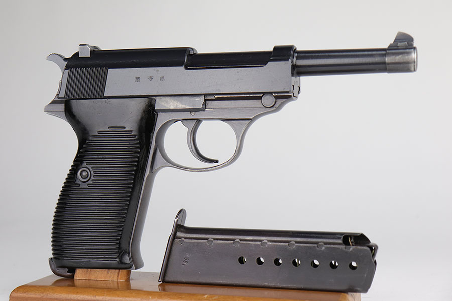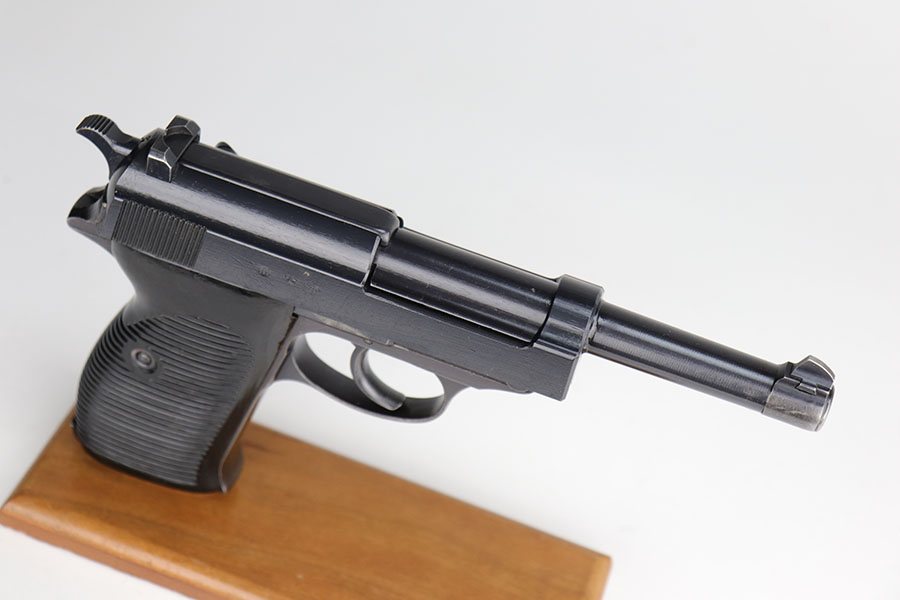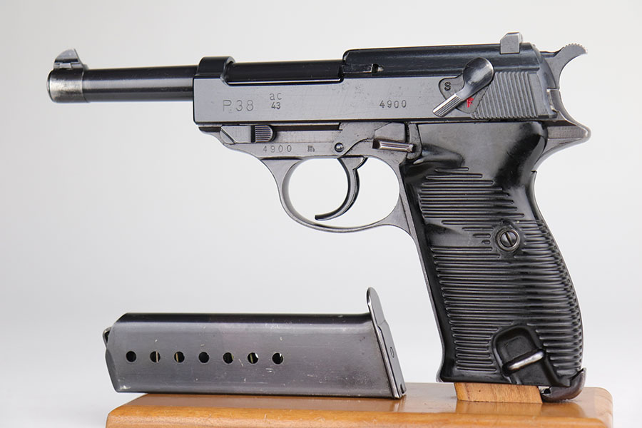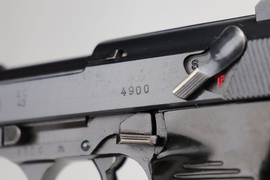 9/22/20 – This is an excellent, all matching Walther P.38 with cool serial number (4900). The pistol was made in January of 1943 and has about 96-97% of the original blue remaining. There’s muzzle wear on both sides of the barrel, and a bit of thinning and oxidation on the front strap. Good mechanics, including de-cocker. Walther magazine. Nice black grips. Strong, shiny bore.