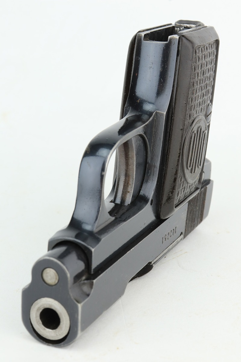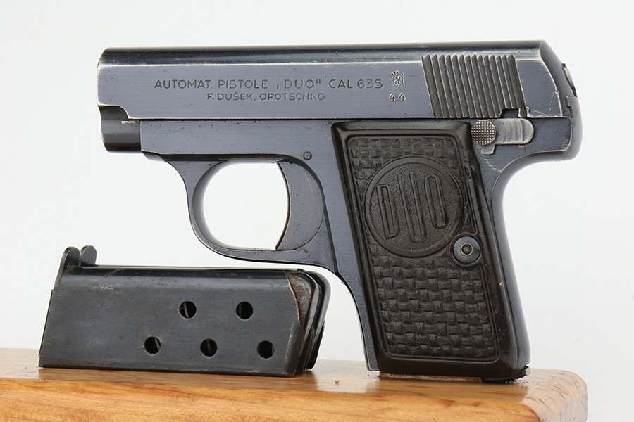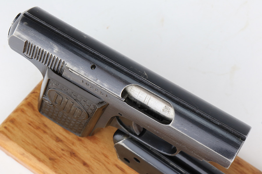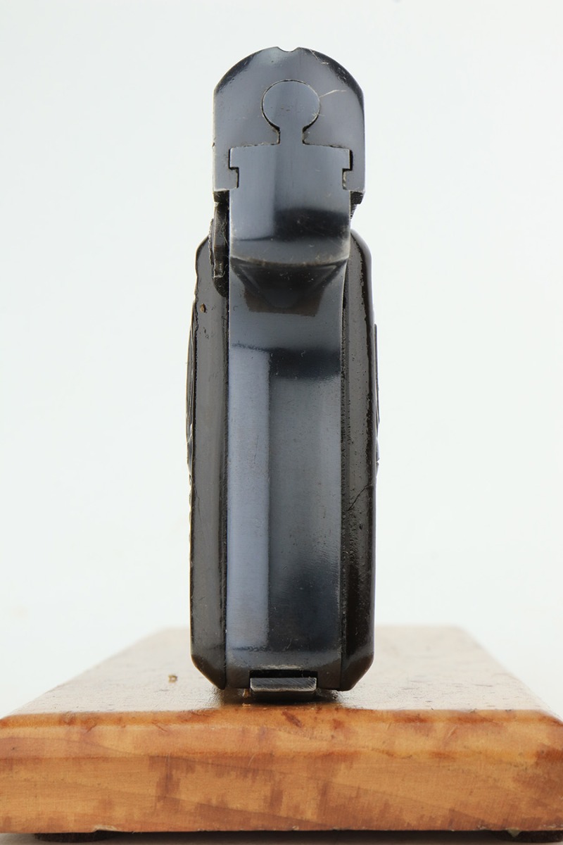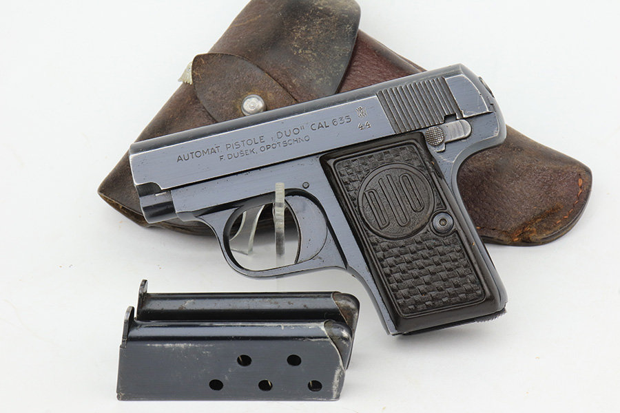1/26/23 – This is an excellent example of a Czech Duo pistol manufactured in 1944 and chambered in 6.35mm or .25 ACP. It is all matching and has the proper Czech Lion proofs. It comes as a rig with a nice un-marked brown leather holster (with an embellishment on the top flap) and two period-correct magazines. It has retained about 96% of its original bluing with very minor wear around the muzzle and along the slide, concentrated mostly around the high edges. Fitted with excellent period-correct bakelite grips. Minty bore.