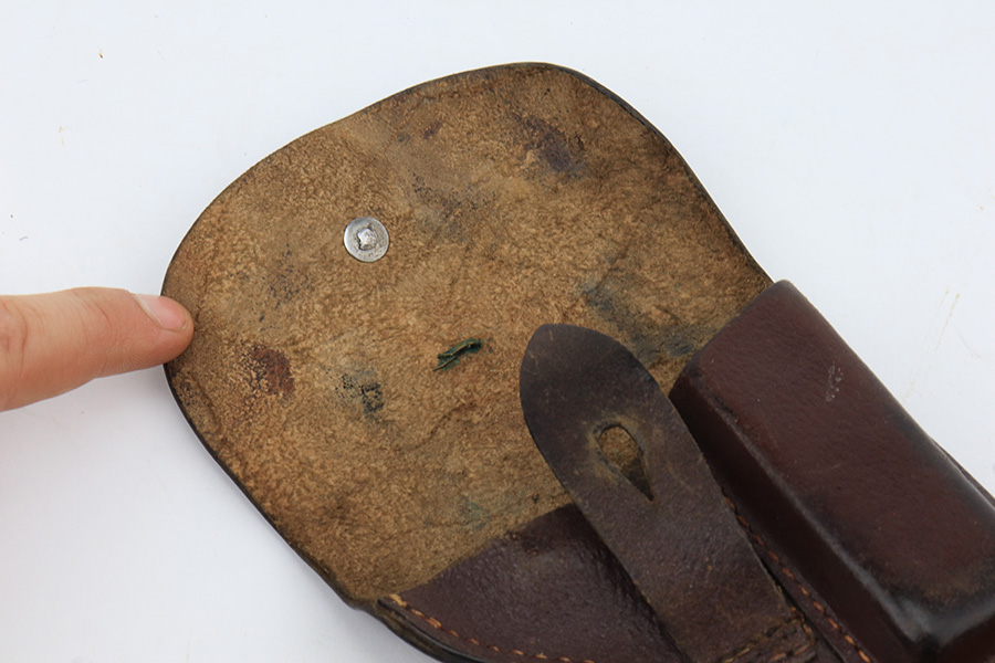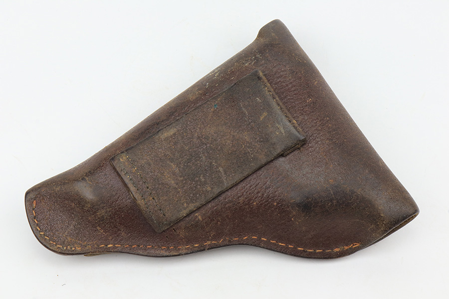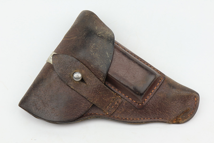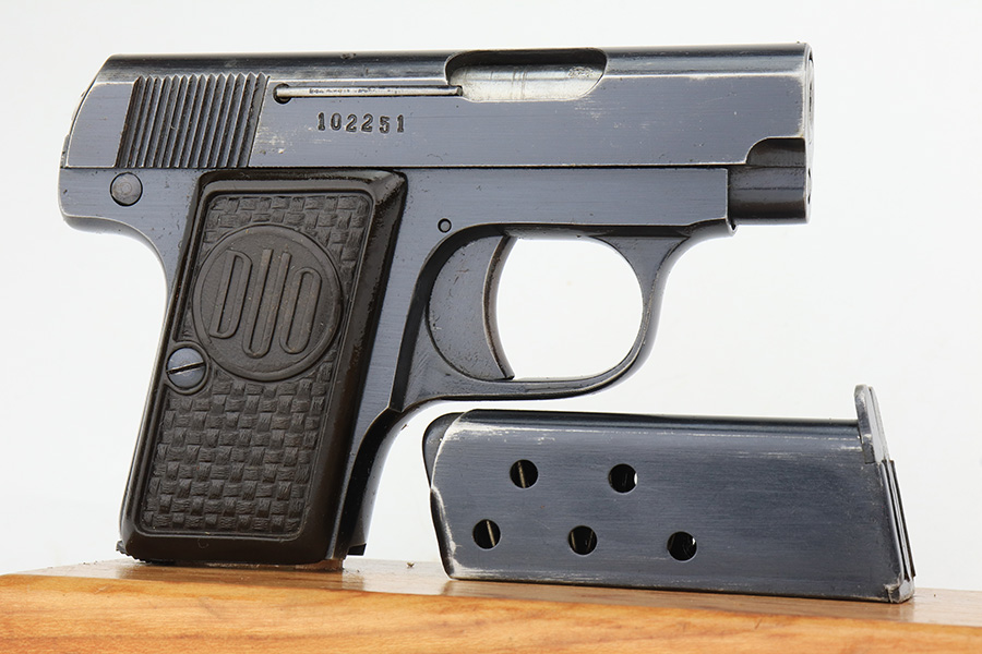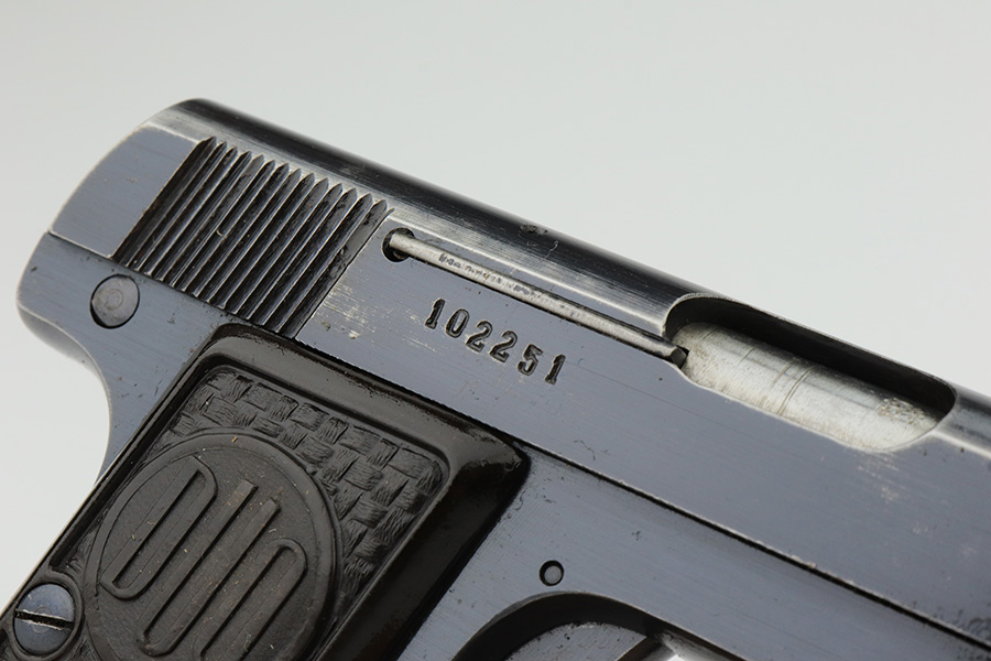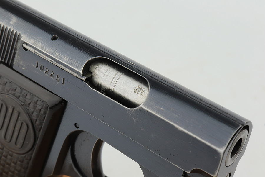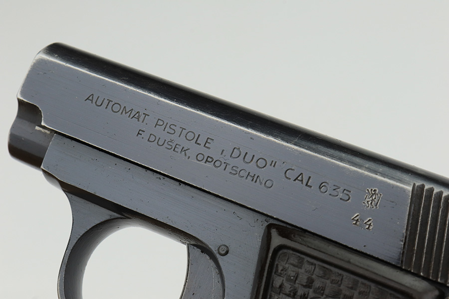 1/26/23 – This is an excellent example of a Czech Duo pistol manufactured in 1944 and chambered in 6.35mm or .25 ACP. It is all matching and has the proper Czech Lion proofs. It comes as a rig with a nice un-marked brown leather holster (with an embellishment on the top flap) and two period-correct magazines. It has retained about 96% of its original bluing with very minor wear around the muzzle and along the slide, concentrated mostly around the high edges. Fitted with excellent period-correct bakelite grips. Minty bore.