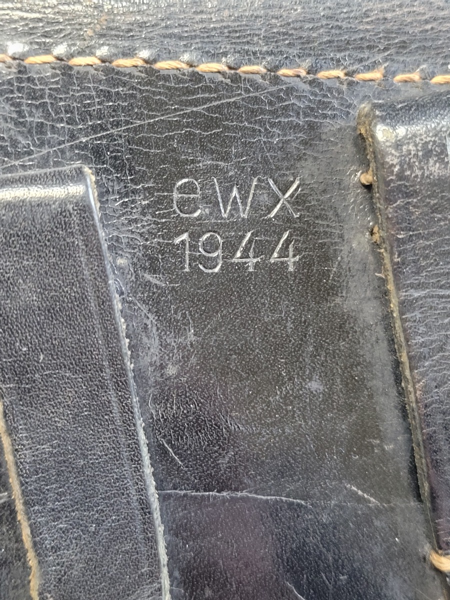4/21/21 – This is a rare variation hardshell 1944 P.38 holster. The holster is desirable due to scarcity as well as condition. The leather is strong and excellent with some mild surface wear but no significant damage. Crisply stamped on the back leather with maker and date stamps. The interior leather has a waffen eagle ink stamp, which is fairly uncommon as well. The original stitching is excellent and completely intact.