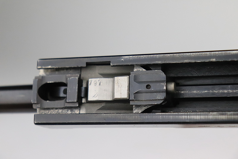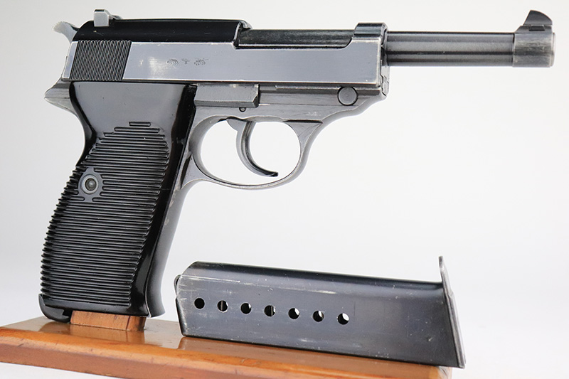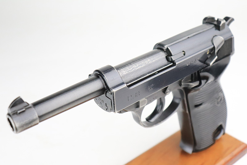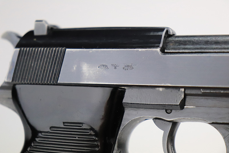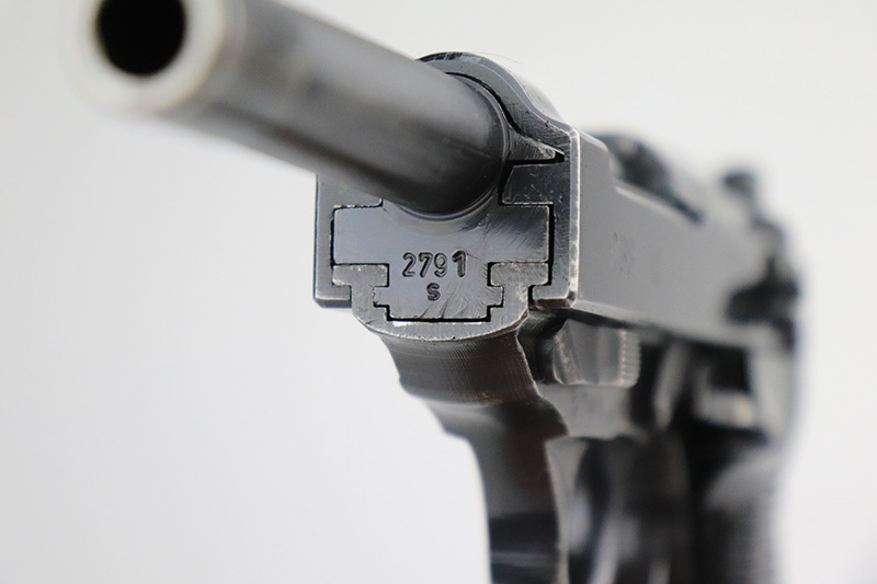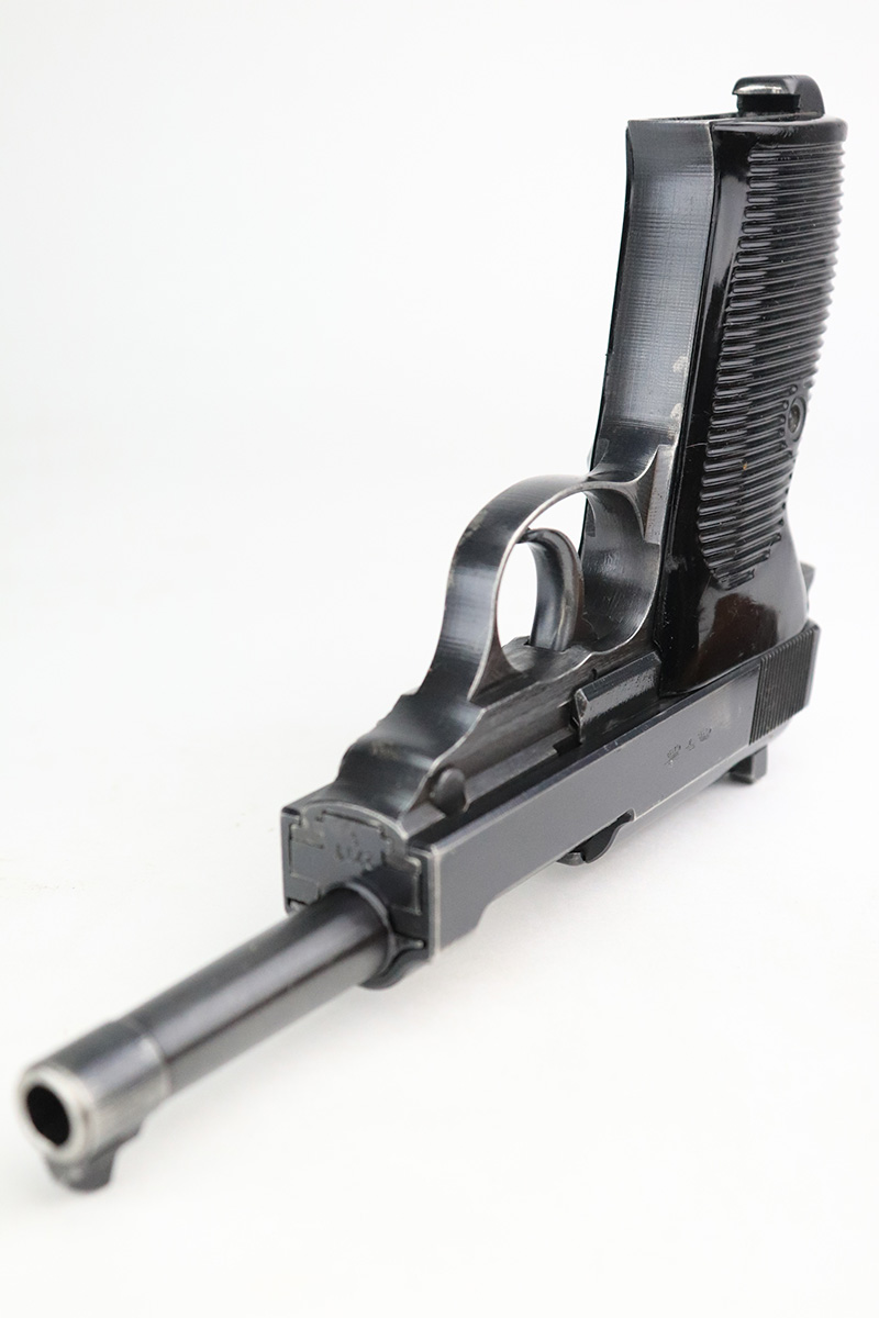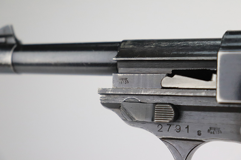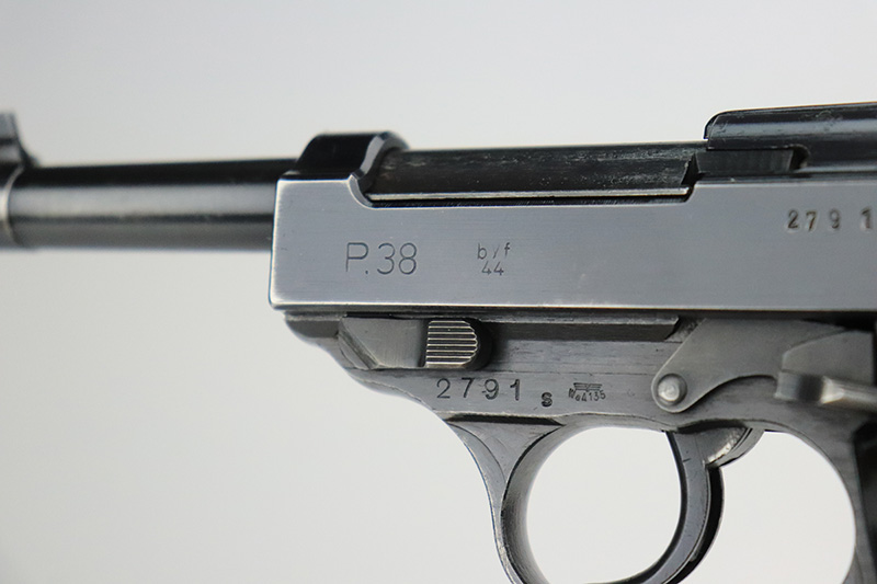 9/19/22 – This is an excellent example of a BYF 44 Mauser P.38 issued to the Nazi military in 1944. It is all matching and has the proper “Waffen 135” military acceptance proofs. It has retained about 95% of its original finish. There is minor thinning along the barrel, muzzle wear, and very minor wear on the high edges of the slide. One small area of minor wear on the right side of the slide. A few small spots of wear on the underside of the trigger guard and on the front strap. Comes with nice black plastic grips and a “jvd” magazine. Excellent bore with strong rifling. De-cocker is functional.