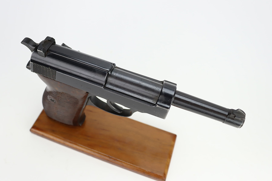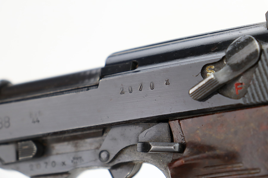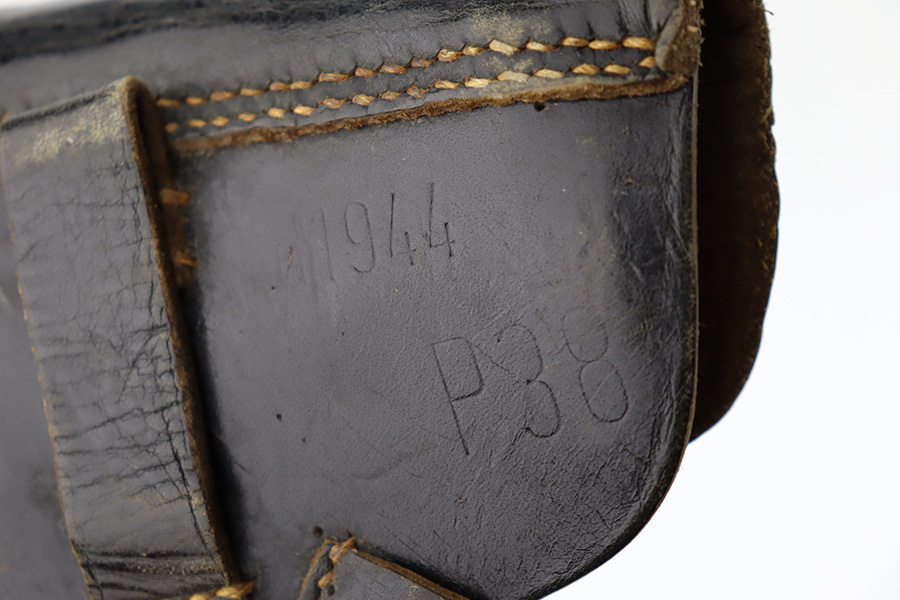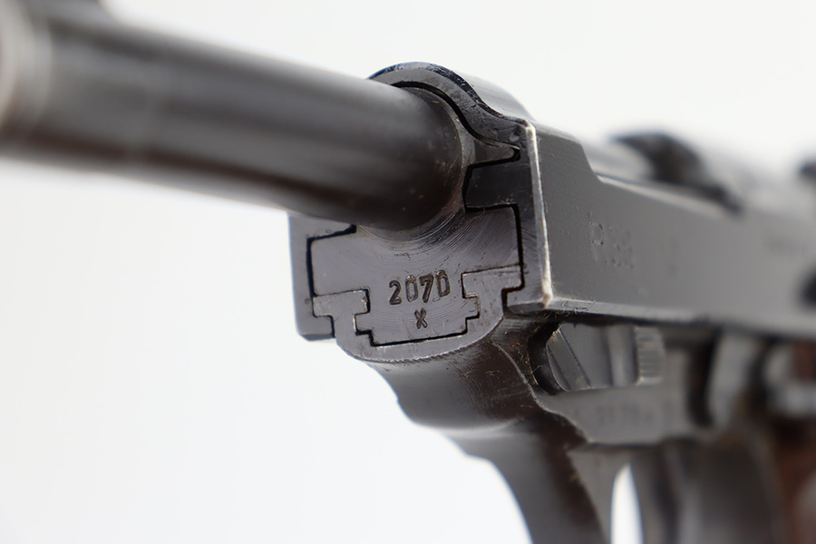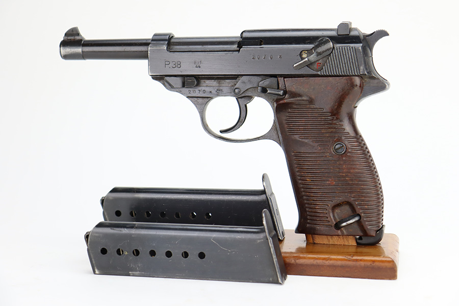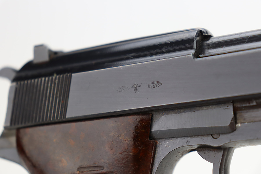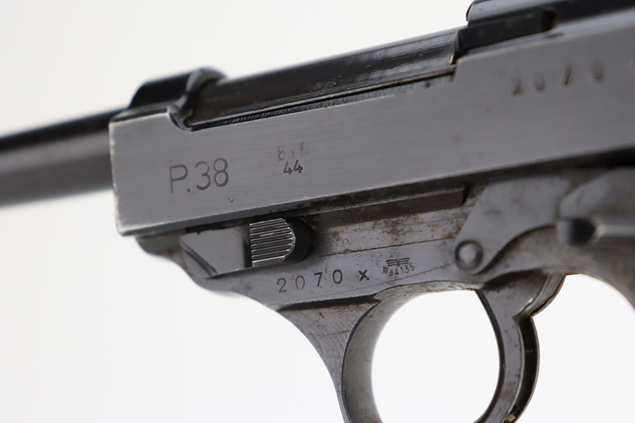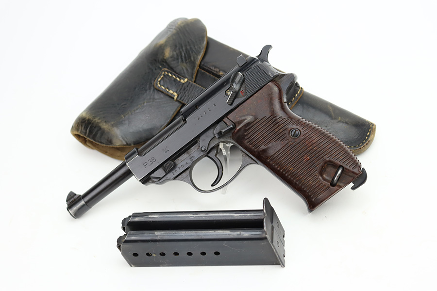 12/1/23 – This is an excellent example of a BYF 44 Mauser P.38 issued to the German military in 1944. It is all matching and has the proper “Waffen 135” military acceptance proofs. It comes as a rig with a nice 1944-dated soft shell holster and two “Waffen 135” marked magazines. The gun itself has retained about 97% of its original finish with hints of wear around the muzzle and on the front edges of the slide. Fitted with excellent reddish bakelite grips. The bore is very shiny with great rifling, but there is an area of spotty oxidation about halfway down. De-cocker is functional.