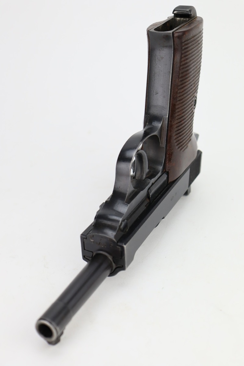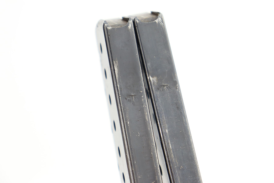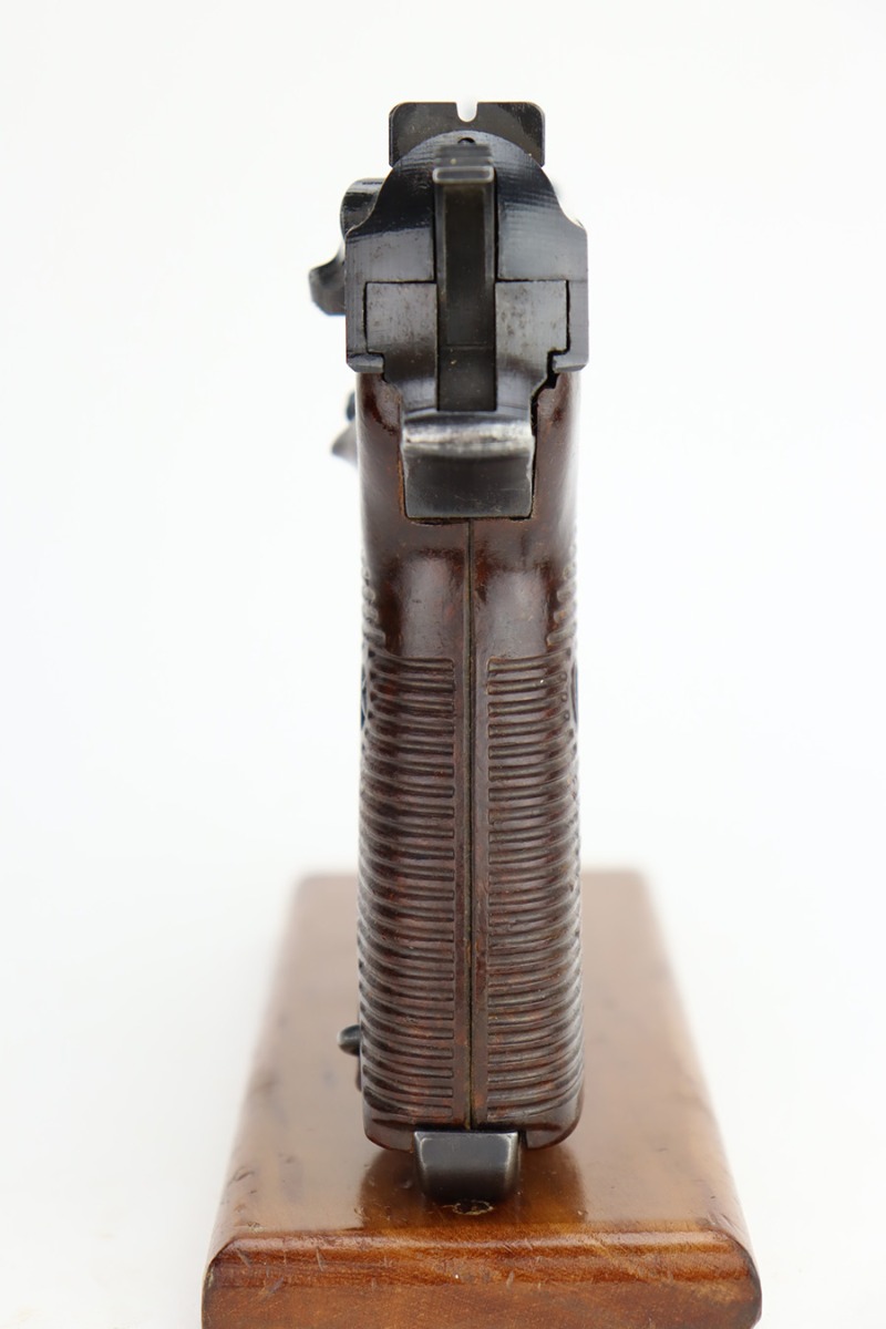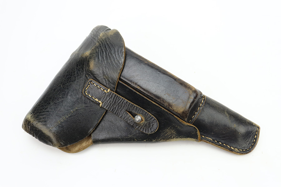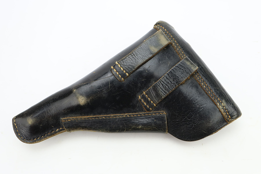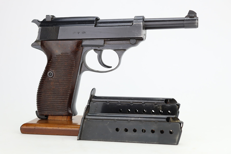 12/1/23 – This is an excellent example of a BYF 44 Mauser P.38 issued to the German military in 1944. It is all matching and has the proper “Waffen 135” military acceptance proofs. It comes as a rig with a nice 1944-dated soft shell holster and two “Waffen 135” marked magazines. The gun itself has retained about 97% of its original finish with hints of wear around the muzzle and on the front edges of the slide. Fitted with excellent reddish bakelite grips. The bore is very shiny with great rifling, but there is an area of spotty oxidation about halfway down. De-cocker is functional.