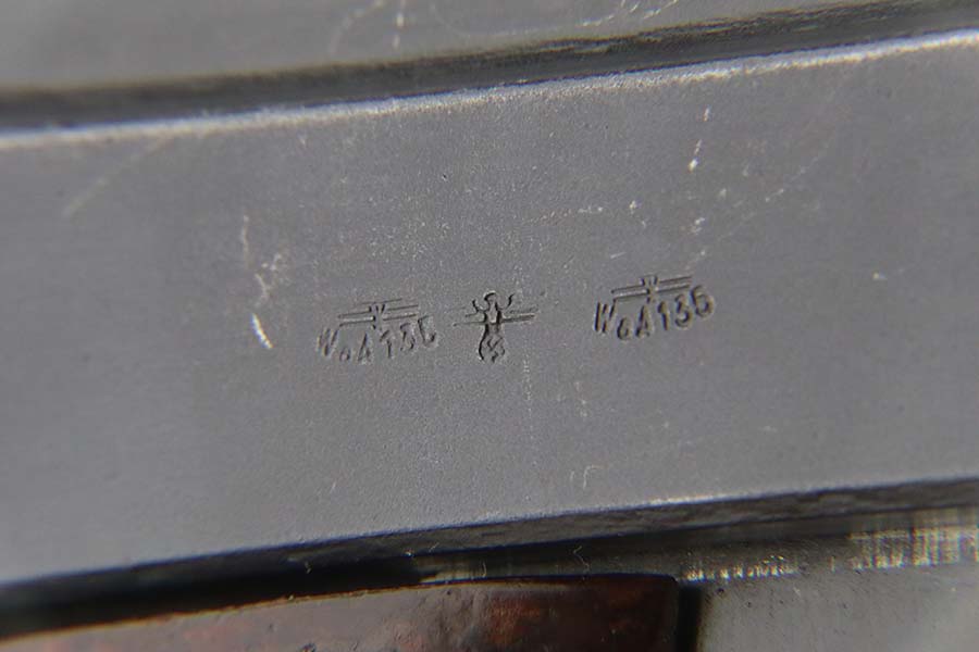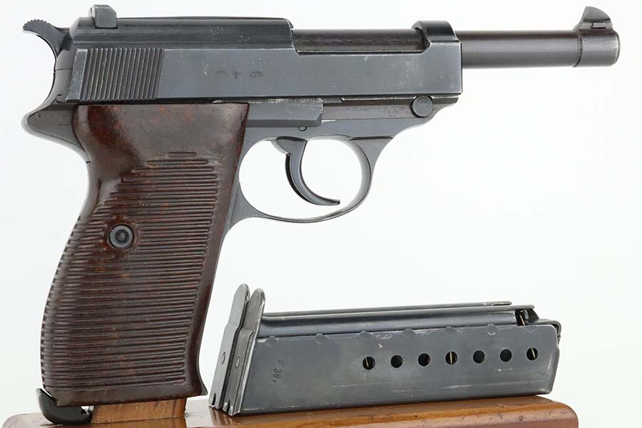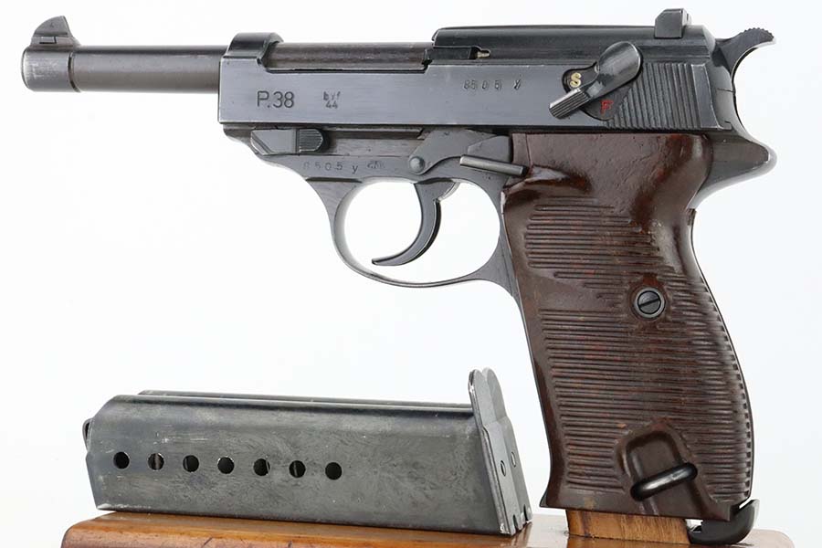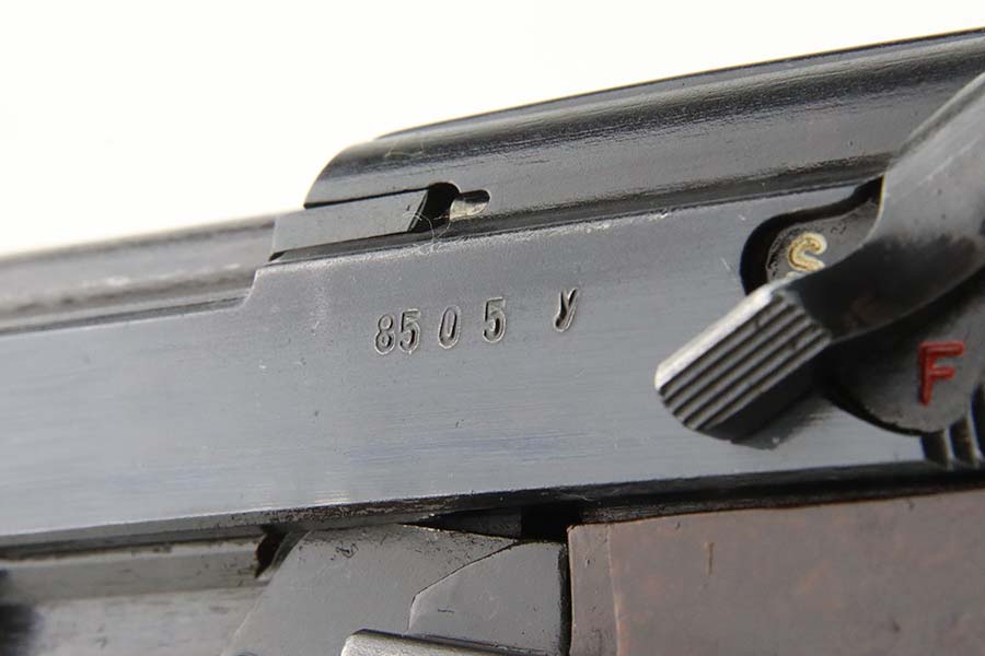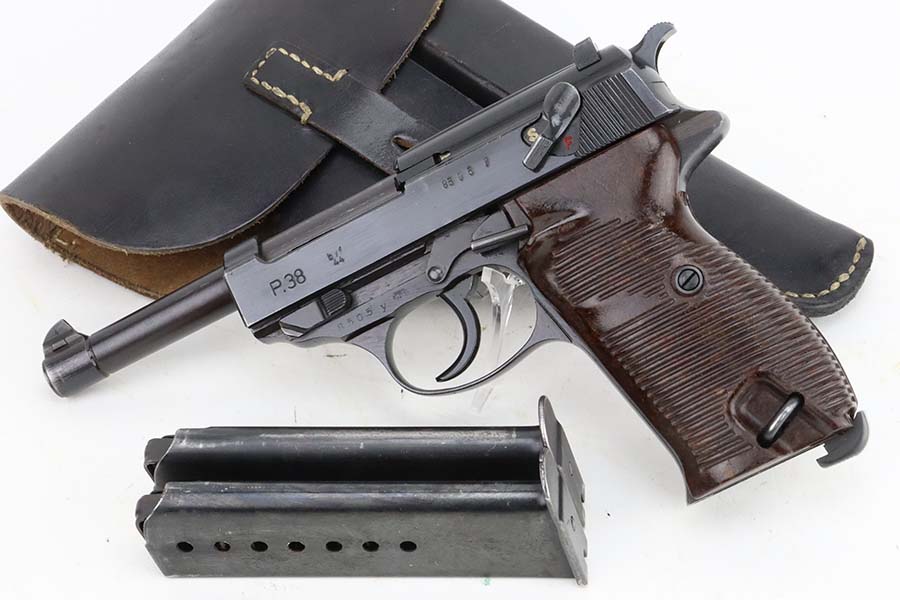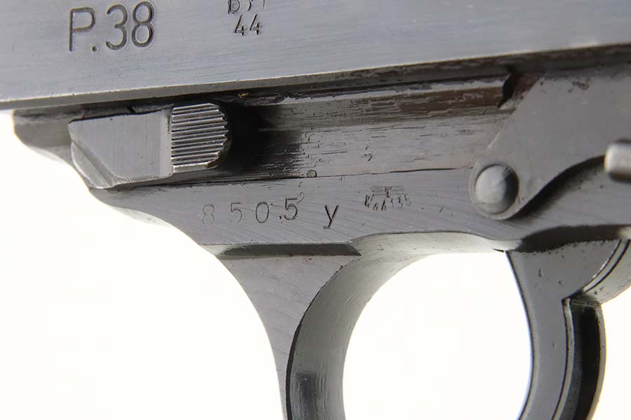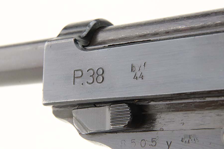 3/12/24 – This is an excellent example of a BYF 44 Mauser P.38 issued to the Nazi military in 1944. All matching with the proper “Waffen 135” military acceptance proofs. It comes as a rig with an un-issued 1944-dated holster, one “Waffen 135” magazine, and one “Waffen 706” jvd magazine. The gun itself has retained about 97% of its original wartime finish with just a hint of muzzle wear and some minor wear on the top of the barrel, visible through the ejection port. Fitted with reddish bakelite grips. The bore has strong rifling, but there is light freckling in the grooves. De-cocker is functional.