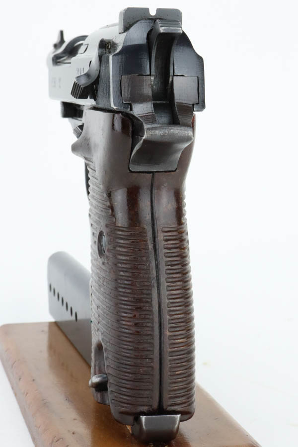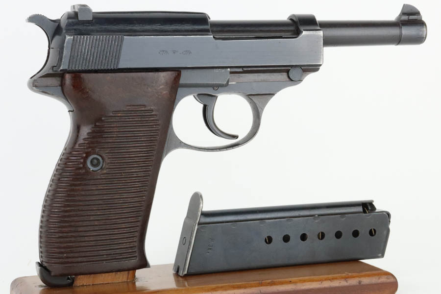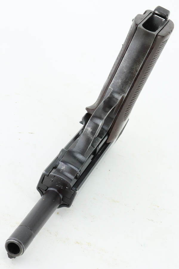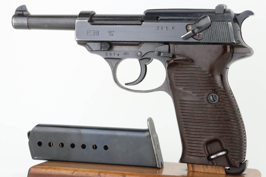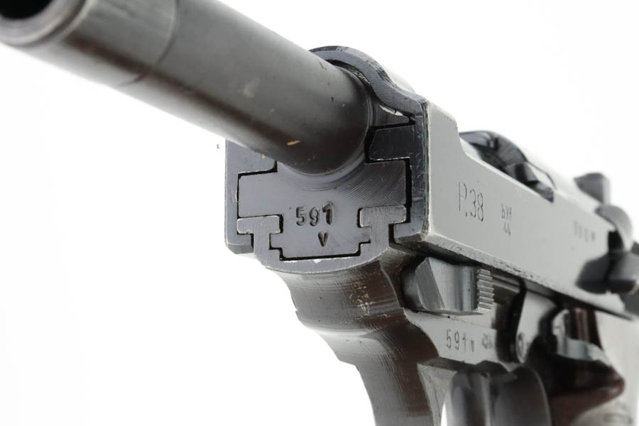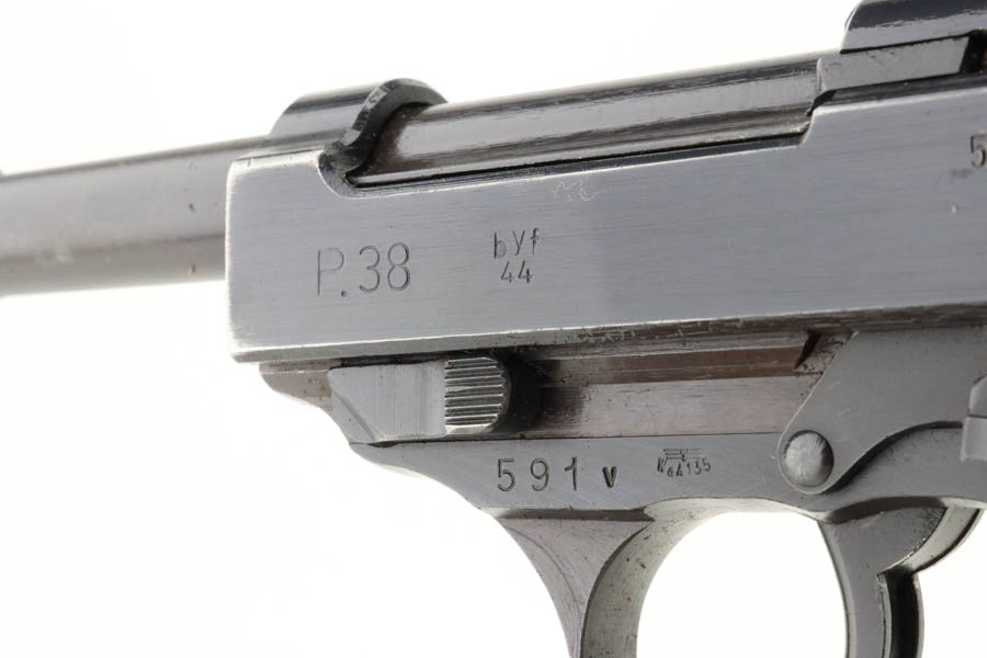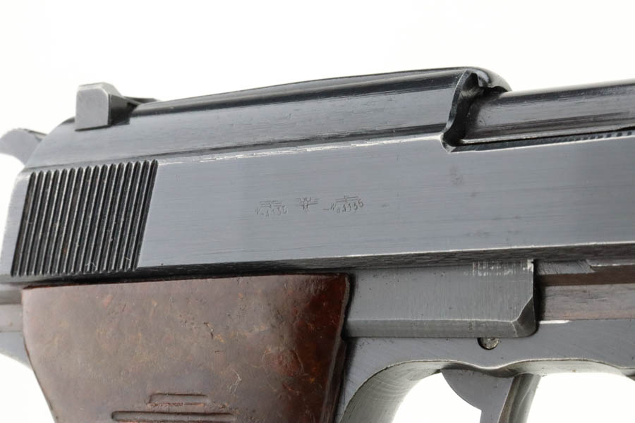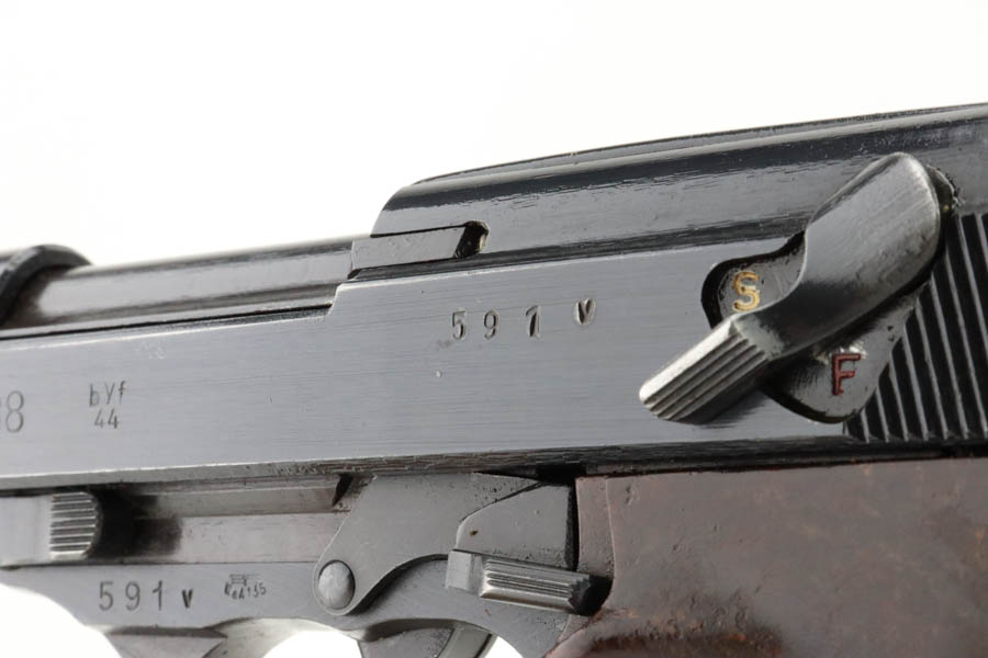 6/26/24 – This is an excellent example of a BYF 44 Mauser P.38 issued to the Nazi military in 1944. All matching with the proper “Waffen 135” military acceptance proofs. It comes as a rig with a very nice 1941-dated hard shell holster and one “Waffen 135” Mauser magazine. The gun itself has retained about 96% of its original finish. There is just very minor thinning on the front strap and hints of wear around the muzzle and on the front edges of the slide. Fitted with reddish bakelite grips. Mint bore. De-cocker is functional.