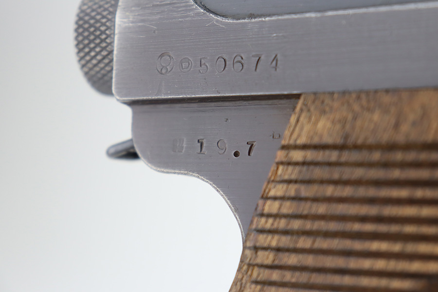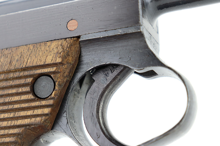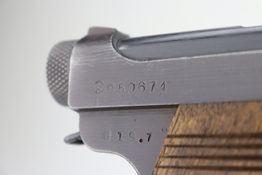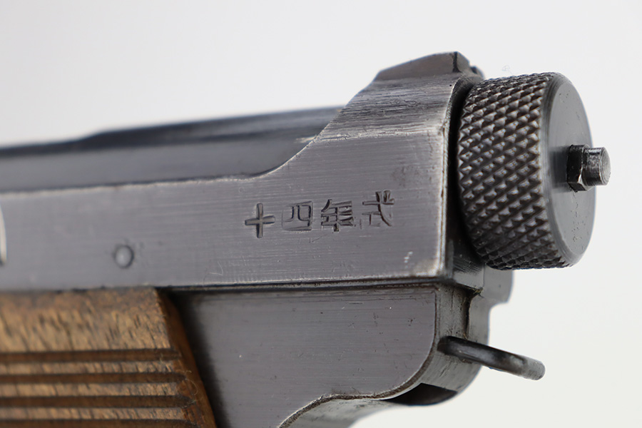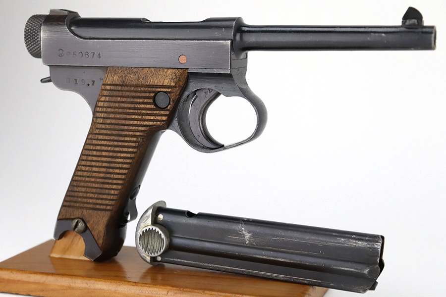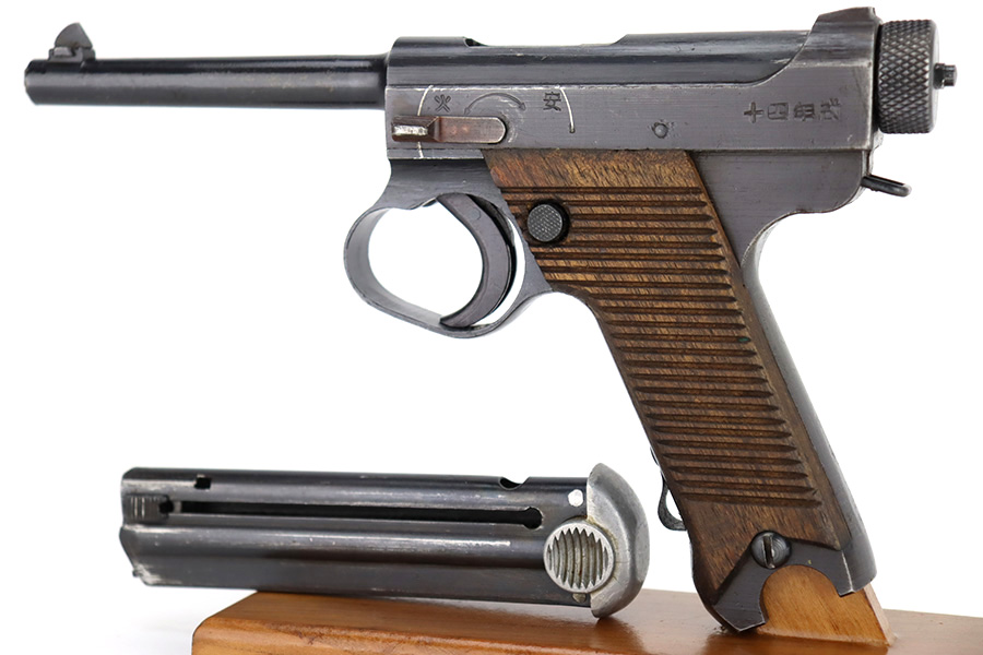 12/13/23 – This is an excellent Nambu Type 14 issued to the Japanese military in July of 1944. All matching and comes with a period-correct but mismatched magazine. The original finish rates about 97% with hints of high edge wear and a hint of thinning on the grip straps. A few tiny dots of discoloration on the left side of the barrel. Fitted with excellent matching-numbered wood grips. Mint bore.