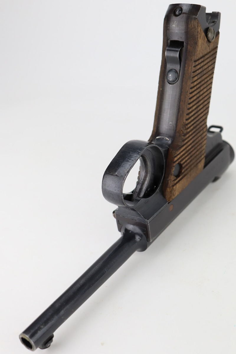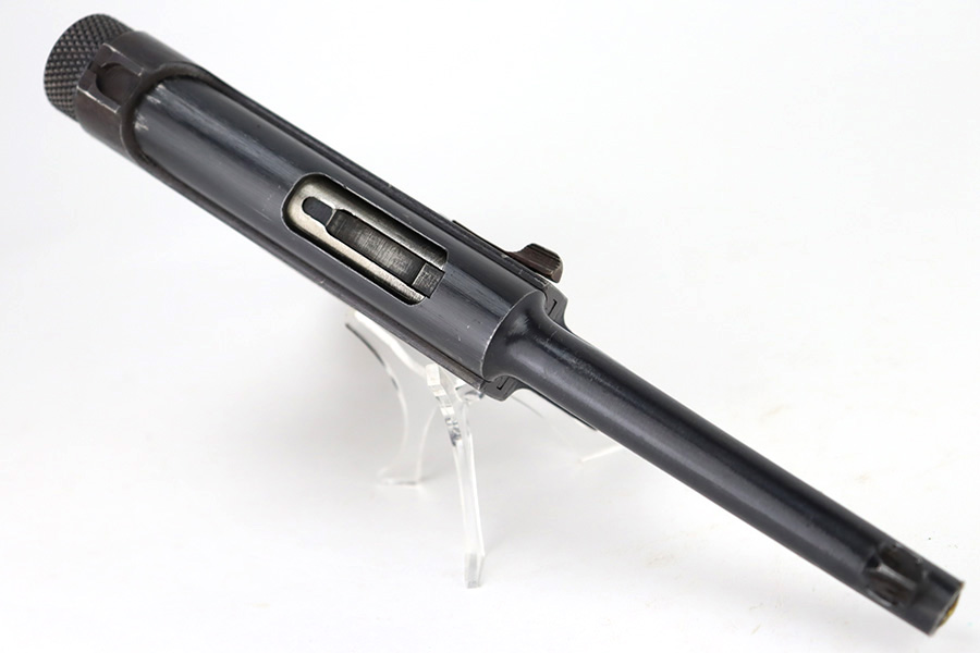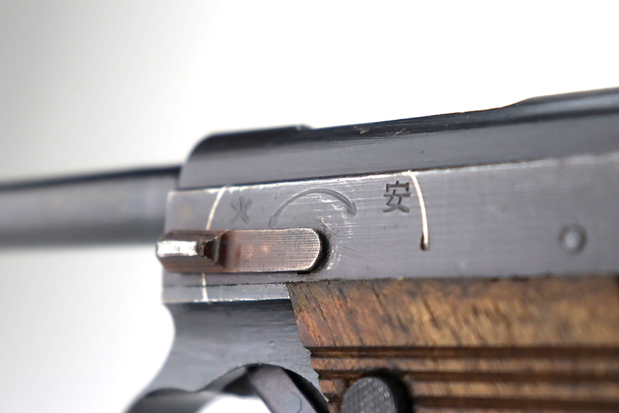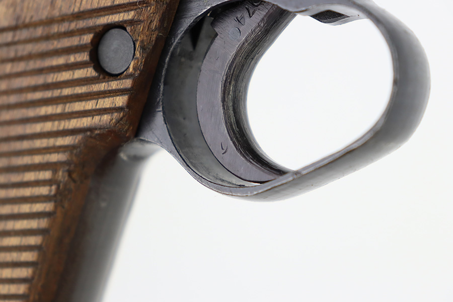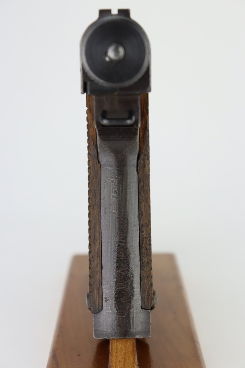 12/13/23 – This is an excellent Nambu Type 14 issued to the Japanese military in July of 1944. All matching and comes with a period-correct but mismatched magazine. The original finish rates about 97% with hints of high edge wear and a hint of thinning on the grip straps. A few tiny dots of discoloration on the left side of the barrel. Fitted with excellent matching-numbered wood grips. Mint bore.