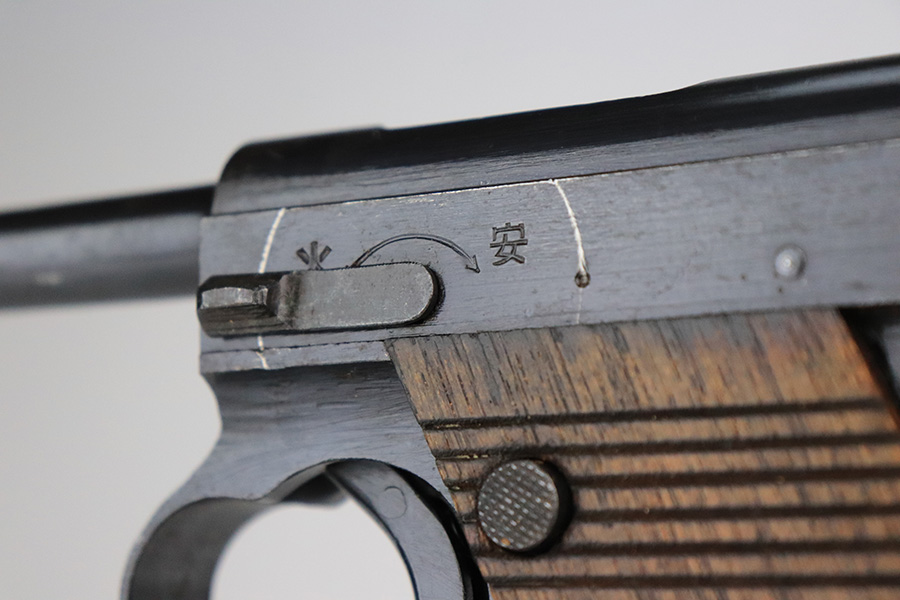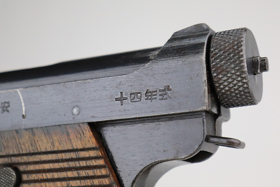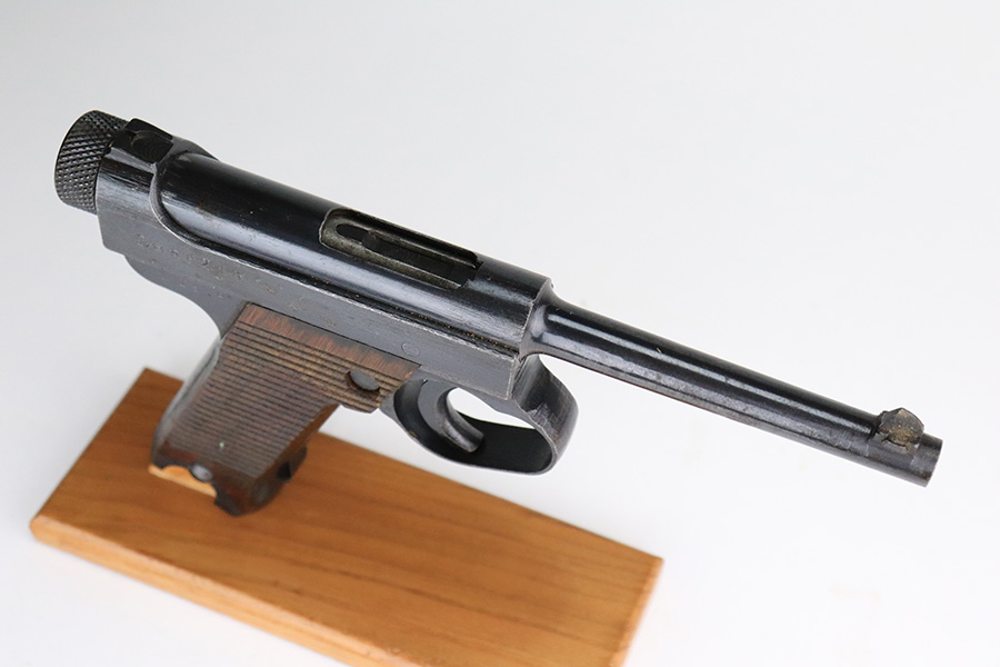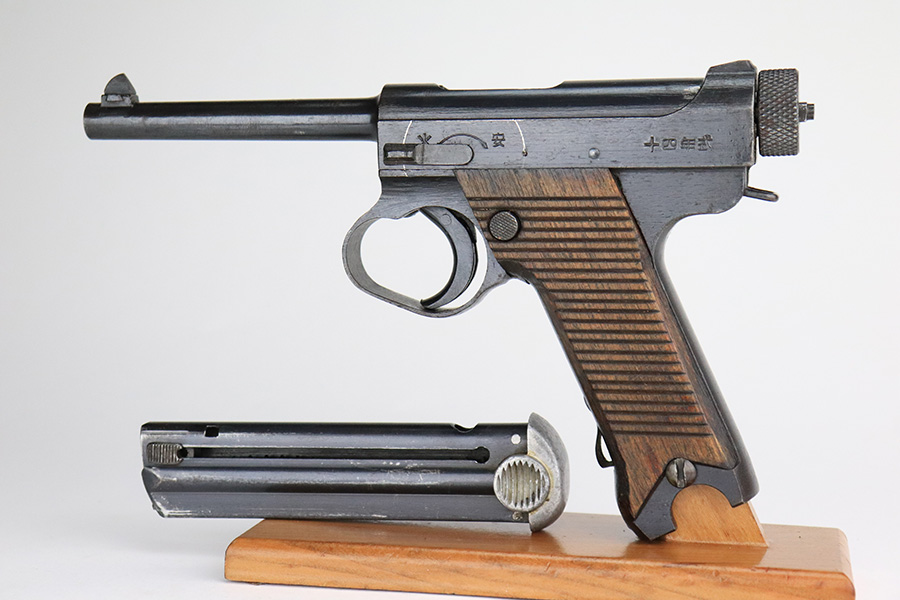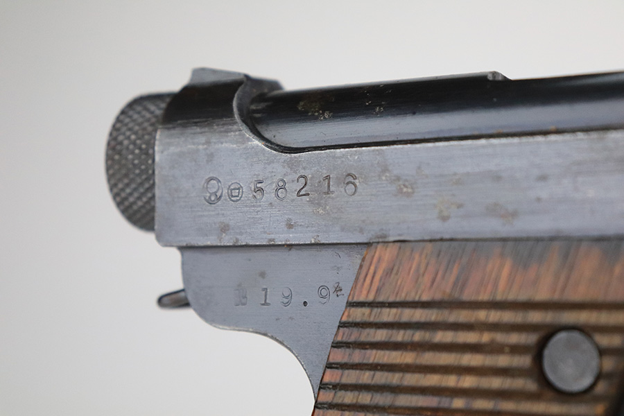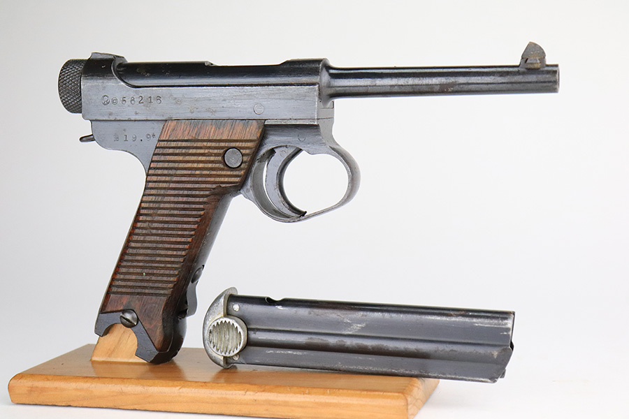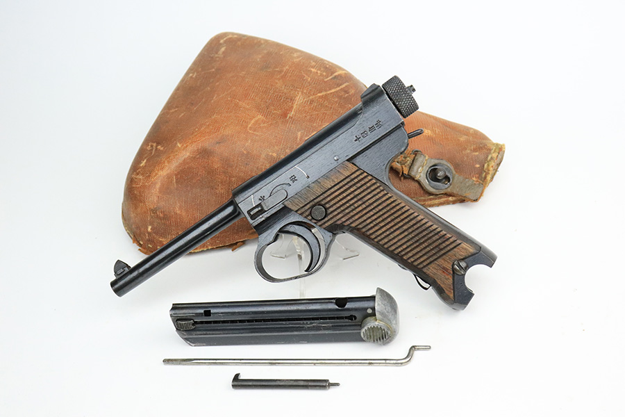 7/8/22 – This is an excellent example of a Nambu Type 14 issued to the Japanese military in September of 1944. It is all matching and comes as a rig with a very nice rubberized canvas holster, a period-correct but mismatched magazine, a nickeled cleaning rod, and a spare firing pin. The gun itself ahs retained about 97% of its original bluing. There is an area of spotty discoloration on the right side of the slide. While there is very little actual finish loss, there are some small dots of oxidation here and there, most noticeable on the grip straps and along the barrel. Comes with excellent matching-numbered wood grips. Mint bore.