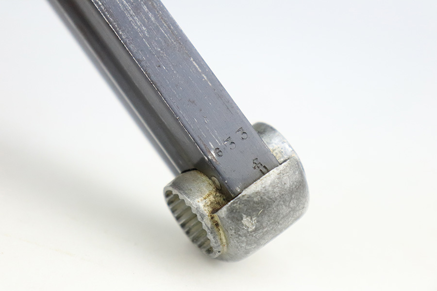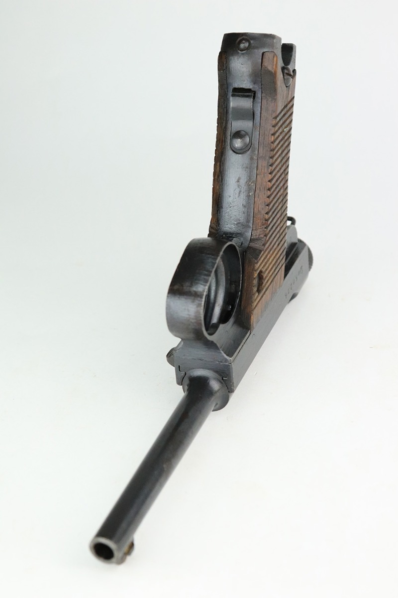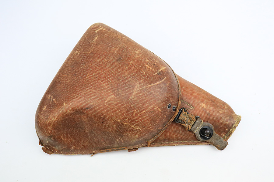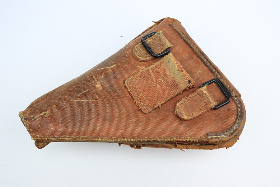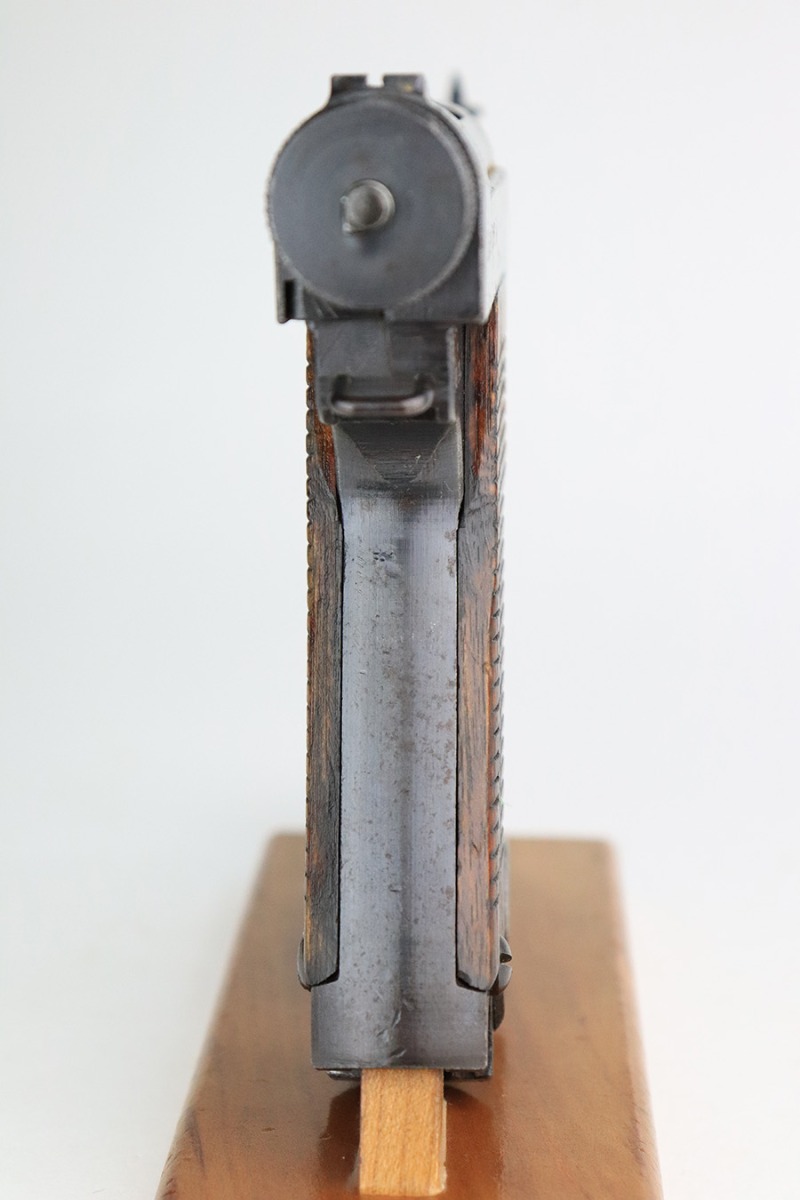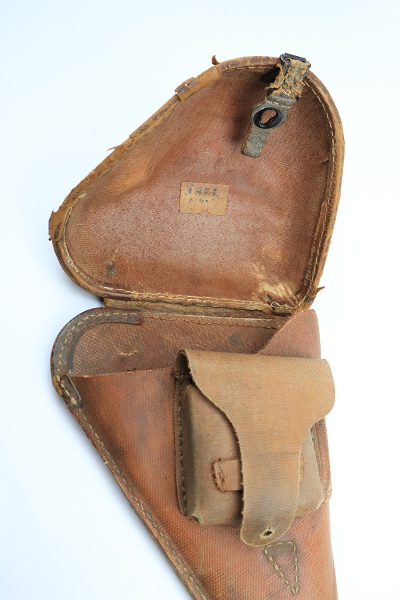 7/8/22 – This is an excellent example of a Nambu Type 14 issued to the Japanese military in September of 1944. It is all matching and comes as a rig with a very nice rubberized canvas holster, a period-correct but mismatched magazine, a nickeled cleaning rod, and a spare firing pin. The gun itself ahs retained about 97% of its original bluing. There is an area of spotty discoloration on the right side of the slide. While there is very little actual finish loss, there are some small dots of oxidation here and there, most noticeable on the grip straps and along the barrel. Comes with excellent matching-numbered wood grips. Mint bore.