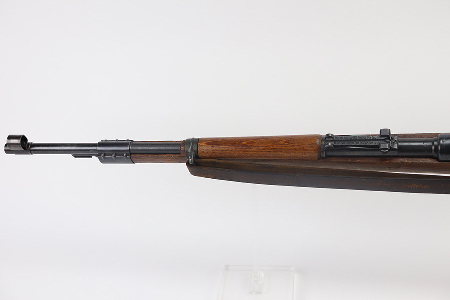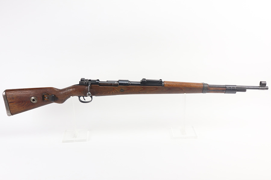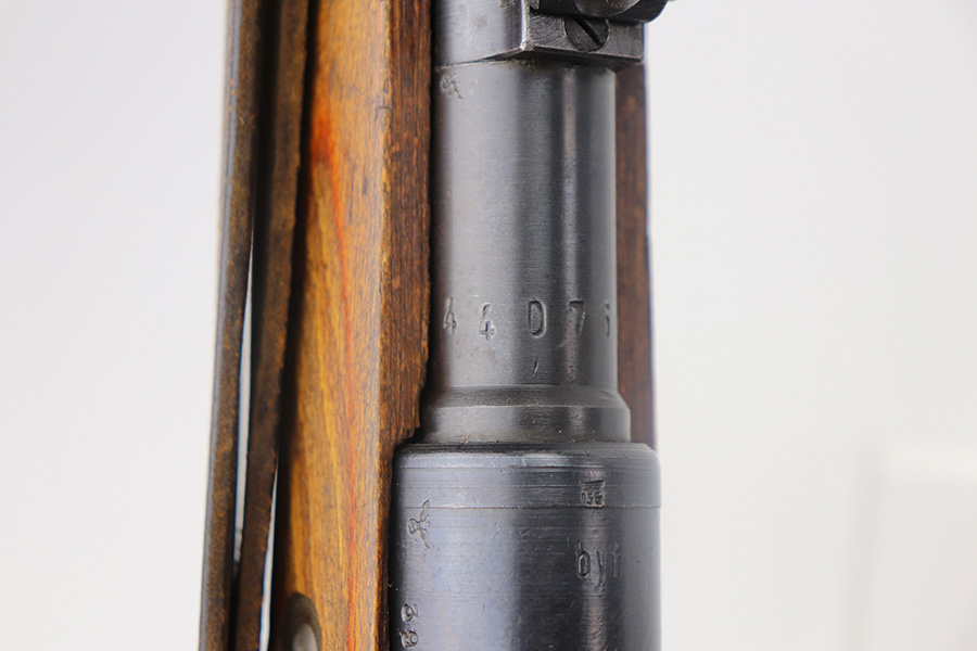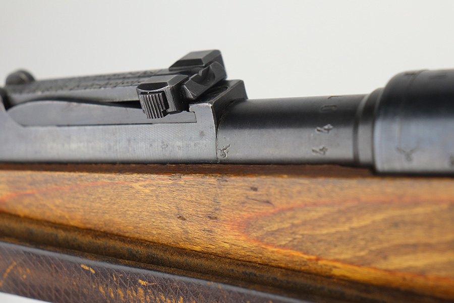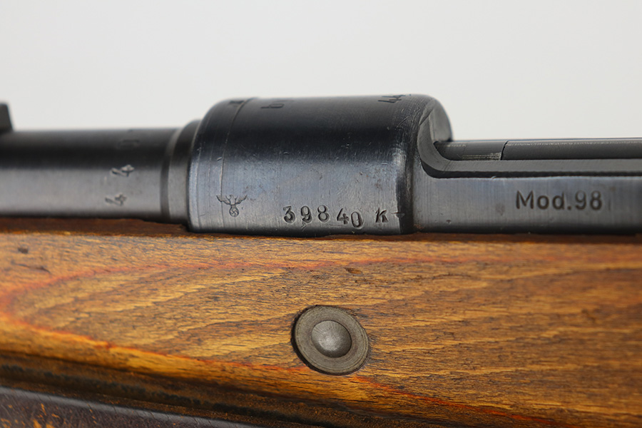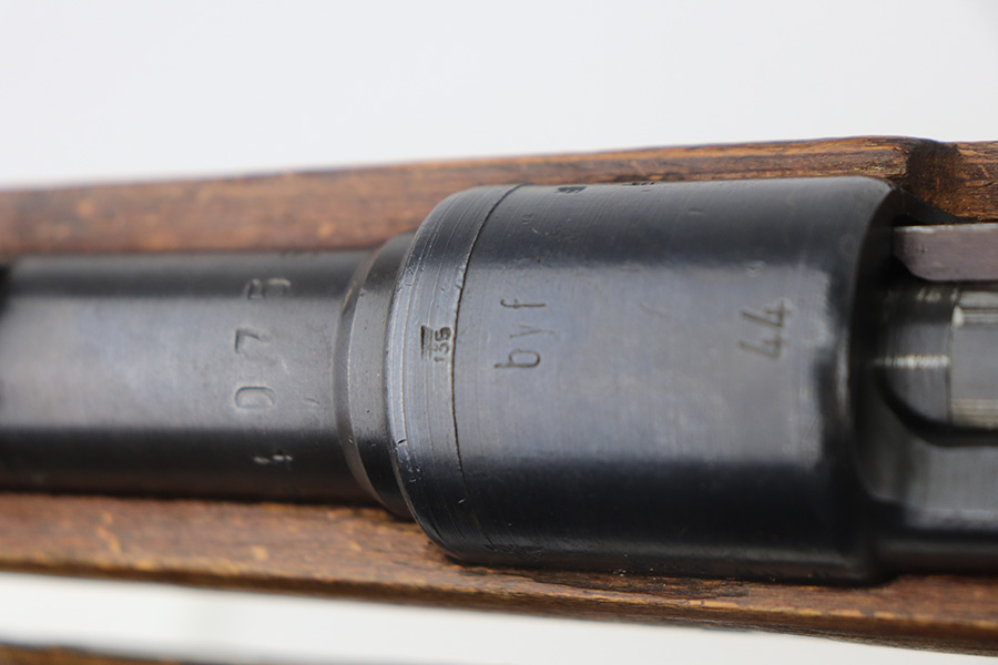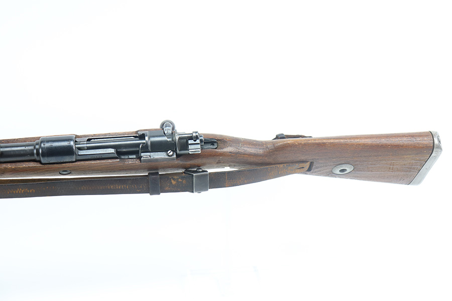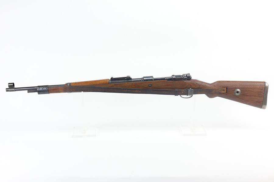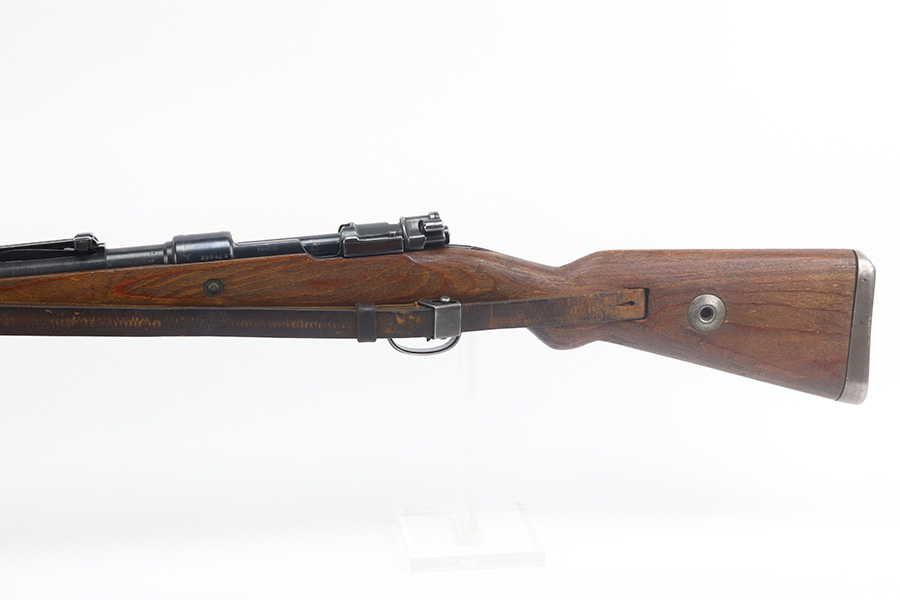 5/21/21 – This is an excellent example of a Mauser K98 issued to the Nazi military in 1944. The gun is all matching and has the proper waffen military proofs throughout. Unfortunately, the stock has been duffle-cut. Overall the gun is in excellent condition. It has retained most of its original bluing with minor scratchy wear on the barrel and floor plate. The stock is excellent and has a faint waffen proof on the right side. The stock has been lightly sanded. The gun comes with an original leather sling. Excellent bore – shiny with strong rifling.