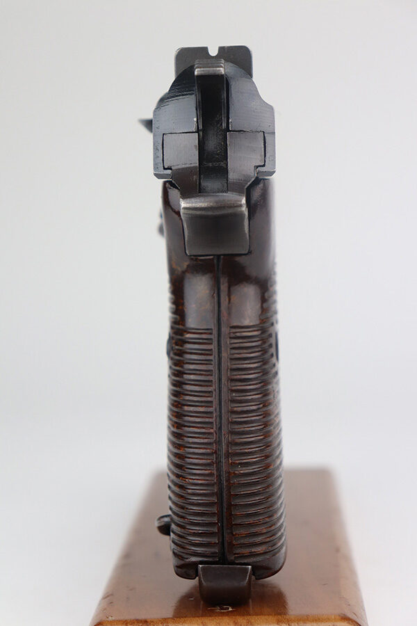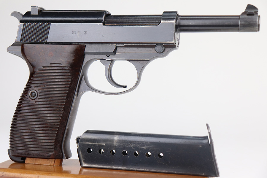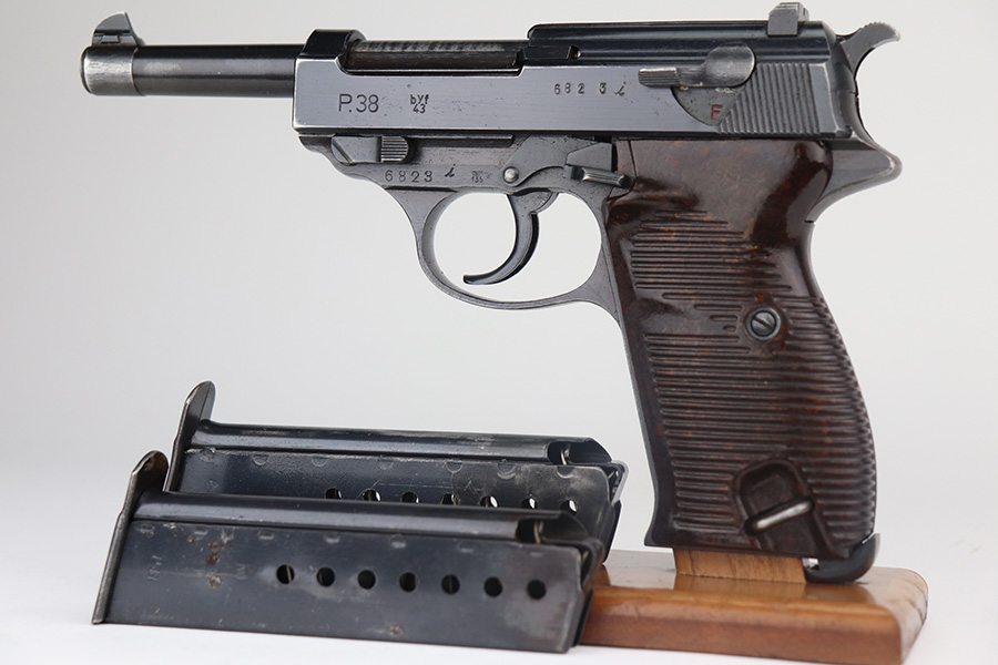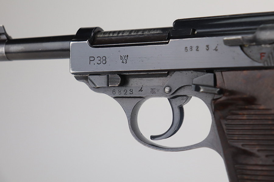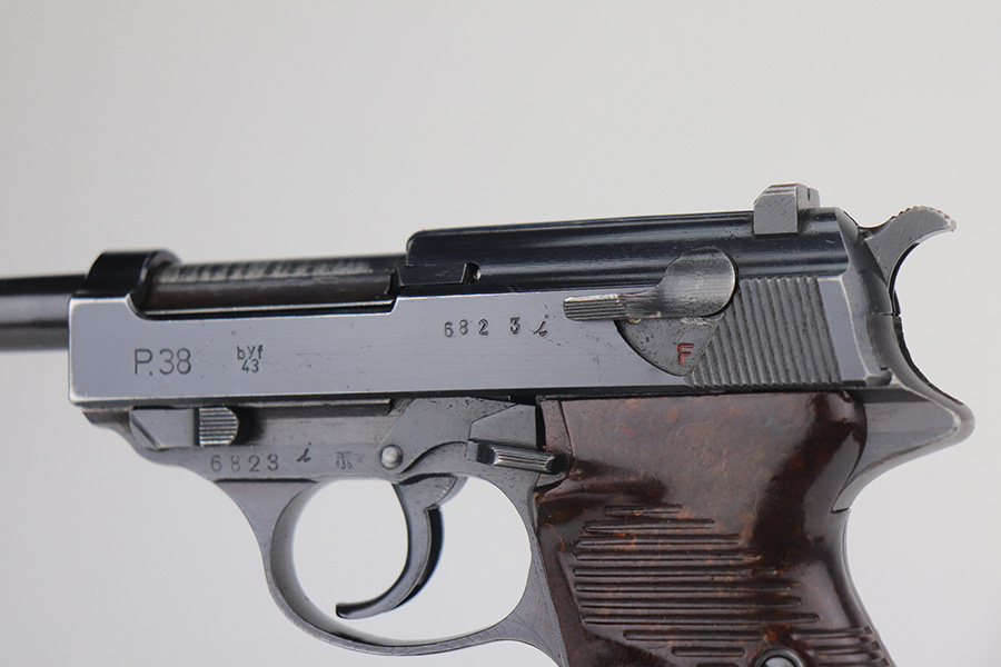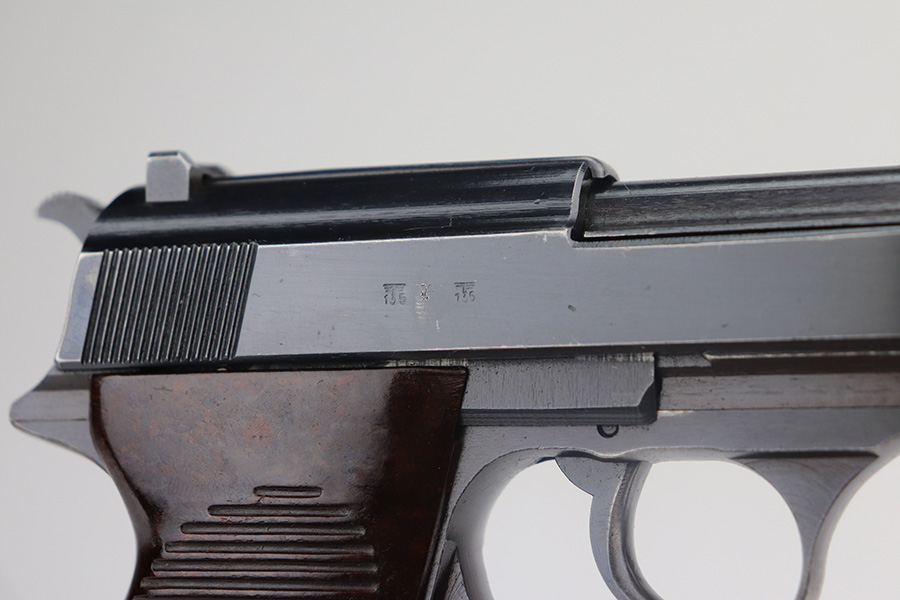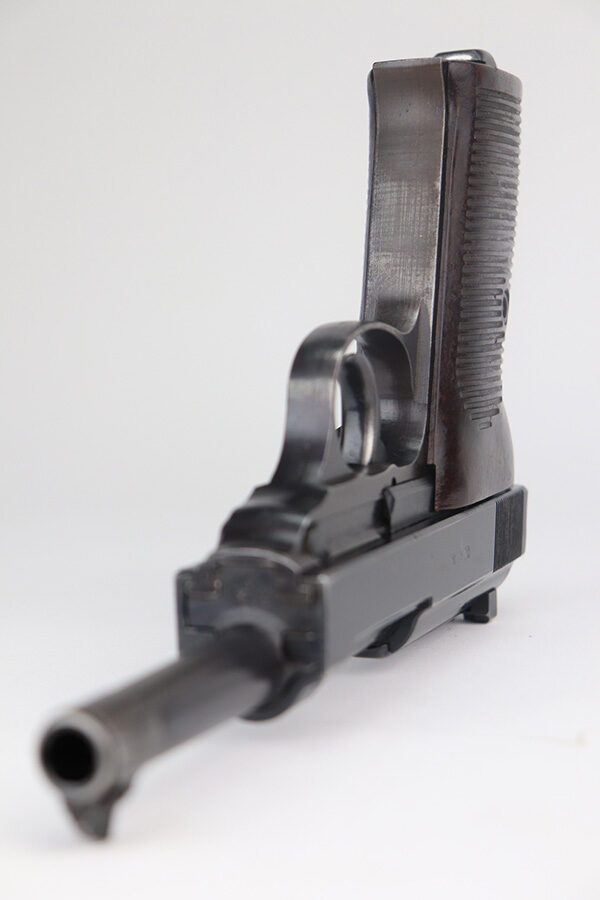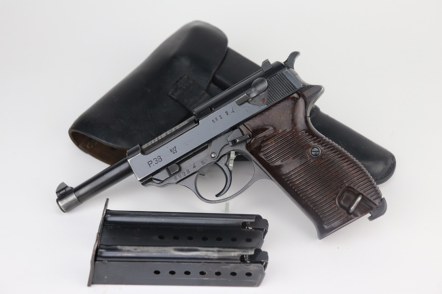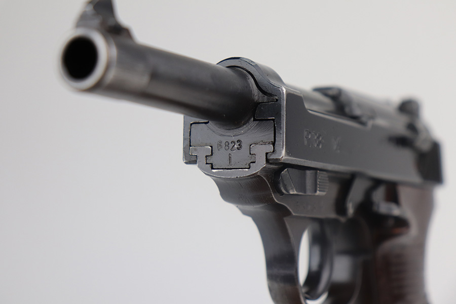 5/20/21 – This is an excellent example of a Mauser P.38 rig issued to the Nazi military in 1944. The gun is all matching and has the proper “Eagle 135” military proofs. The gun comes with two period-correct magazines and a waffen-proofed 1944-dated holster. It has retained about 94-95% of its original bluing. The profile views are very nice as most of the wear is on the front strap, where there is also minor patina. There is also minor wear on the front edges of the slide and around the muzzle. Excellent grips. The bore is near-mint. The de-cocker is functional.