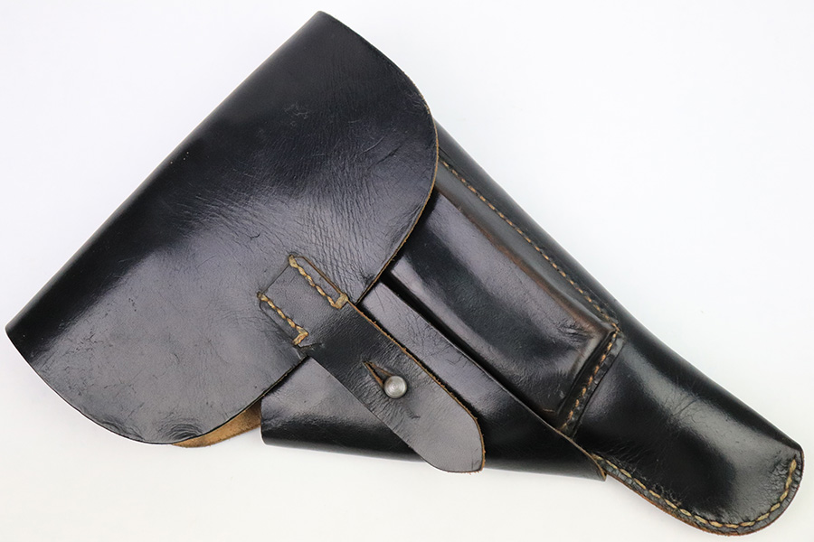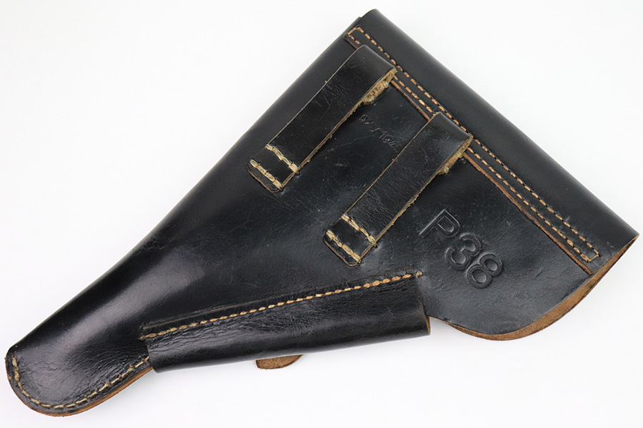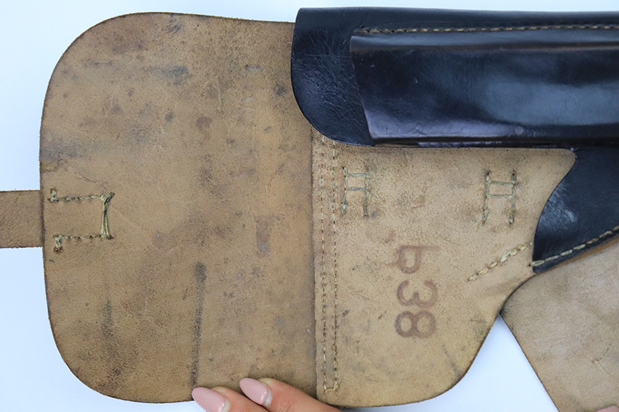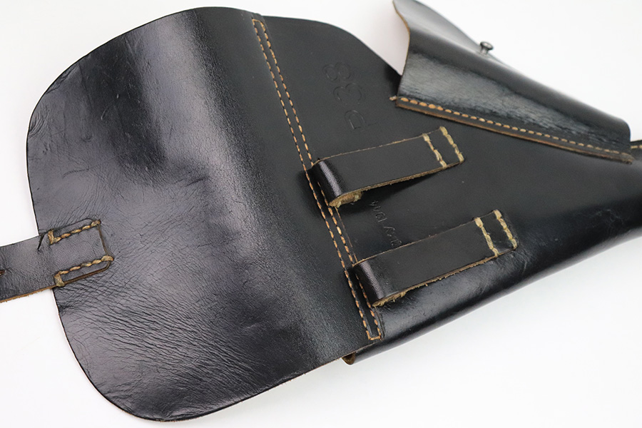 12/13/22 – This is an original 1944 dated soft shell style P.38 holster. Late WW2 production with excellent, clean leather and stitching throughout. The leather is soft and pliable and shows mild signs of previous use without any excessive wear or damage. Crisply struck maker stamp, date, and P.38 stamp on the back leather. Clean interior.