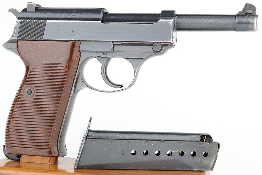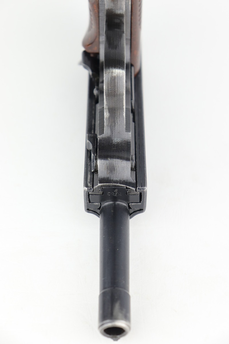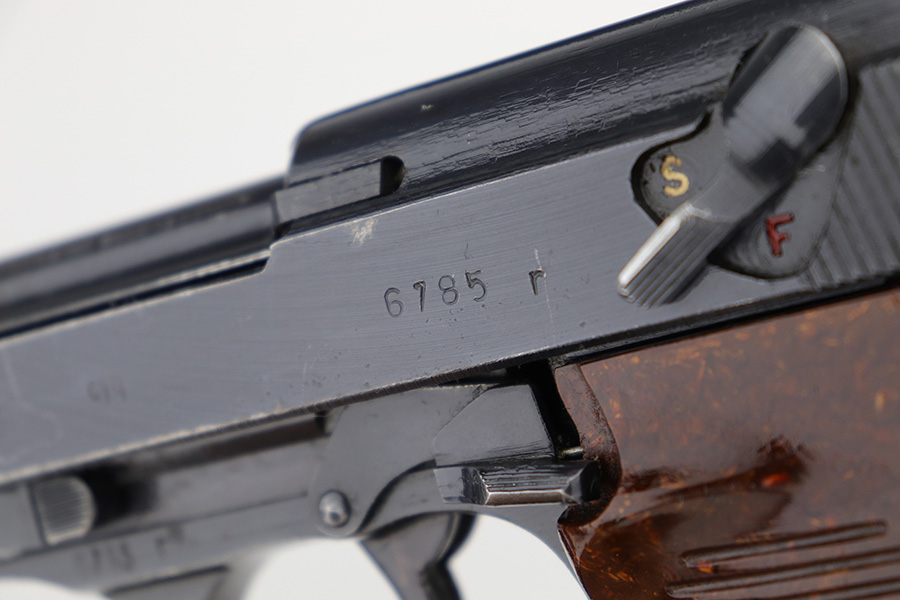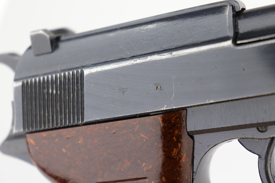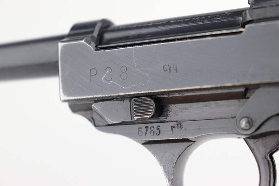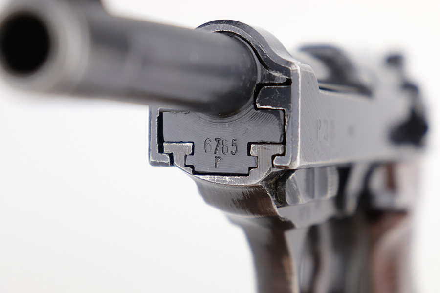 1/13/23 – This is a minty example of a Spreewerk P.38 issued to the Nazi military in June of 1944. It is all matching and has the proper “Eagle 88” military acceptance proofs throughout. It has retained around 95% of its finish. There is very minor wear around the muzzle and on the high edges of the slide. Some very minor thinning and light brown patina on the front strap. One light surface scratch on the left side of the slide. Fitted with excellent reddish bakelite grips and comes with a period-correct jvd magazine. The bore has strong rifling with minor pin-pricking throughout. De-cocker is functional.