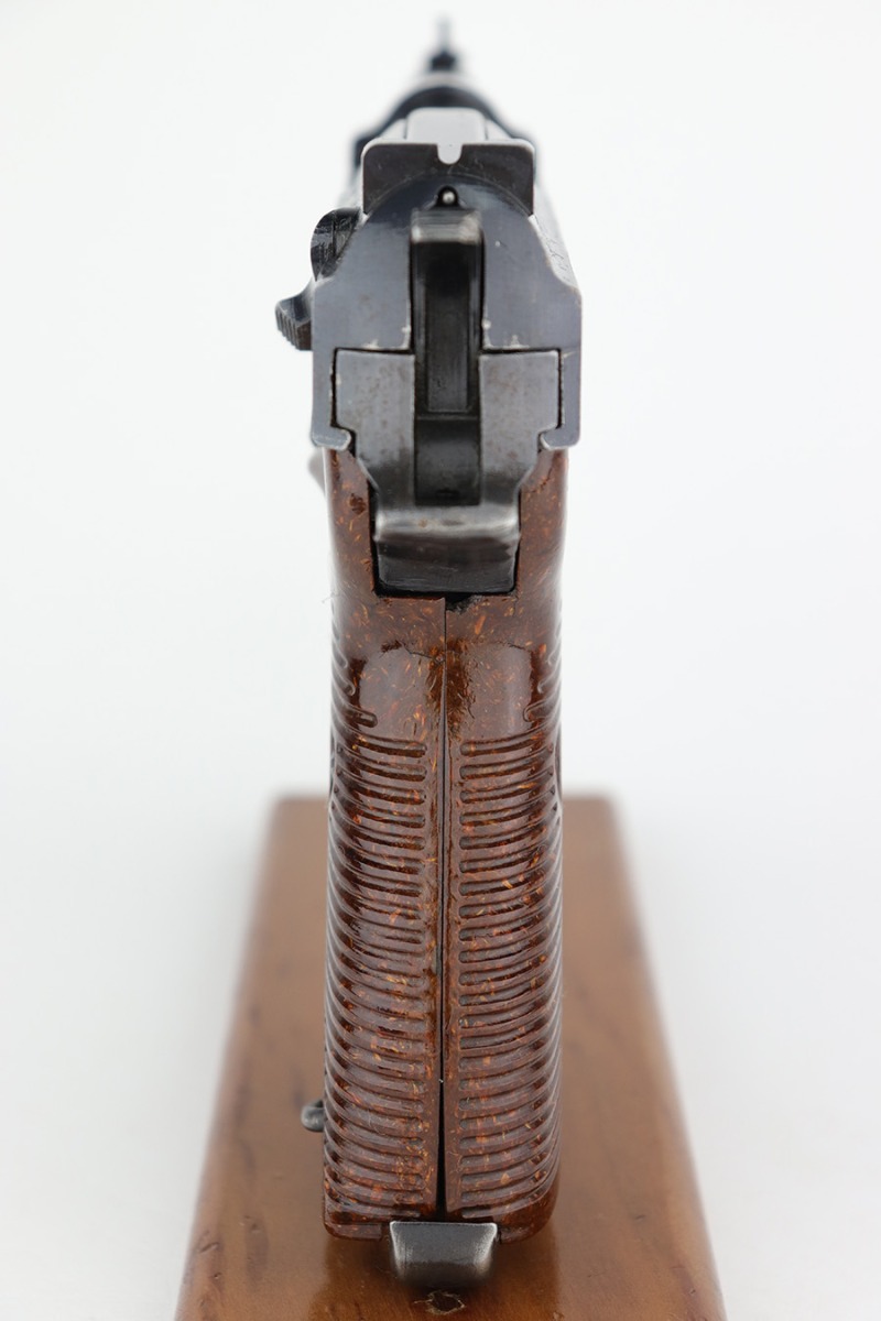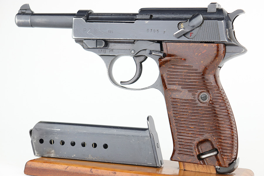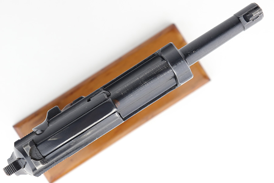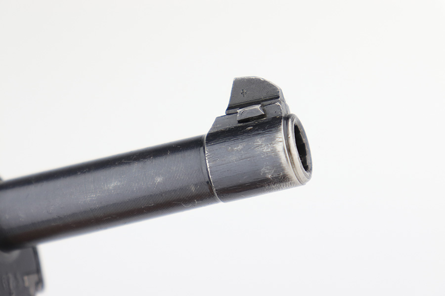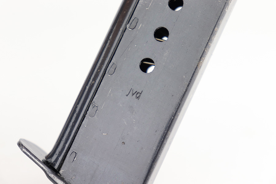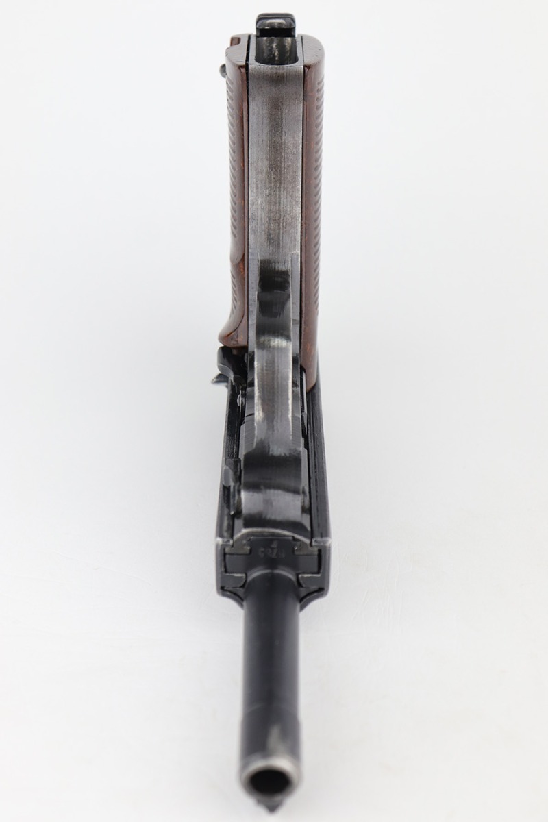 1/13/23 – This is a minty example of a Spreewerk P.38 issued to the Nazi military in June of 1944. It is all matching and has the proper “Eagle 88” military acceptance proofs throughout. It has retained around 95% of its finish. There is very minor wear around the muzzle and on the high edges of the slide. Some very minor thinning and light brown patina on the front strap. One light surface scratch on the left side of the slide. Fitted with excellent reddish bakelite grips and comes with a period-correct jvd magazine. The bore has strong rifling with minor pin-pricking throughout. De-cocker is functional.