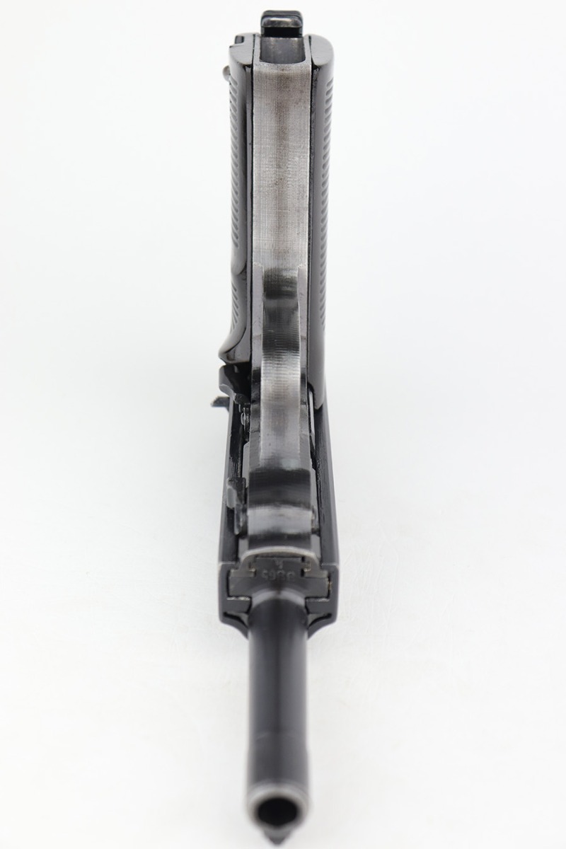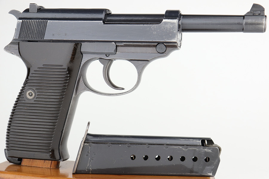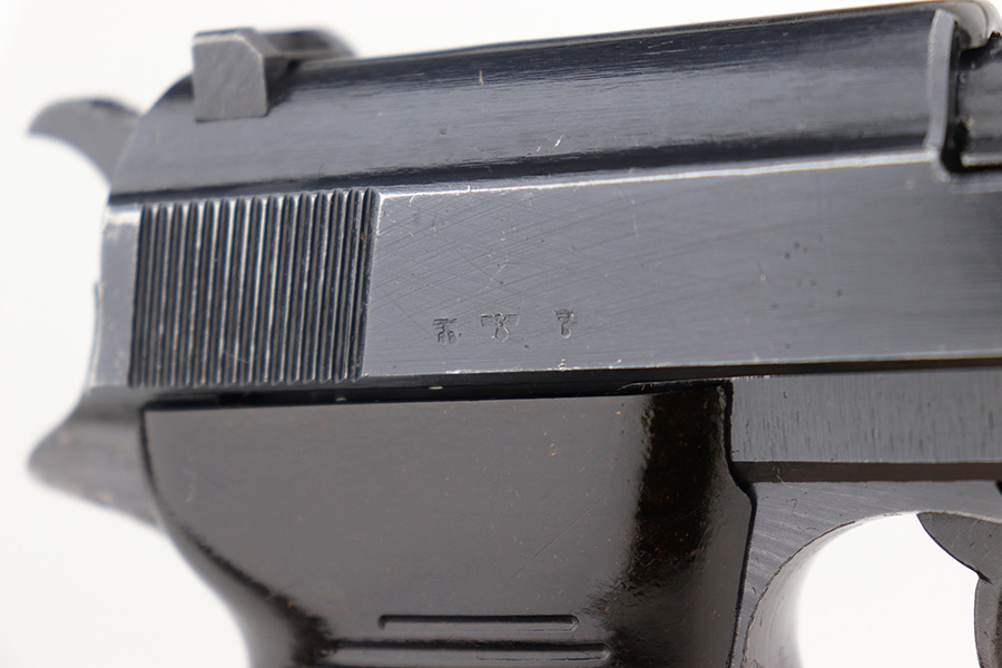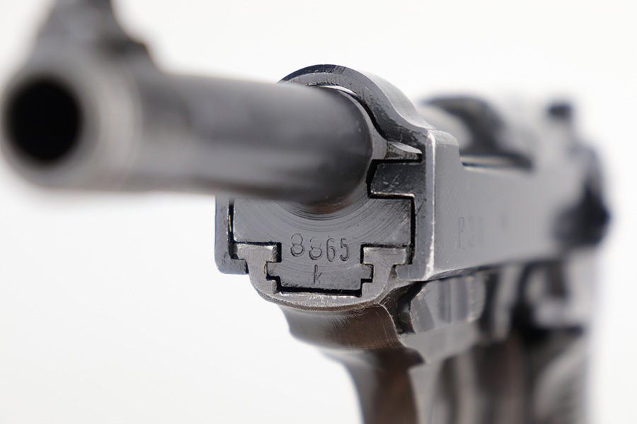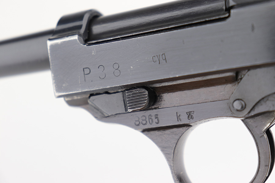 4/20/23 – This is an excellent example of a Spreewerk P.38 issued to the Nazi military in January of 1944. All matching with the proper “Eagle 88” proofs throughout. There is an “asterisk” marking on the right side of the barrel, indicating it failed initial inspection and was repaired at the factory – a desirable trait for collectors. The gun has retained about 95% of its original finish. There is minor thinning on the front strap and areas of minor wear around the muzzle and on the front edges of the slide. A few very light scratches / scuffs here and there. Fitted with excellent blackish-brown bakelite grips. Comes with a P.38v magazine – ribbed follower. Excellent, shiny bore with strong rifling. De-cocker is functional.