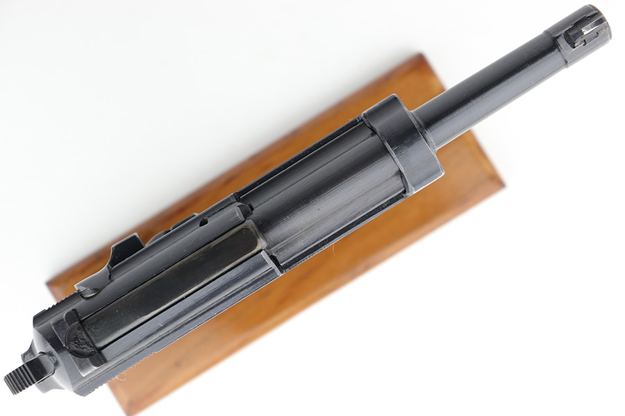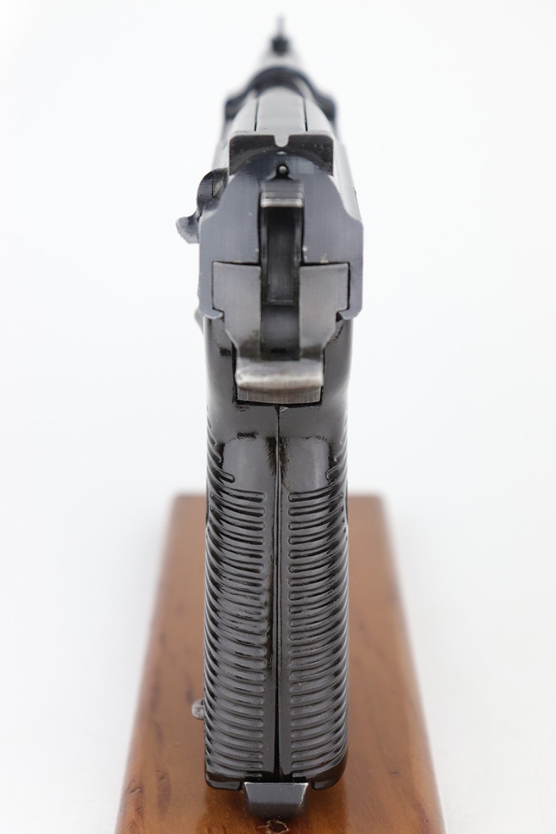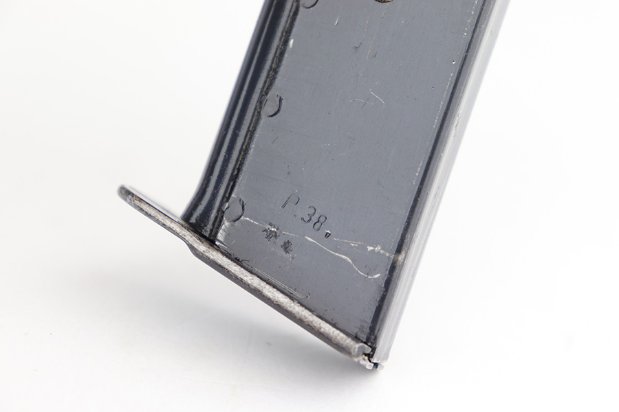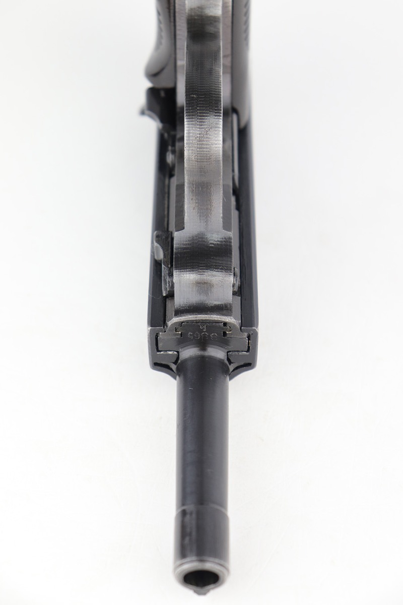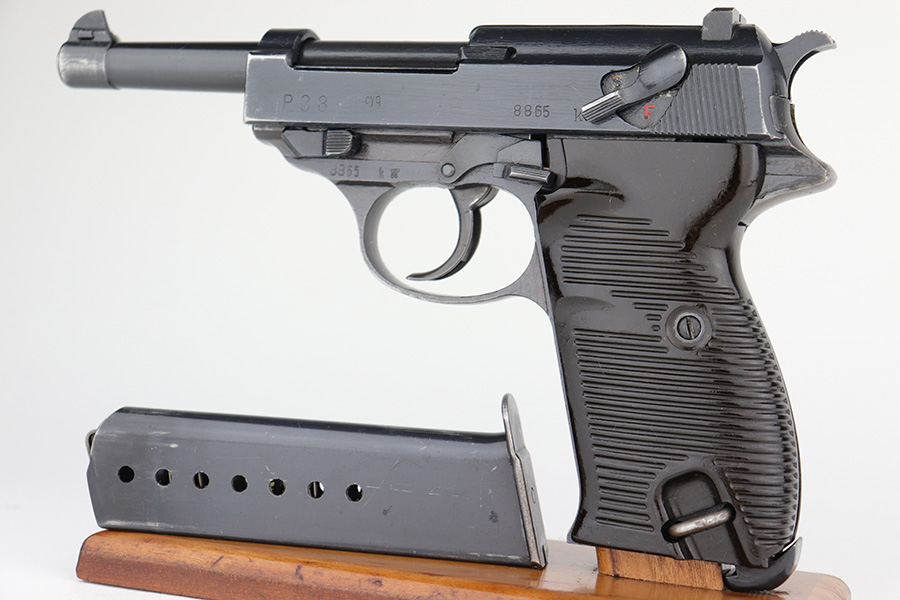 4/20/23 – This is an excellent example of a Spreewerk P.38 issued to the Nazi military in January of 1944. All matching with the proper “Eagle 88” proofs throughout. There is an “asterisk” marking on the right side of the barrel, indicating it failed initial inspection and was repaired at the factory – a desirable trait for collectors. The gun has retained about 95% of its original finish. There is minor thinning on the front strap and areas of minor wear around the muzzle and on the front edges of the slide. A few very light scratches / scuffs here and there. Fitted with excellent blackish-brown bakelite grips. Comes with a P.38v magazine – ribbed follower. Excellent, shiny bore with strong rifling. De-cocker is functional.