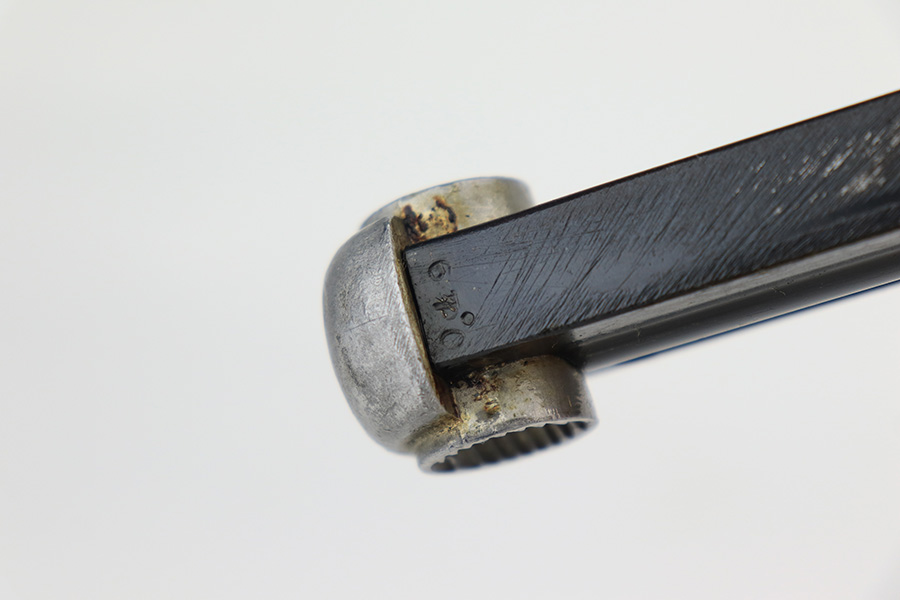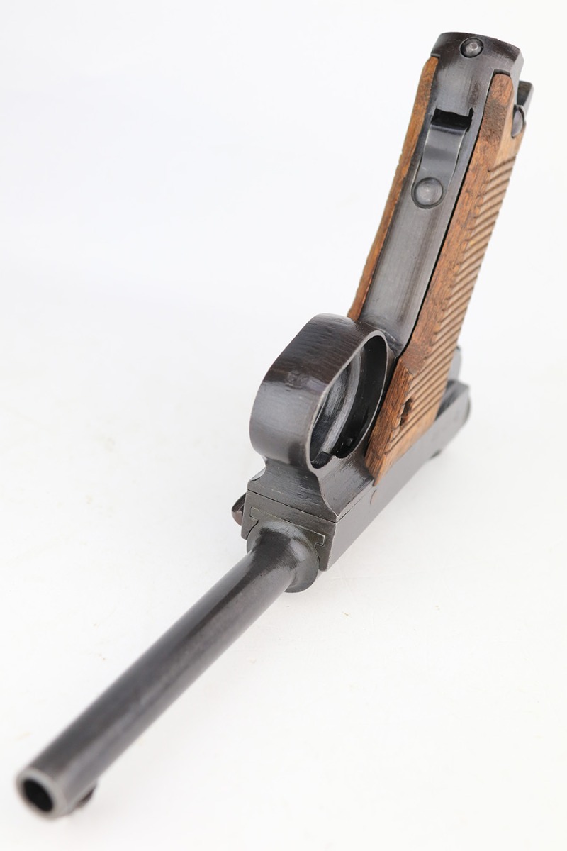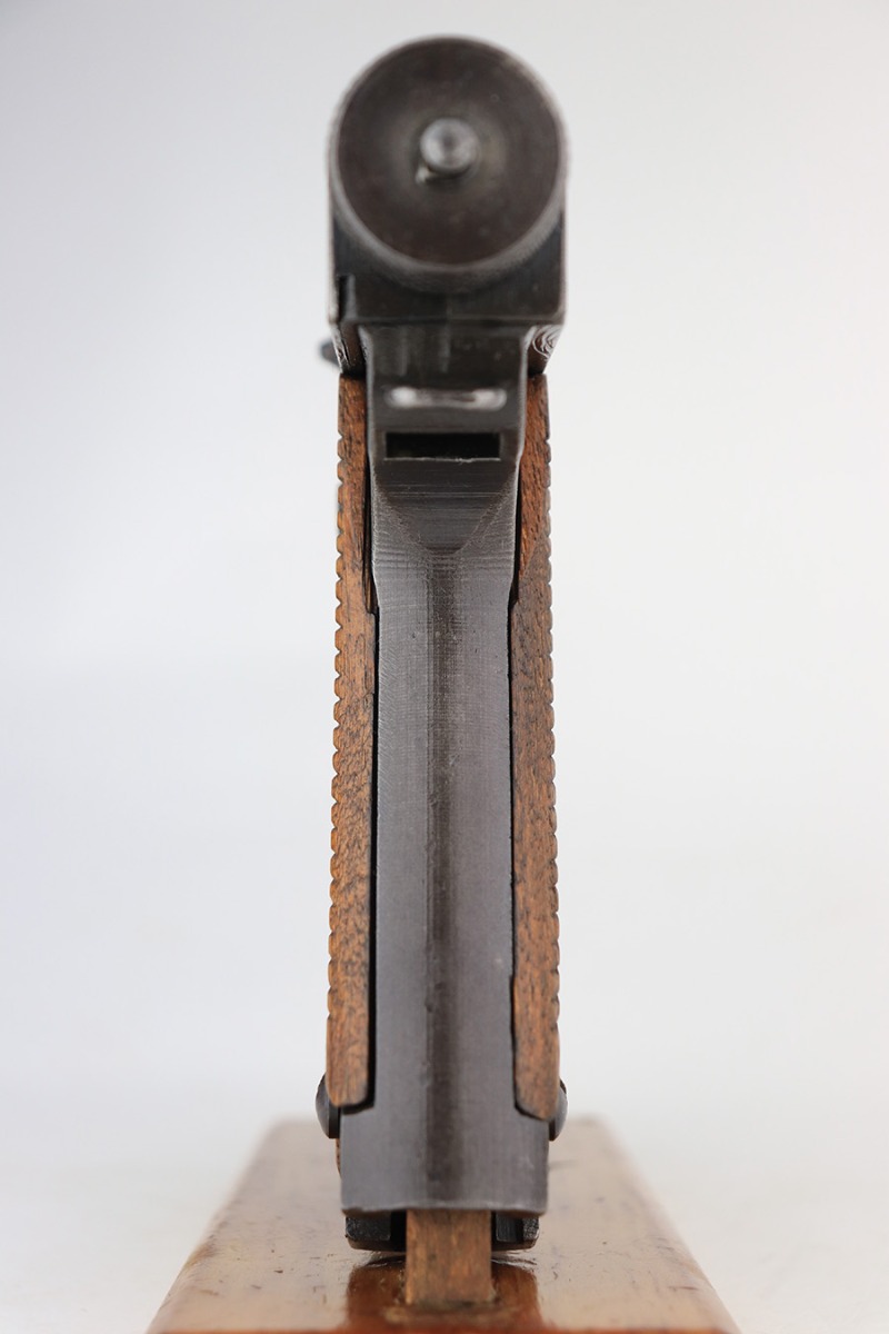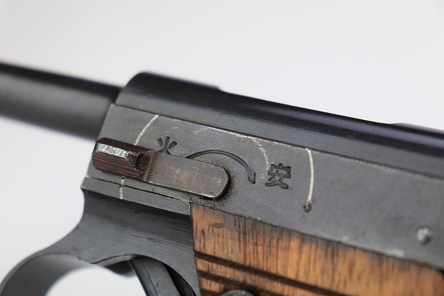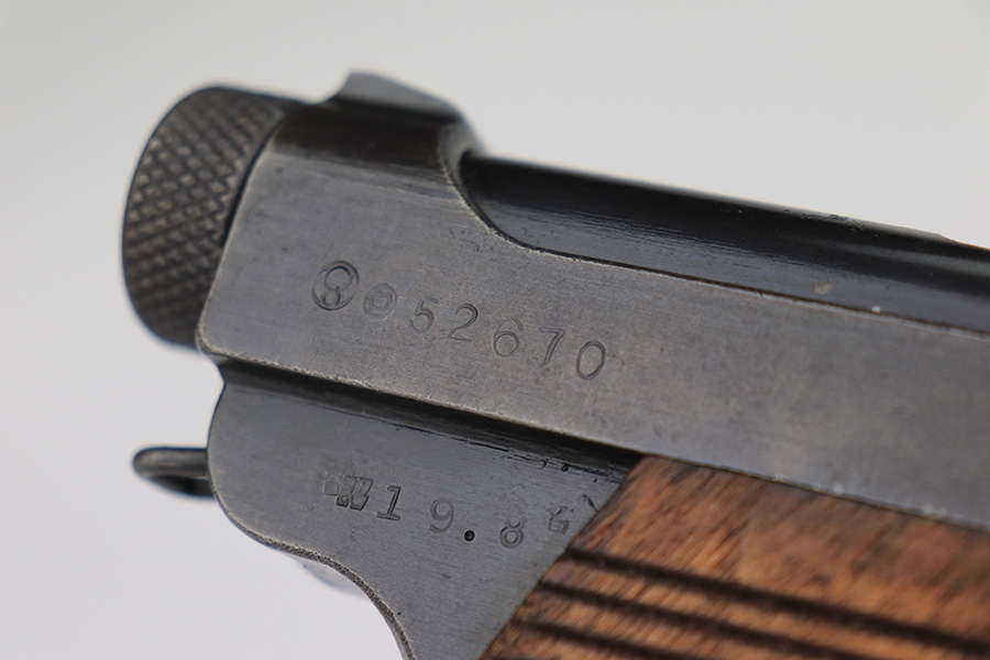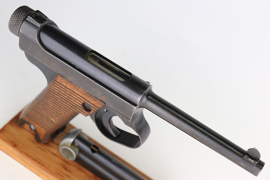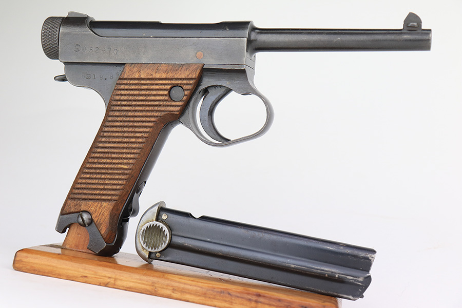 3/14/23 – This is an excellent example of a Nambu Type 14 issued to the Japanese military in August of 1944. It is all matching and comes with one original matching-numbered magazine. It has retained about 96-97% of its original finish with very minor thinning on the grip straps and on both sides of the frame. Excellent matching-numbered wood grips. Excellent bore with strong rifling.