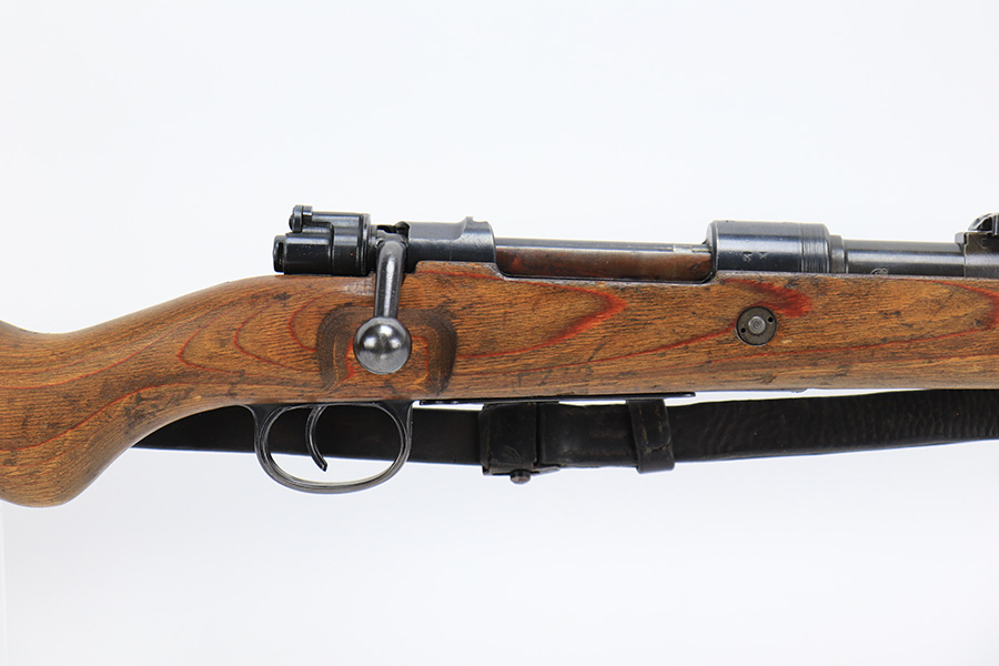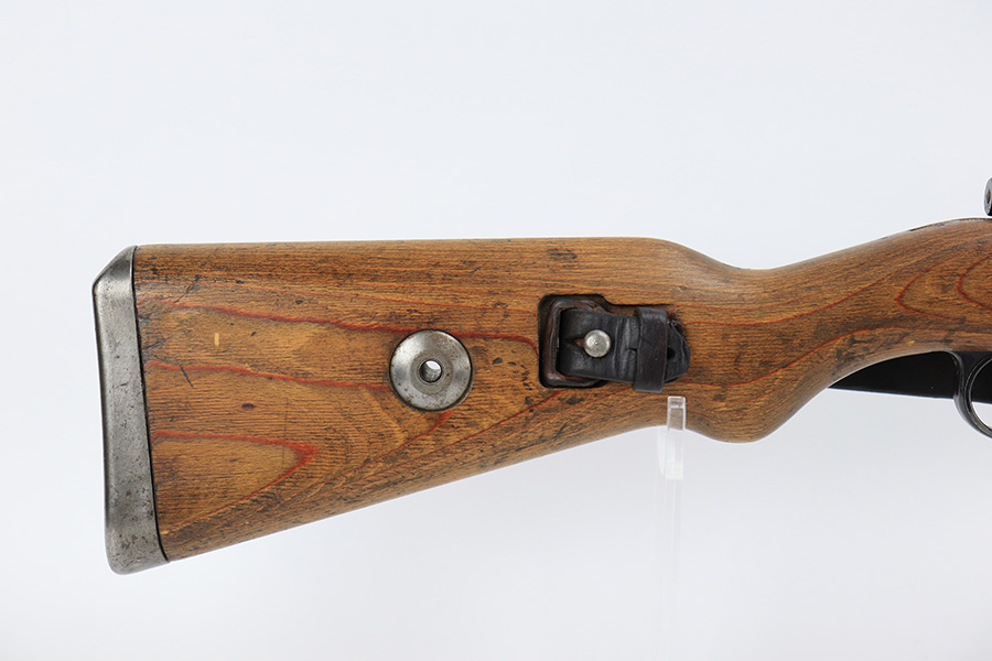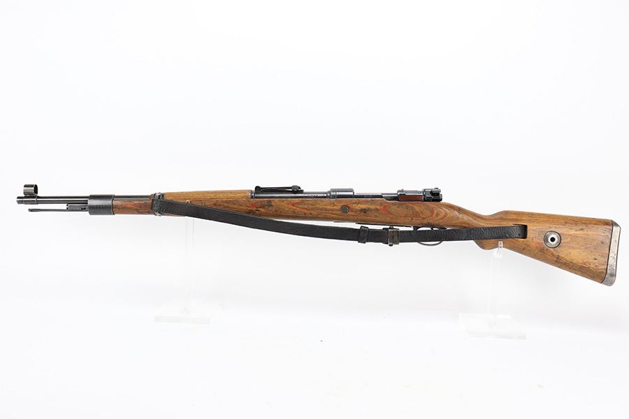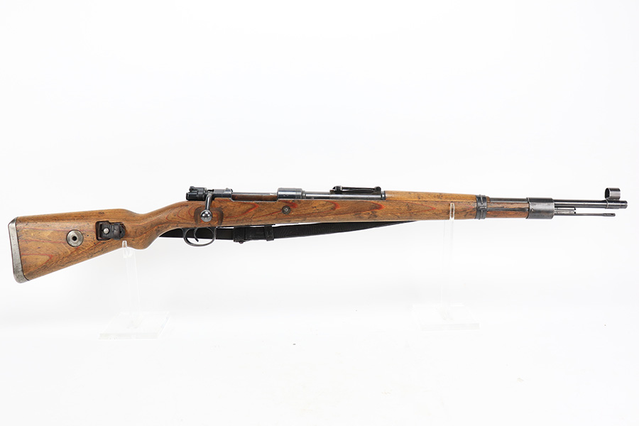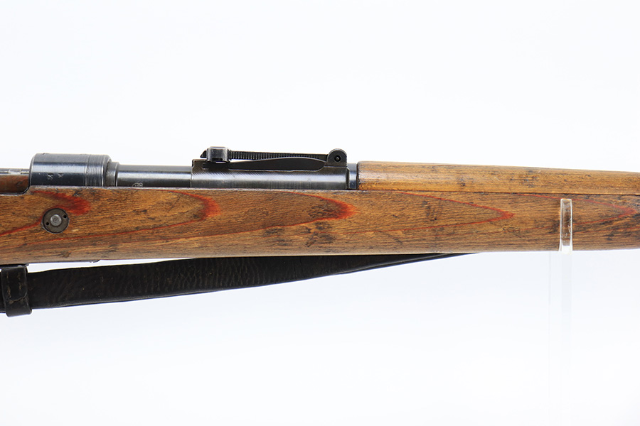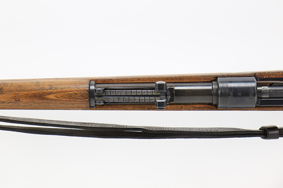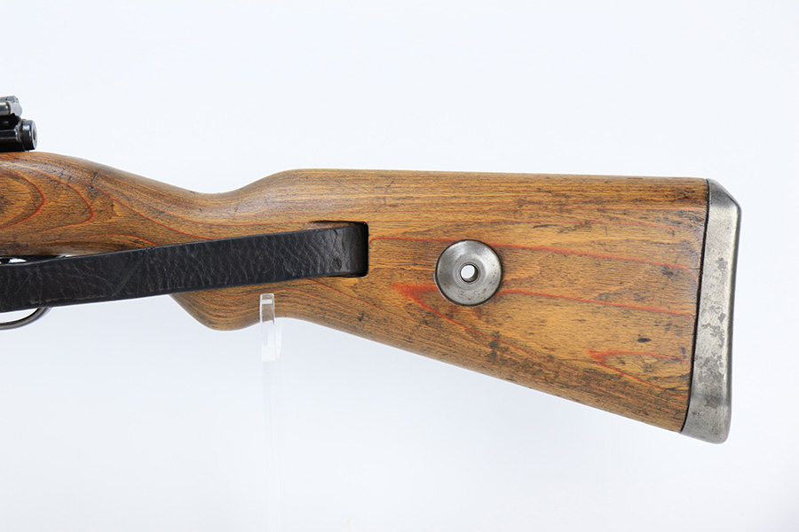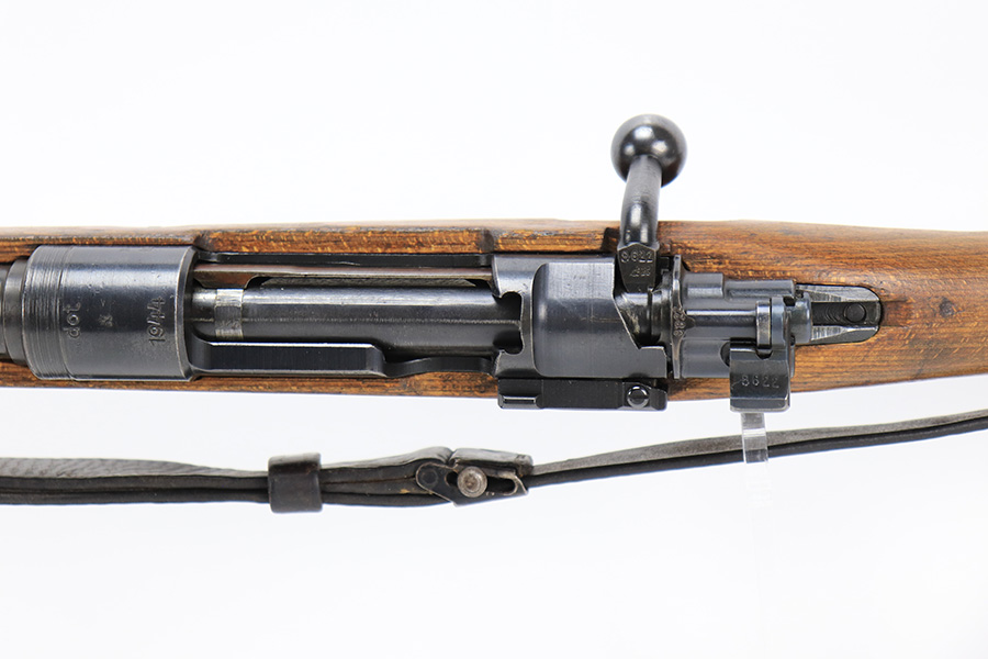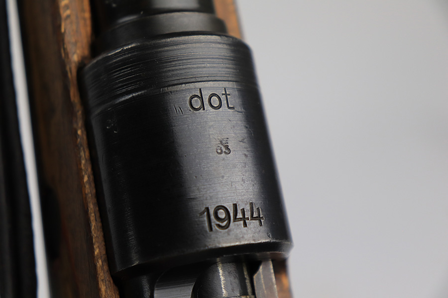 6/1/23 – This is an excellent example of a “dot 44” Waffenwerke Brunn K98 rifle issued to the Nazi military in 1944. It is all matching and has the proper waffen proofs throughout, but the bolt was renumbered to match the rest of the rifle. Comes with an original cleaning rod and leather sling. There are no visible waffen proofs on the stock, but there is a faint “dot” marking on the underside of the butt stock. The metal parts have retained about 95% of their original finish. Generally, there is minor wear around the muzzle and on the high edges in general. Some tiny spots of light oxidation and patina here and there. Light spotty oxidation on the butt plate. No major damage to the wood furniture, but they do show the typical signs of use and wear. Minty bore.