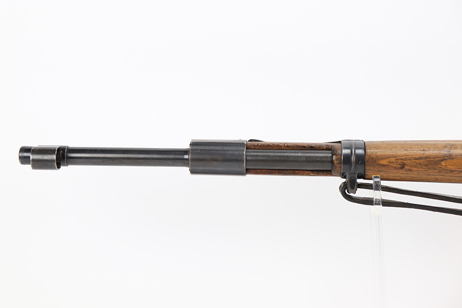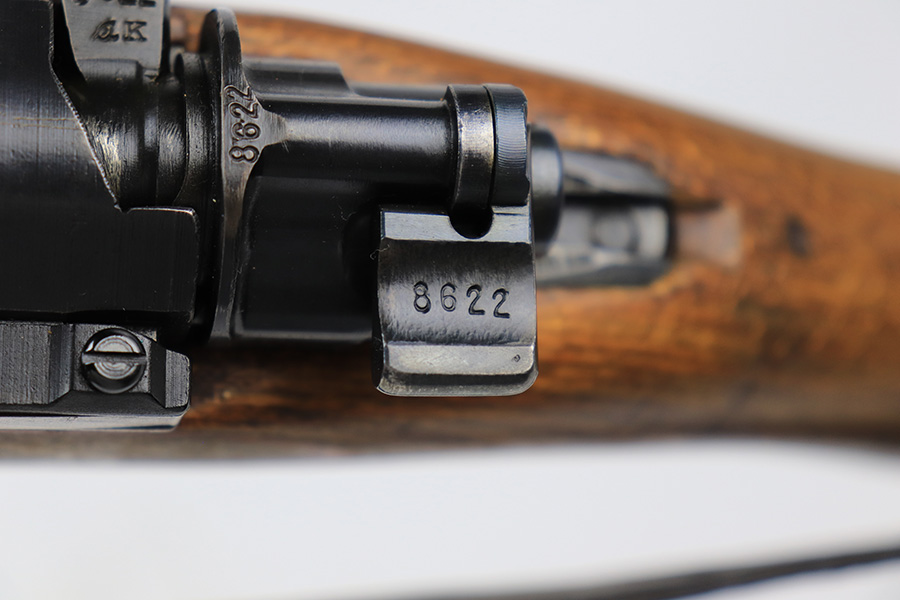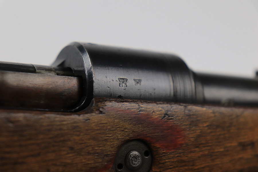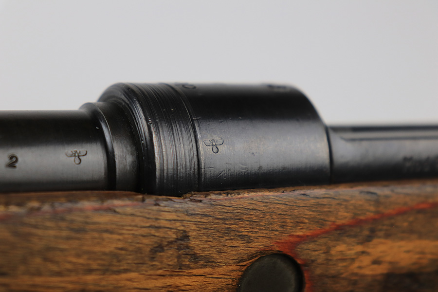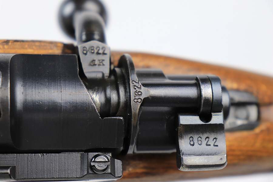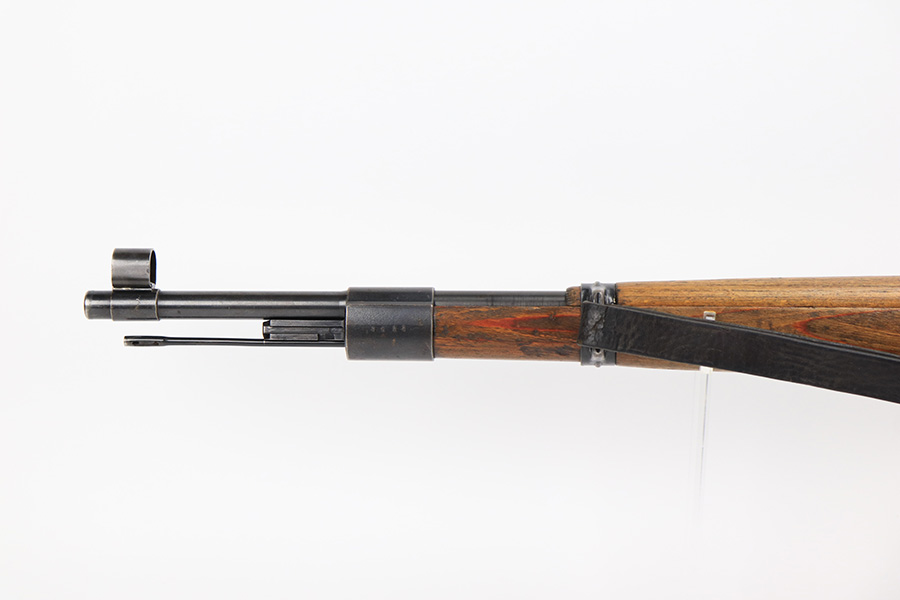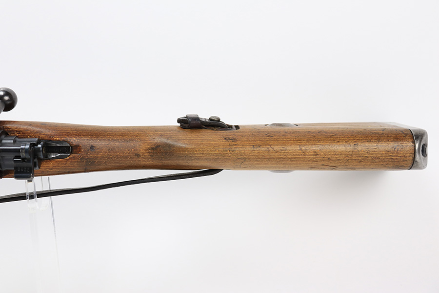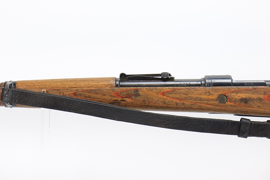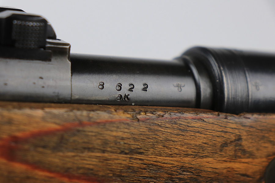 6/1/23 – This is an excellent example of a “dot 44” Waffenwerke Brunn K98 rifle issued to the Nazi military in 1944. It is all matching and has the proper waffen proofs throughout, but the bolt was renumbered to match the rest of the rifle. Comes with an original cleaning rod and leather sling. There are no visible waffen proofs on the stock, but there is a faint “dot” marking on the underside of the butt stock. The metal parts have retained about 95% of their original finish. Generally, there is minor wear around the muzzle and on the high edges in general. Some tiny spots of light oxidation and patina here and there. Light spotty oxidation on the butt plate. No major damage to the wood furniture, but they do show the typical signs of use and wear. Minty bore.