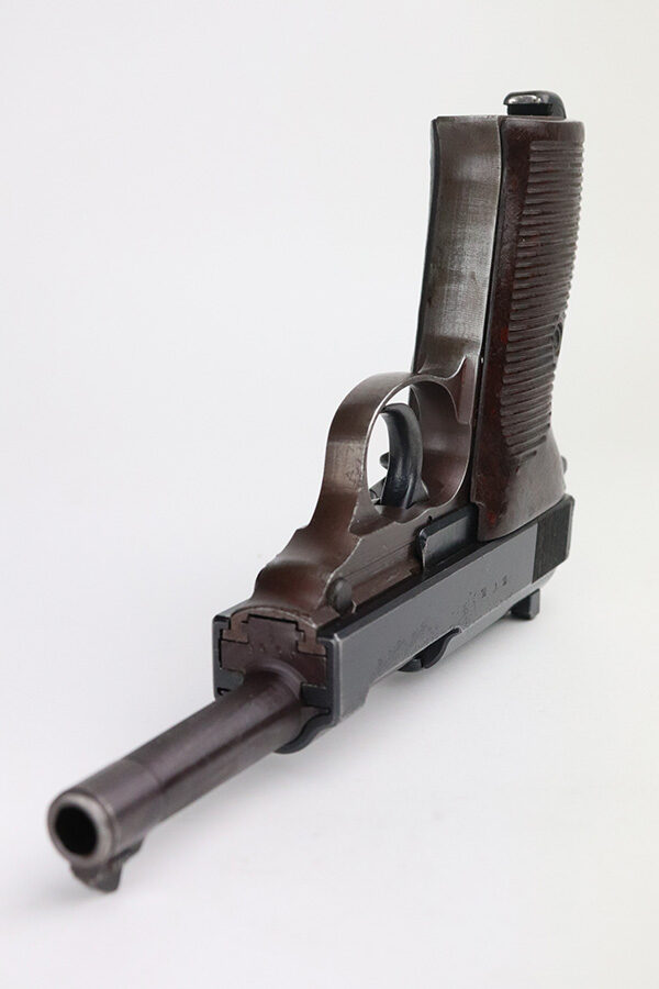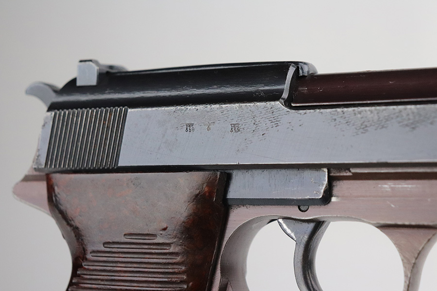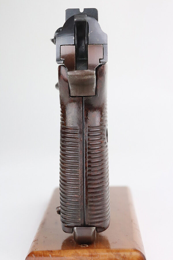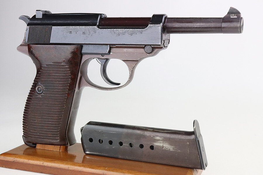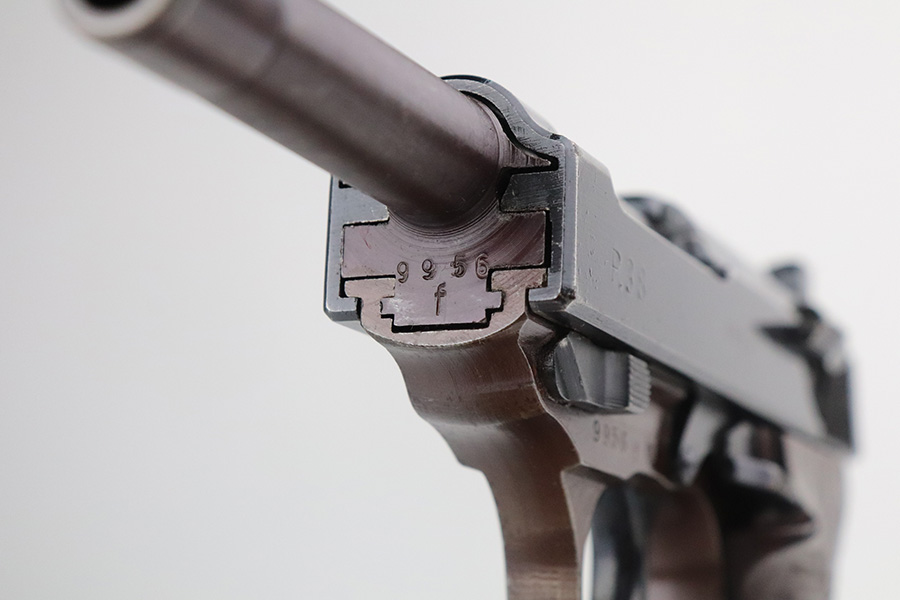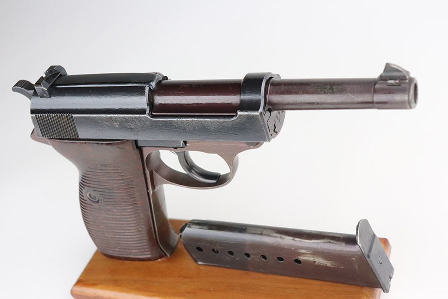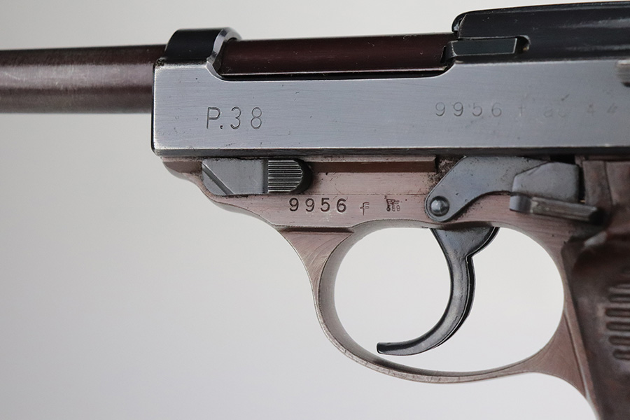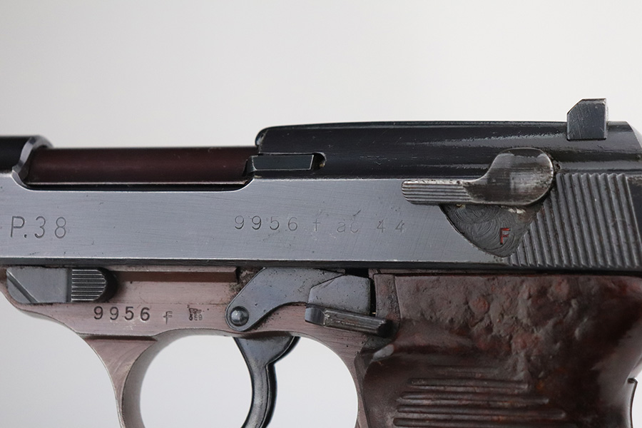 7/30/21 – This is an excellent example of a Walther P.38 issued to the Nazi military in 1944. The gun is all matching and has the proper “Eagle 359” military proofs. The barrel and frame have a really nice plumb color to them. Minor thinning on the front strap and minor wear on the high edges of the slide and around the muzzle. While there is very little actual finish loss, there are areas of noticeable pitting on the right side of the slide and on the barrel. Comes with excellent grips and a Walther magazine. Mint bore. De-cocker is functional.