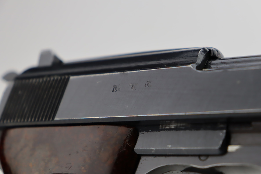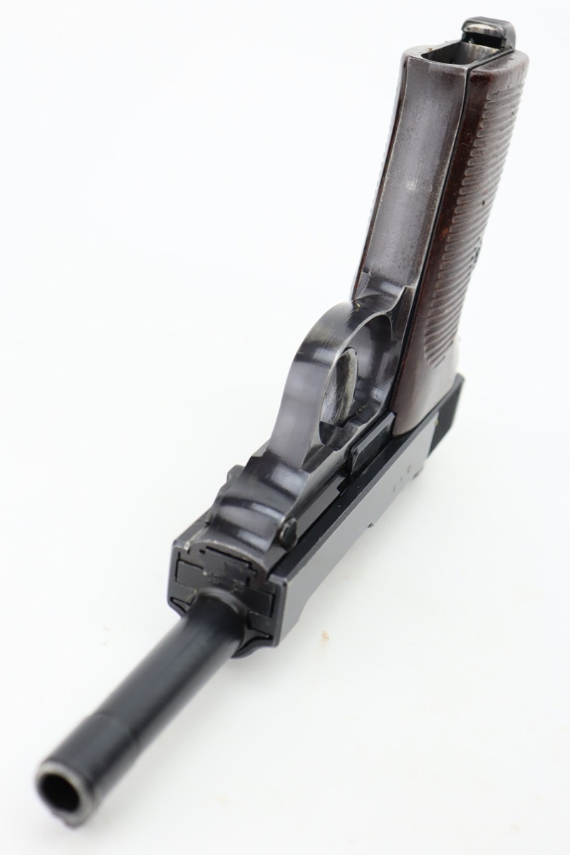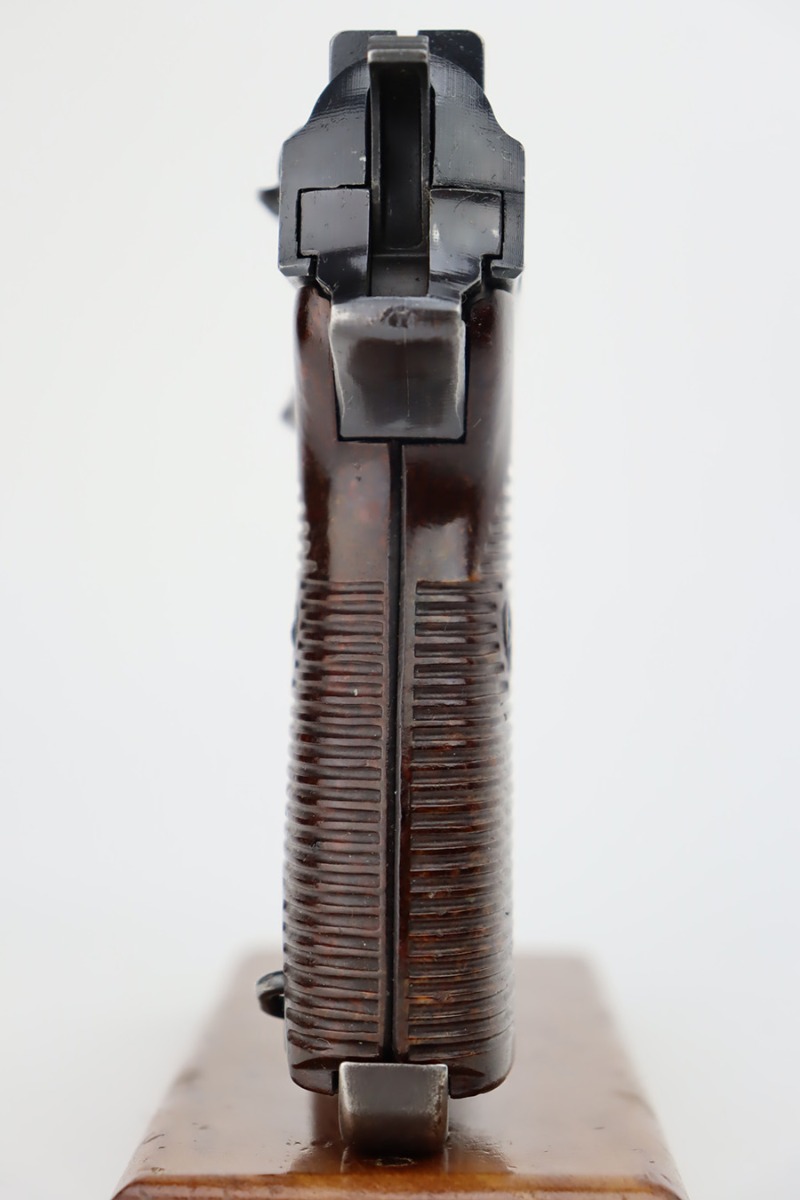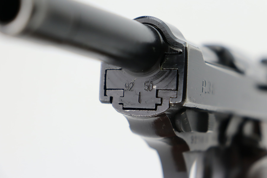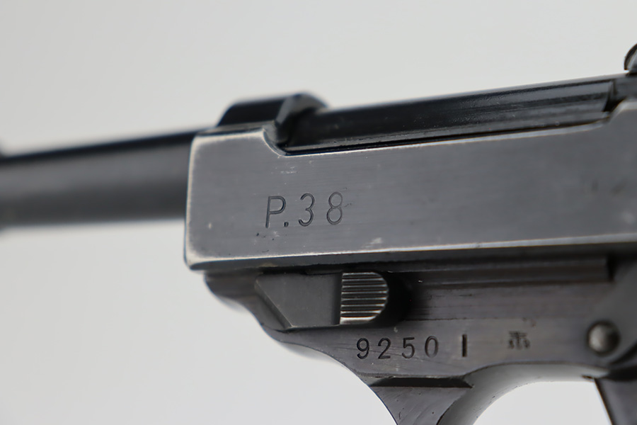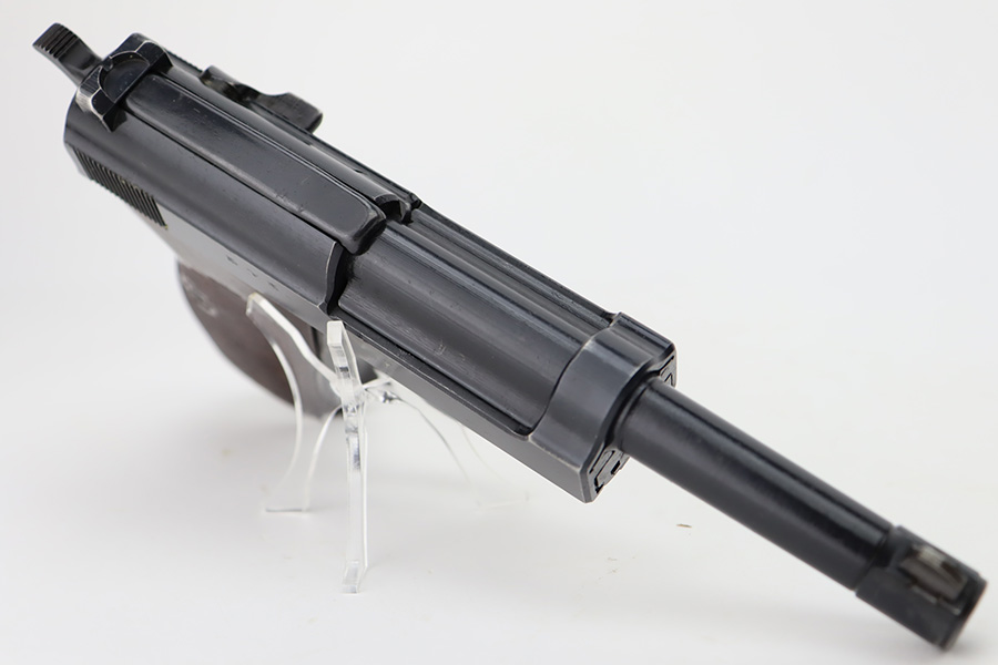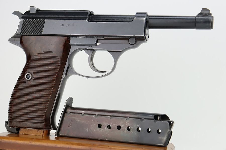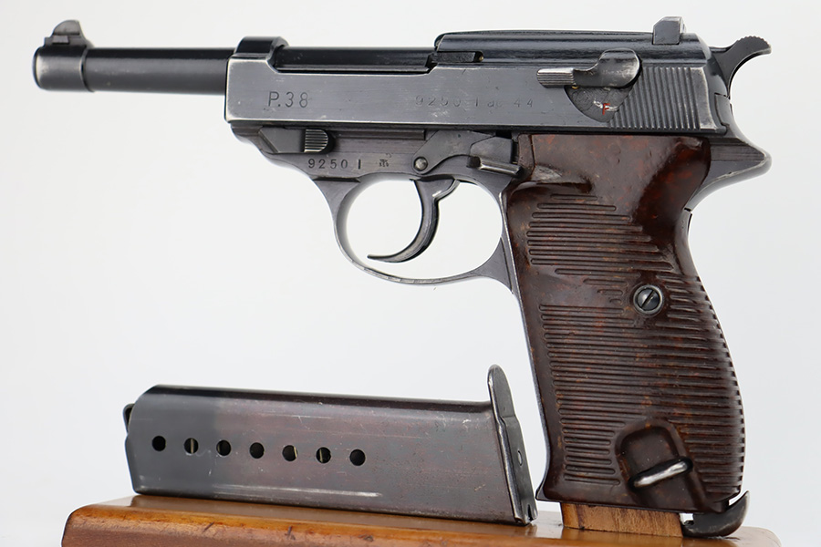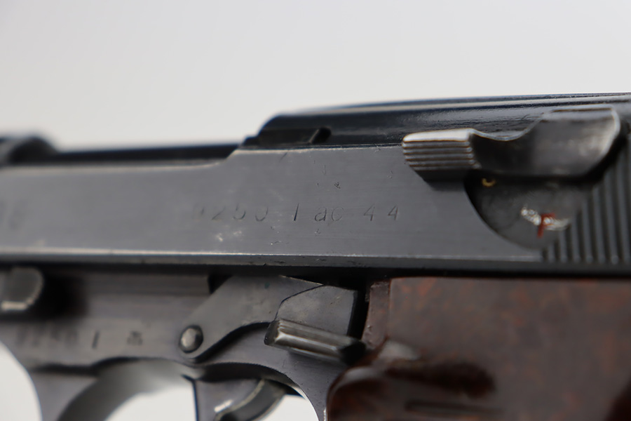 10/10/23 – This is an excellent AC 44 Walther P.38 issued to the Nazi military in 1944. All matching with the proper “Eagle 359” military acceptance proofs throughout. The bluing rates about 95% with minor wear around the muzzle and on the high edges. Very minor thinning and light brown patina on the front strap. Fitted with excellent reddish bakelite grips and an “Eagle 359” marked Walther magazine. Mint bore. De-cocker is functional.