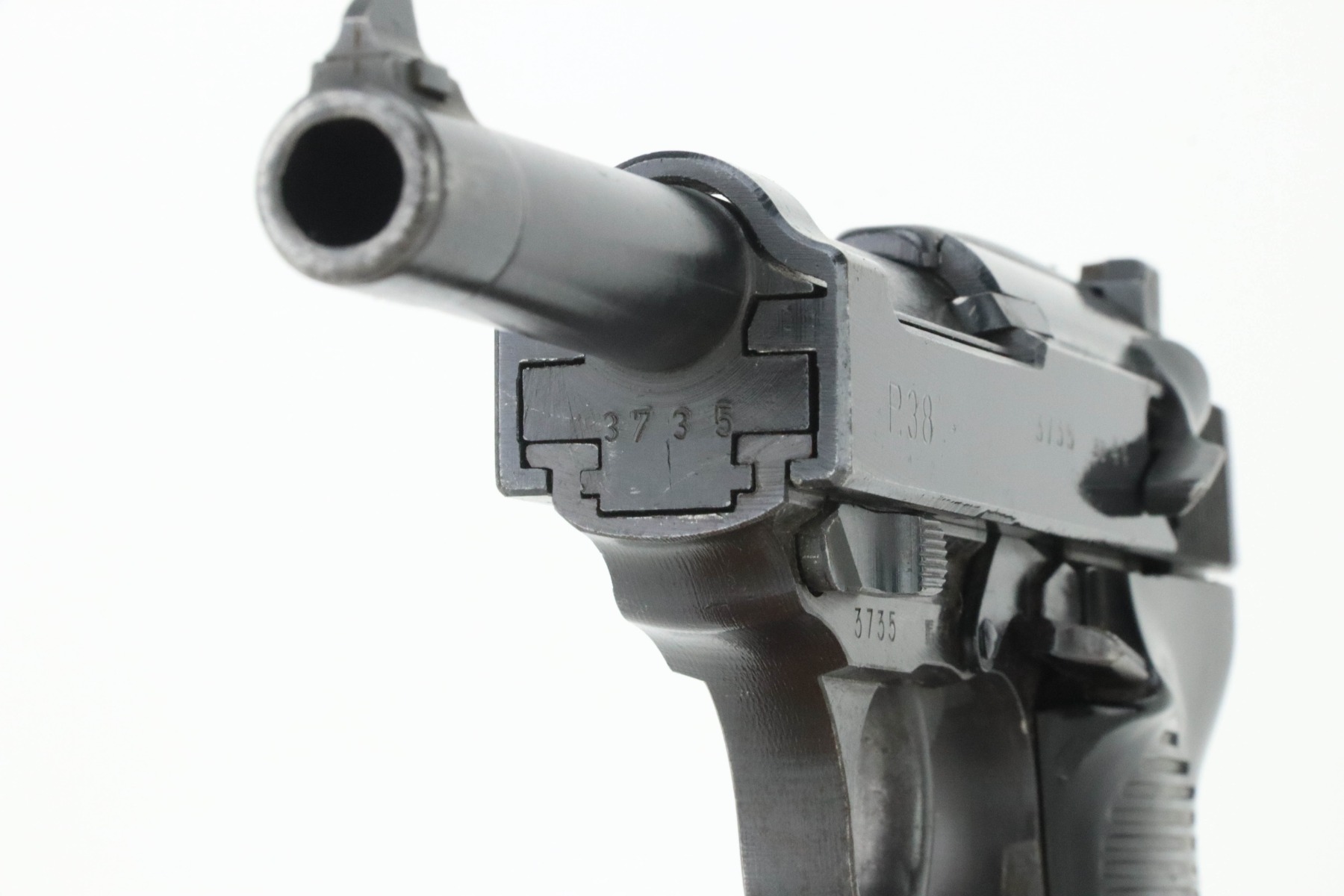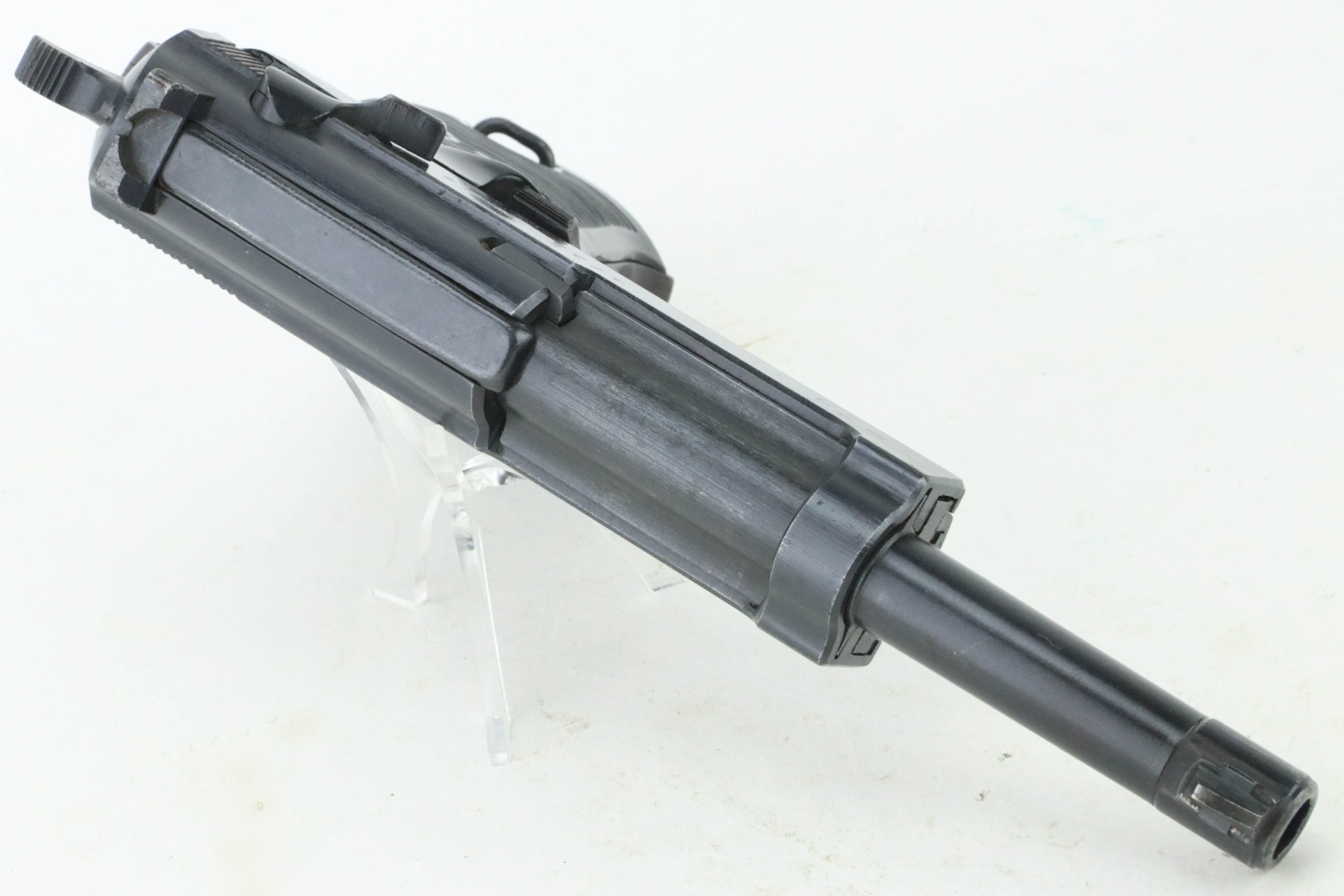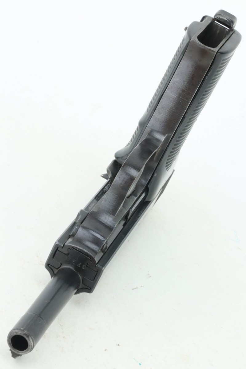 8/23/24 – This is an excellent example of a Walther P.38 issued to the Nazi military in 1944. It is all matching and has the proper “Eagle 359” Nazi military acceptance proofs. It has retained about 97-98% of its original finish. There are just hints of wear around the muzzle and on some of the high edges and some areas of very light freckling here and there. Fitted with proper blackish-brown bakelite grips – the tops have been slightly shaved down. Comes with an un-marked magazine. Mint bore. The de-cocker is not functional.