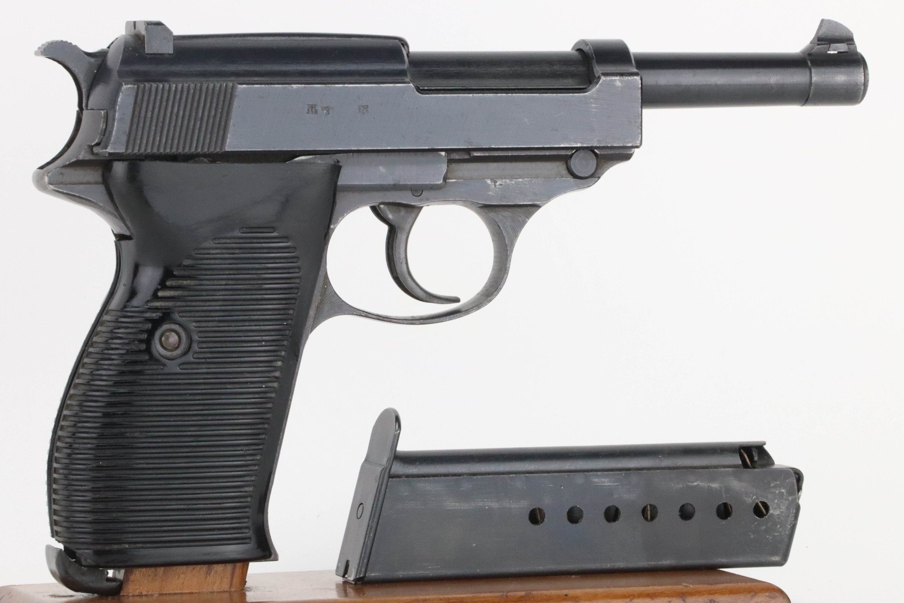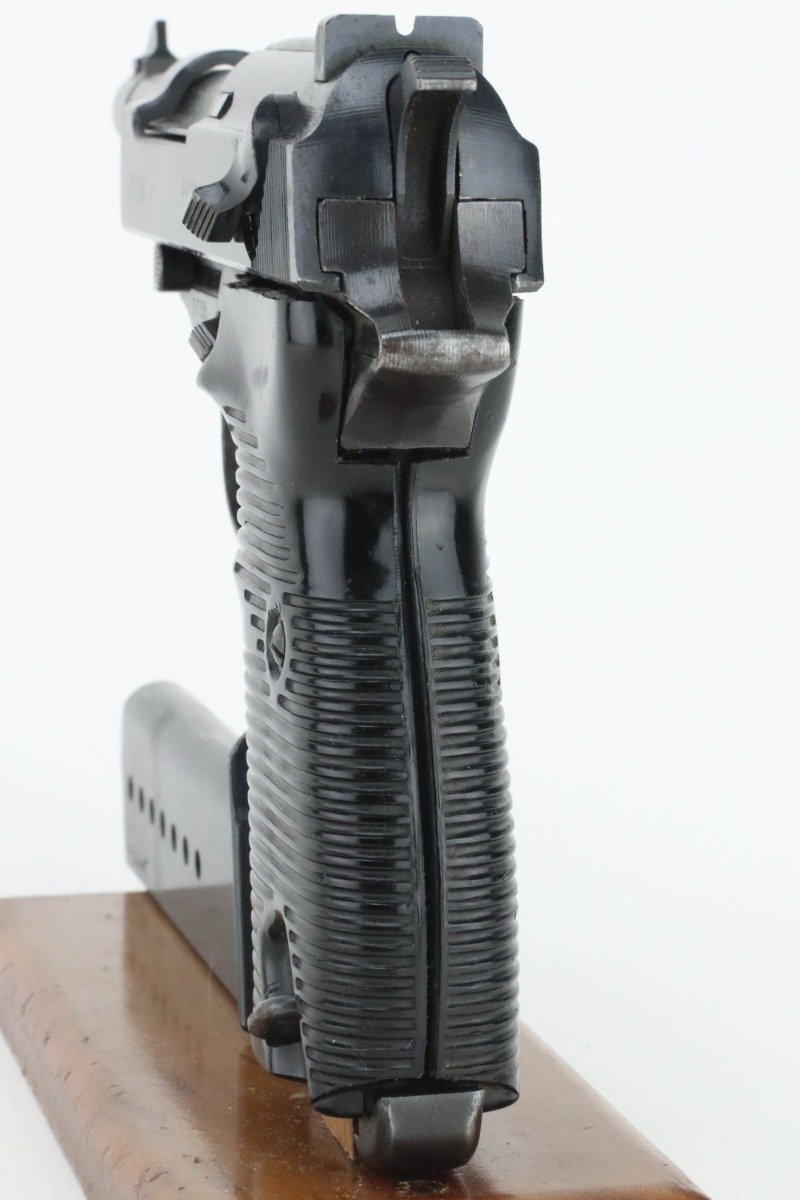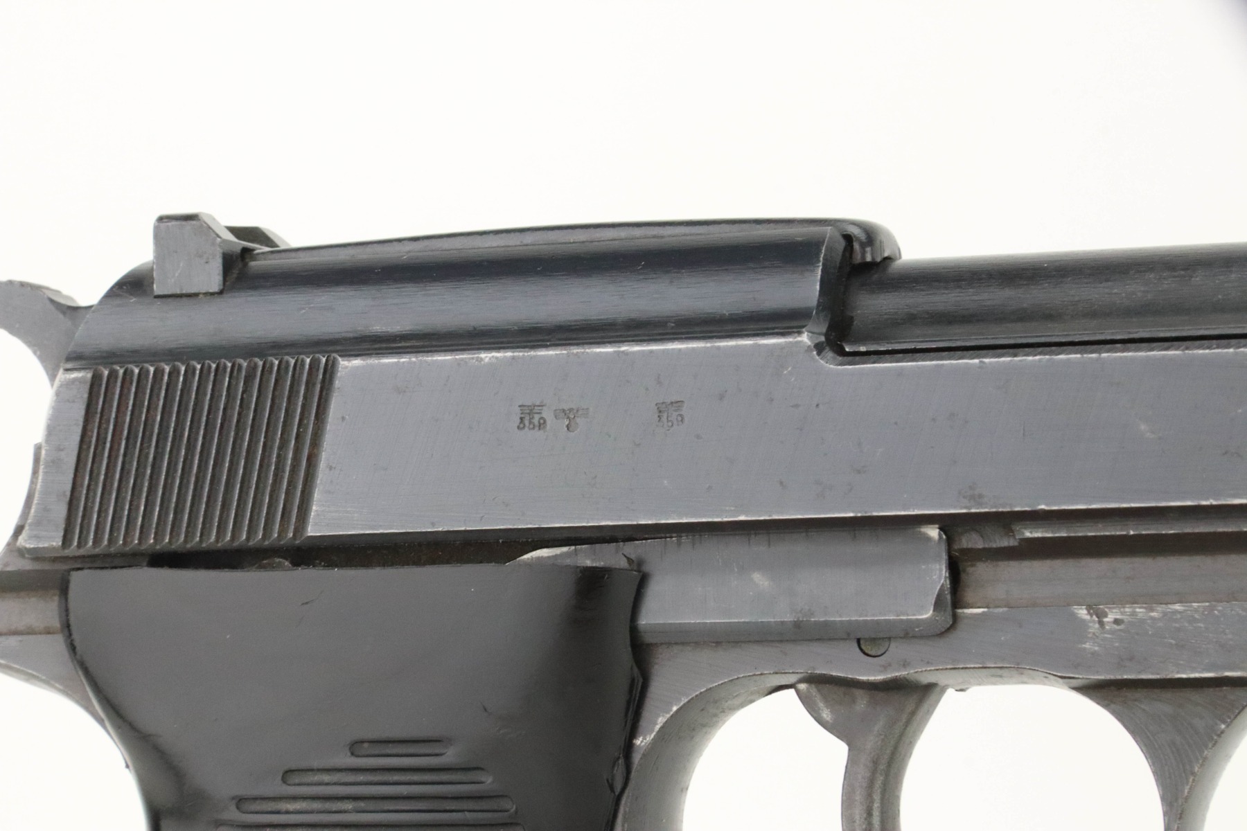 8/23/24 – This is an excellent example of a Walther P.38 issued to the Nazi military in 1944. It is all matching and has the proper “Eagle 359” Nazi military acceptance proofs. It has retained about 97-98% of its original finish. There are just hints of wear around the muzzle and on some of the high edges and some areas of very light freckling here and there. Fitted with proper blackish-brown bakelite grips – the tops have been slightly shaved down. Comes with an un-marked magazine. Mint bore. The de-cocker is not functional.