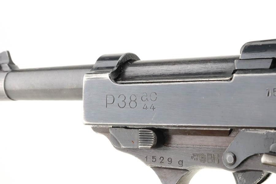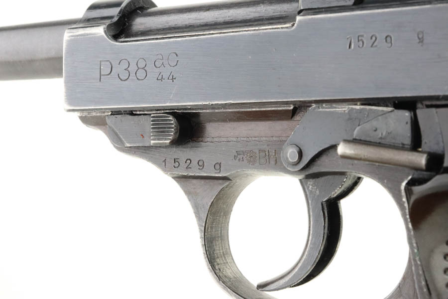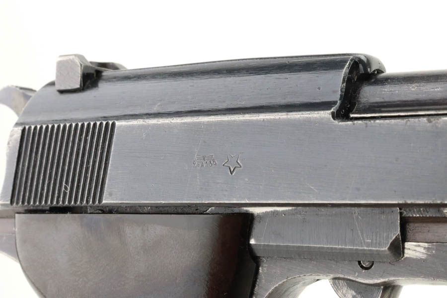 05/30/2024 – For sale is a unique Walther P.38 made in 1944 but was assembled after WW2. The handgun has been assembled after the factory was occupied by French Forces and inspected by French inspectors as noted by the star stamped on the barrel, slide, frame, and locking block. The handgun is an overall 98% condition with edge wear visible on the slide from holster use. The handgun is all matching. The slide is made by FN as characterized by the large “P.38 ac44” stamp. The frame is stamped with “BH” above the trigger guard which denotes Austrian Army property. The bore is very bright with good rifling. The plastic grips are in good condition and the pistole comes with 1 magazine stamped “Eagle/WaA135.”