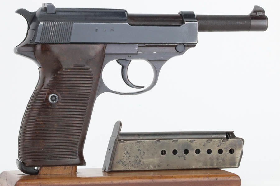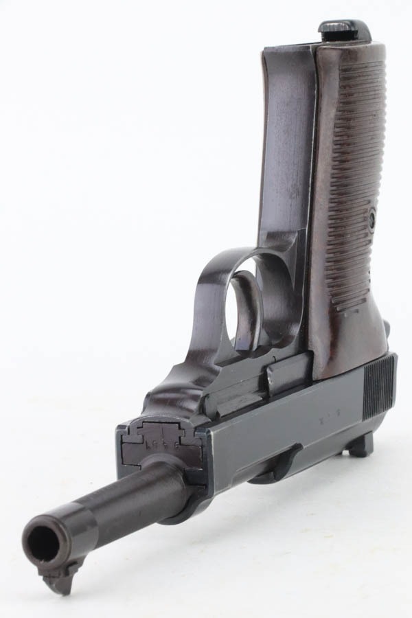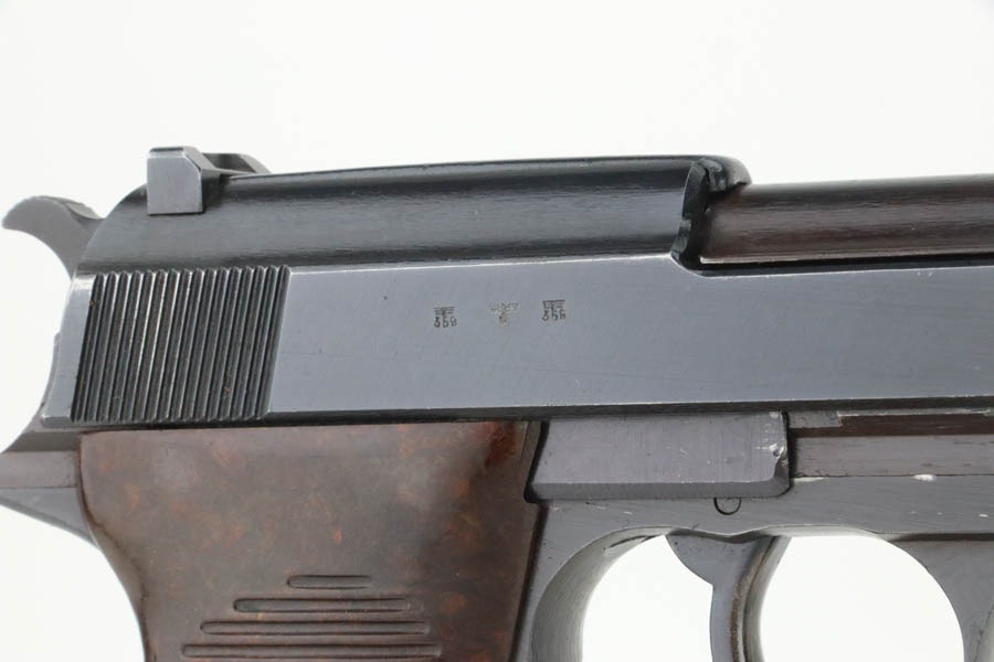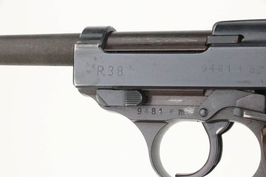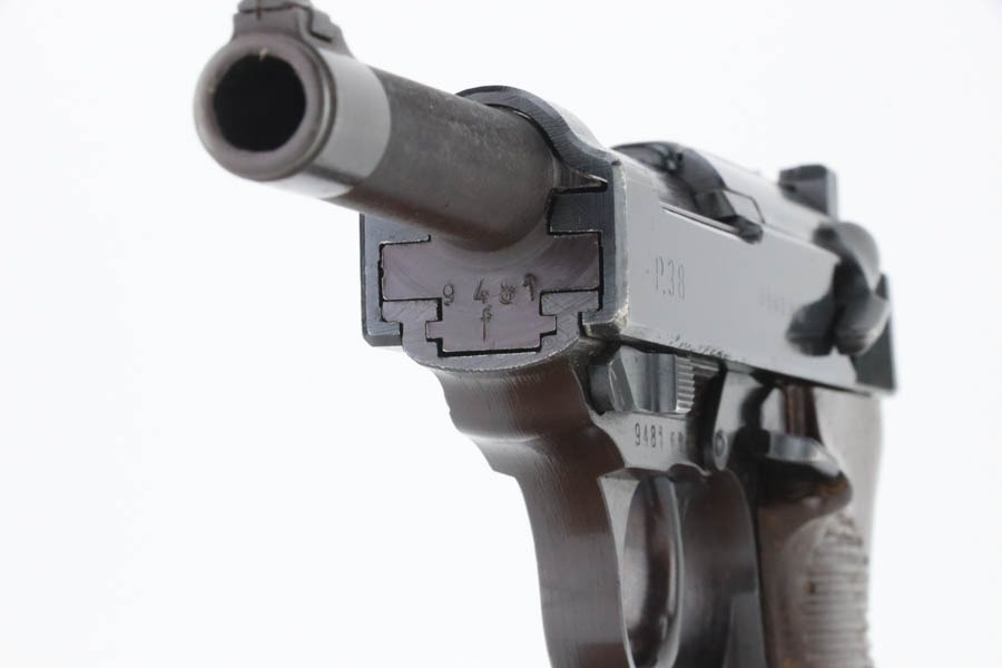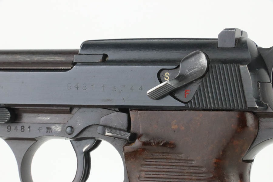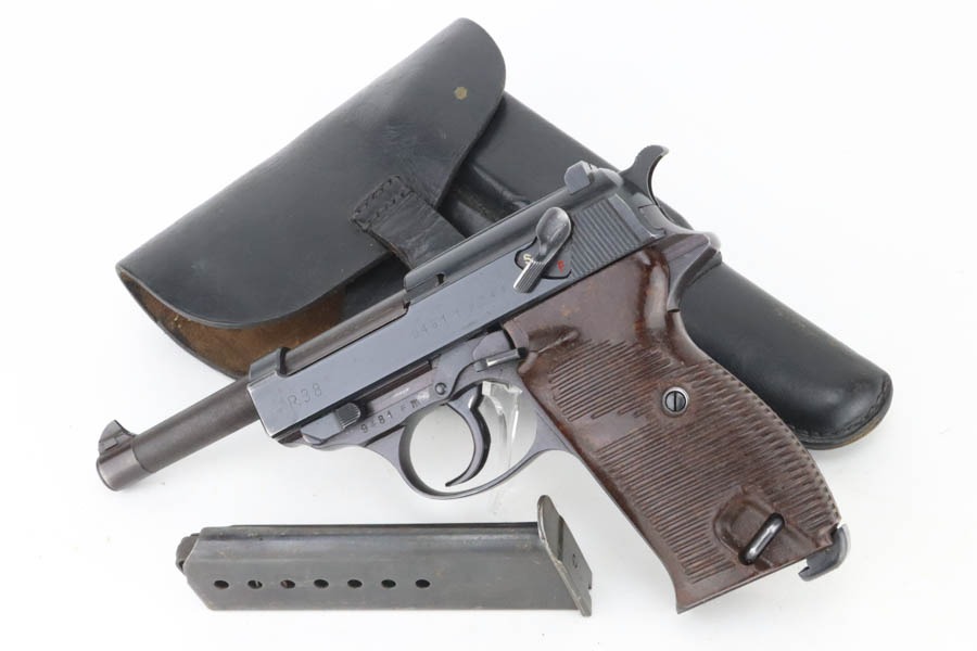 11/25/24 – This is an excellent example of an AC 44 Walther P.38 issued to the Nazi military in 1944. All matching with the proper “Eagle 359” military acceptance proofs. It has retained about 96-97% of its original finish with just very minor wear around the muzzle and on the front edges of the slide. Fitted with period-correct reddish bakelite grips. Excellent bore with great rifling. De-cocker is functional. Comes as a rig with a very nice black leather holster and one “Waffen 706” jvd marked magazine.