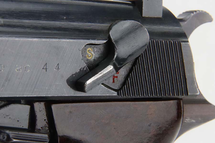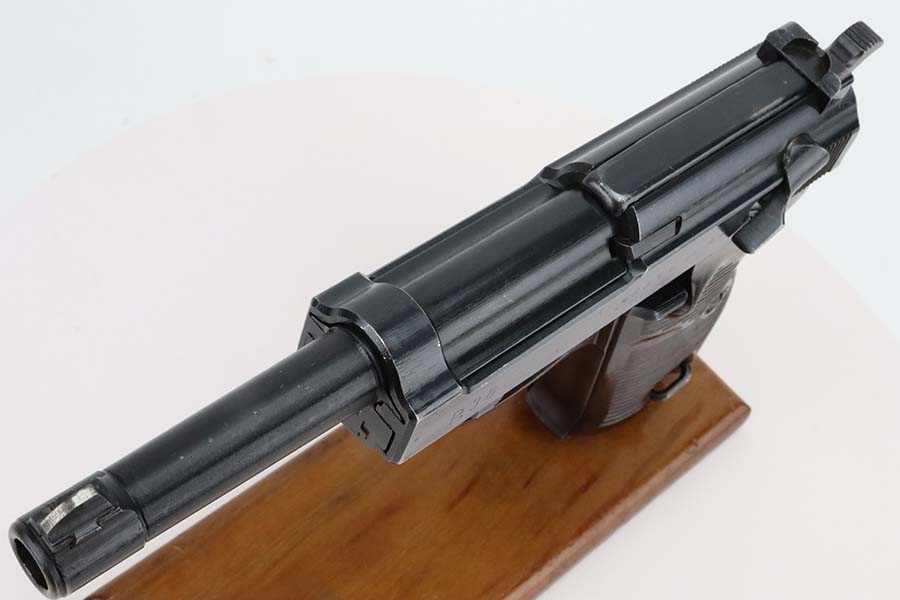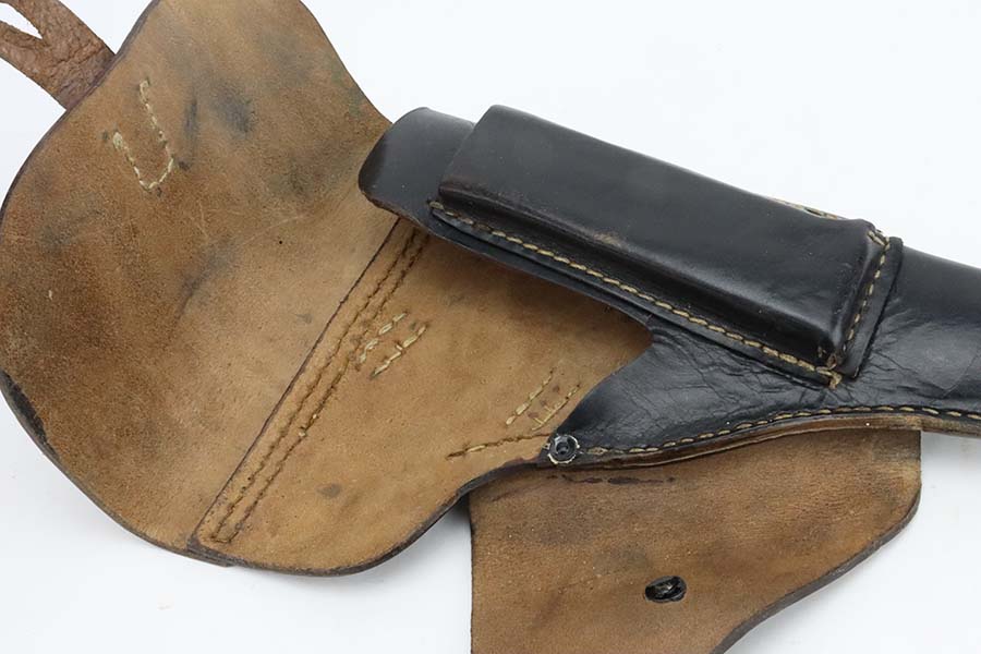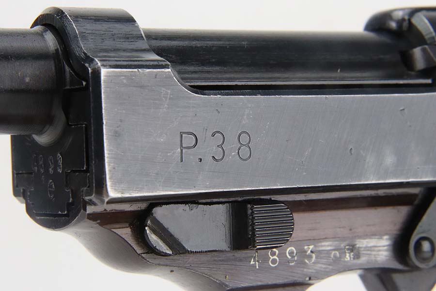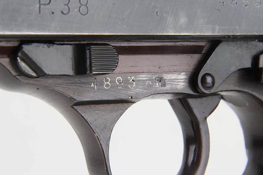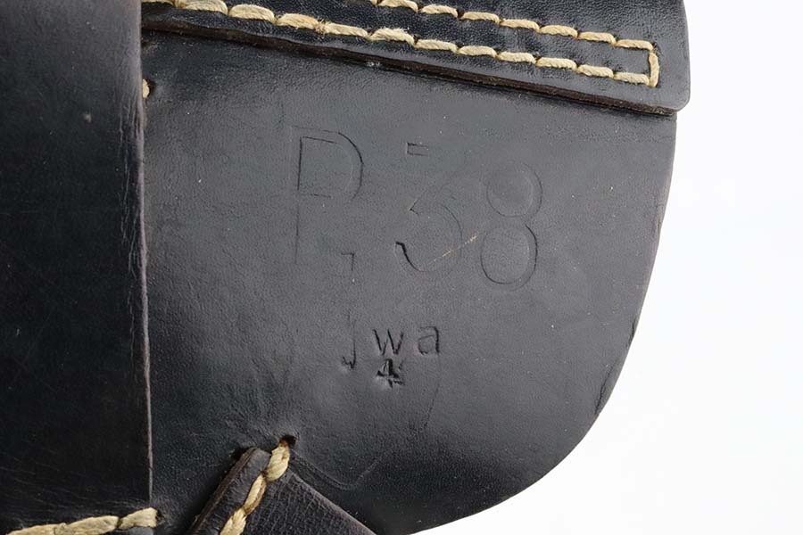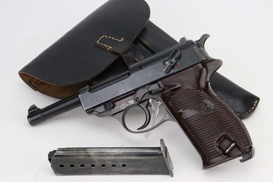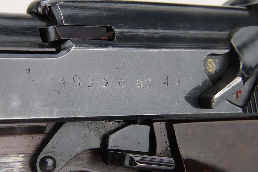3/4/24 – This is an excellent example of an AC 44 Walther P.38 issued to the Nazi military in 1944. All matching with the proper “Eagle 359” military acceptance proofs. It comes as a rig with an un-issued 1944-dated holster and an “Eagle 359” marked Walther magazine. The gun itself has retained about 96% of its original finish with general minor high edge wear and very light thinning on the front strap. Fitted with period-correct reddish bakelite grips. The bore has good rifling, but there are a few small spots of pitting. De-cocker is not functional.