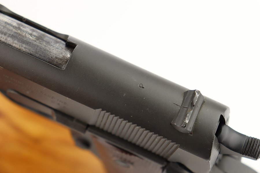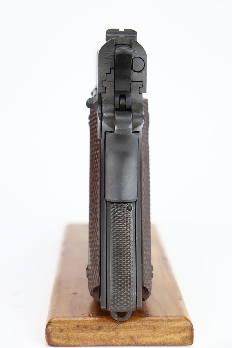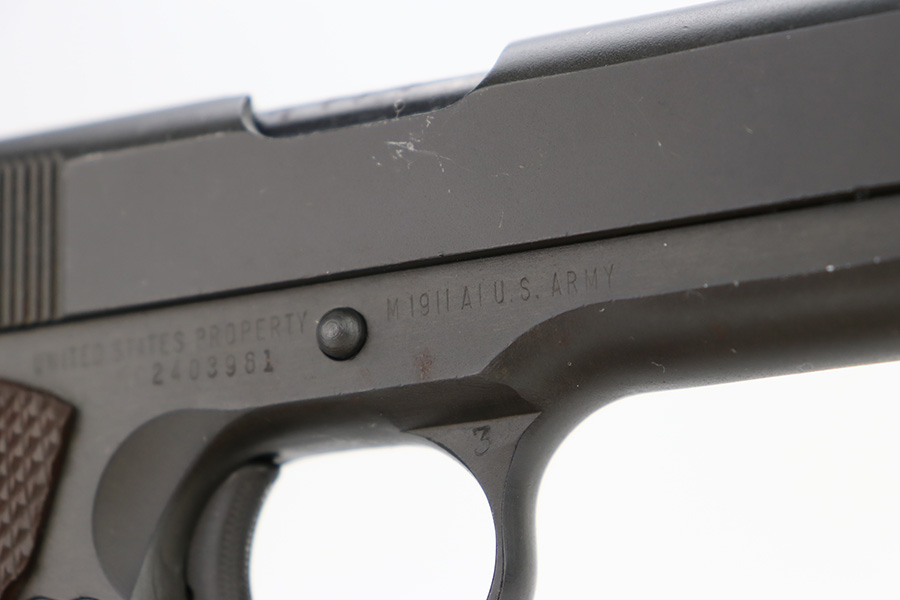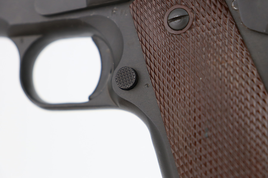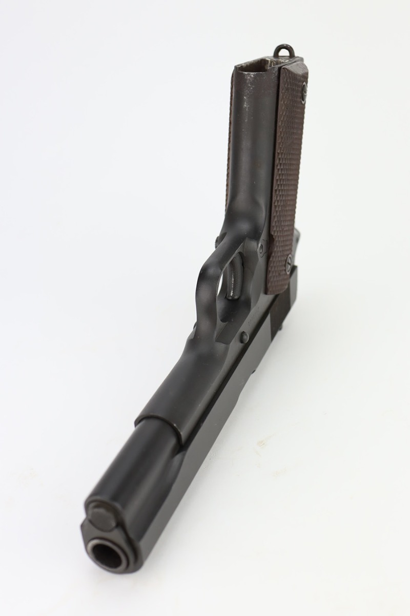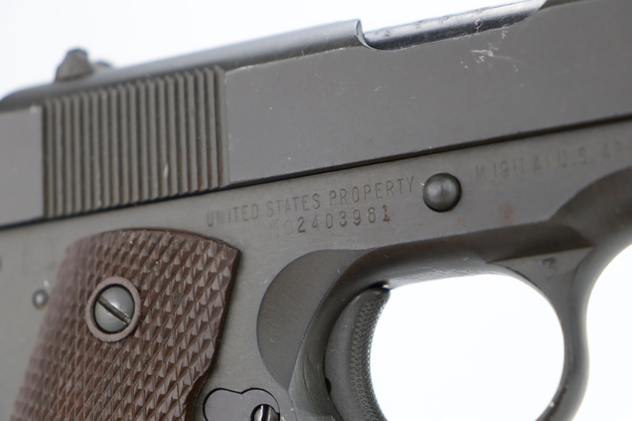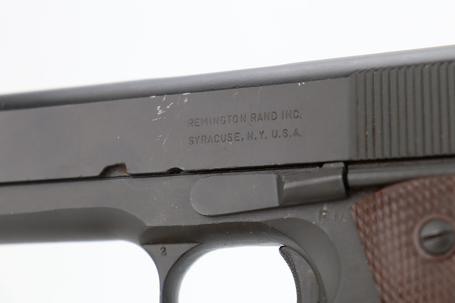 12/1/23 – This is an excellent Remington Rand Model 1911A1 issued to the US military in 1945. The mainspring housing has been replaced. Period-correct High Standard barrel. It has retained nearly all of its parkerized finish with just a few tiny handling marks on the left side of the slide and a small area of surface rust at the base of the front strap. Fitted with period-correct reddish plastic grips and comes with one proper magazine. The rifling in the bore is worn with pitting throughout.