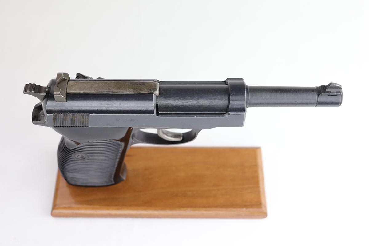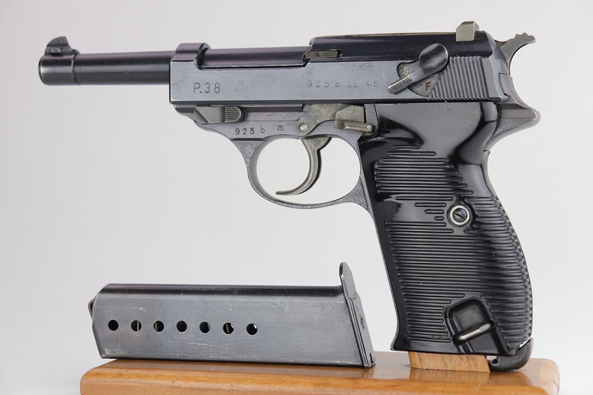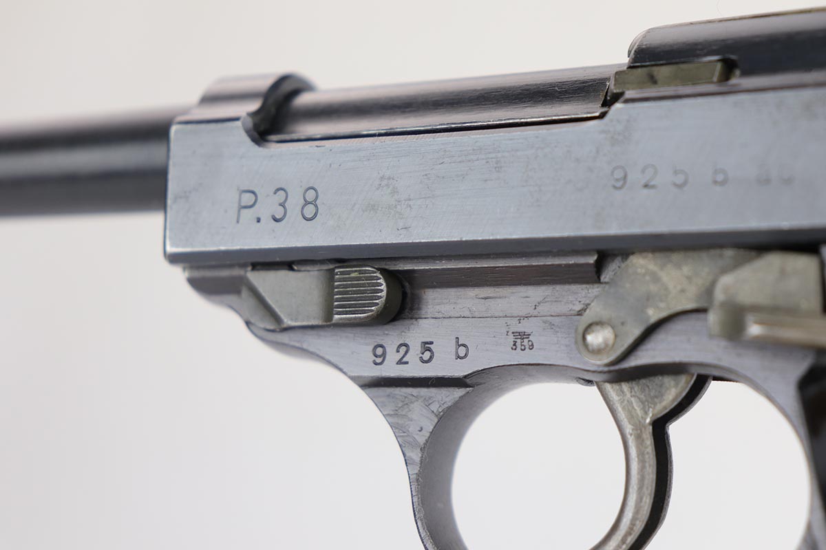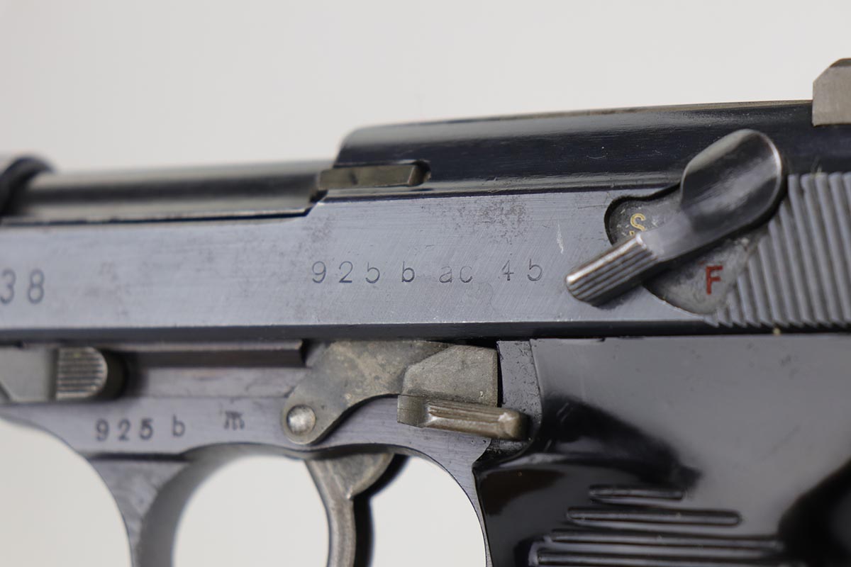 3/5/20 – This is an excellent Nazi Walther P.38 from March of 1945. It’s all matching and original with 95-97% blue remaining. The profile view shows minor muzzle and high edge wear, and most of the finish loss/patina is on the front strap. Nice mix of blued parts with phosphate small parts. Mint bore. Excellent grips.