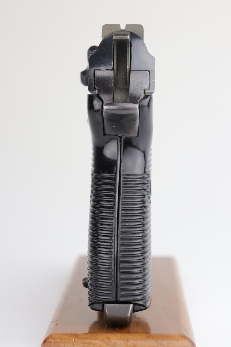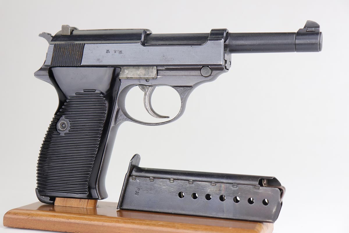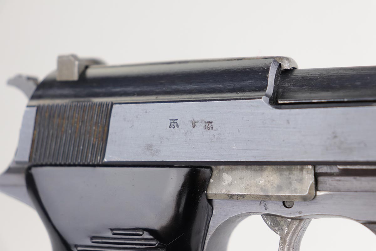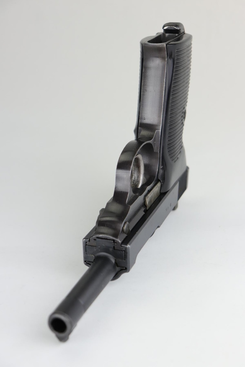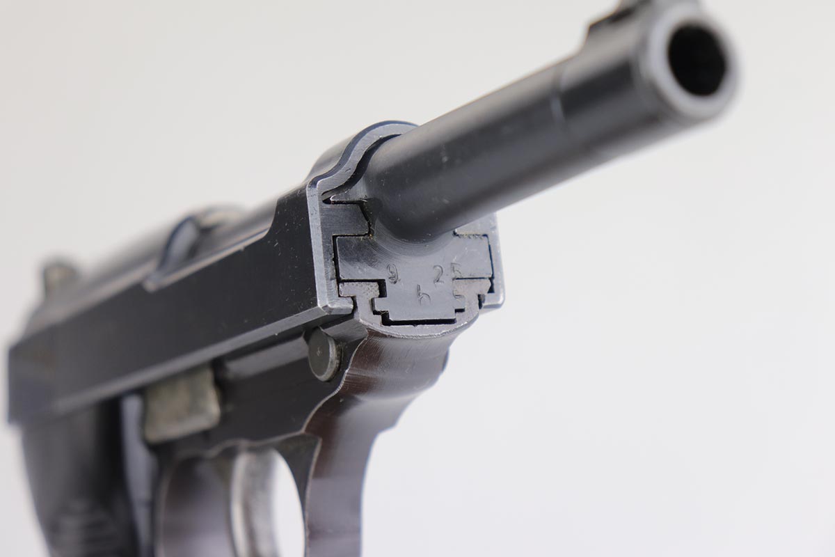 3/5/20 – This is an excellent Nazi Walther P.38 from March of 1945. It’s all matching and original with 95-97% blue remaining. The profile view shows minor muzzle and high edge wear, and most of the finish loss/patina is on the front strap. Nice mix of blued parts with phosphate small parts. Mint bore. Excellent grips.