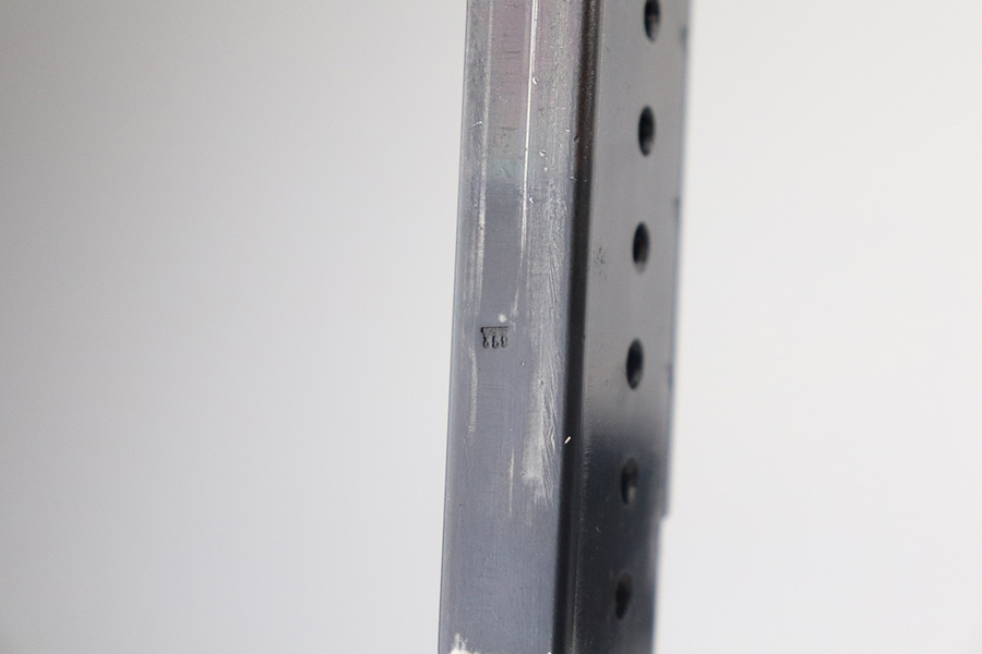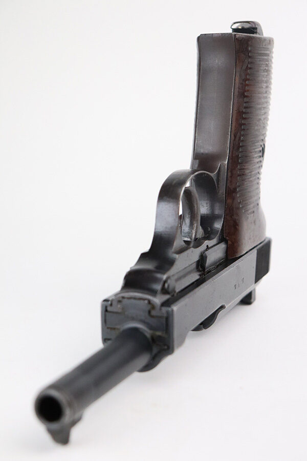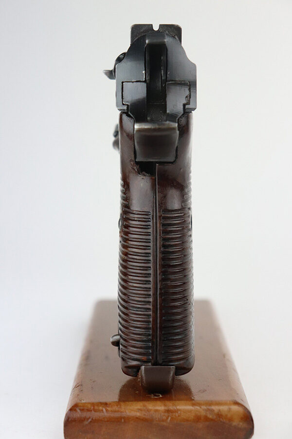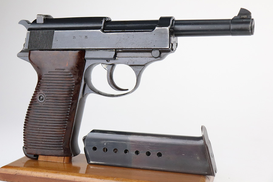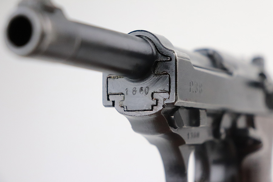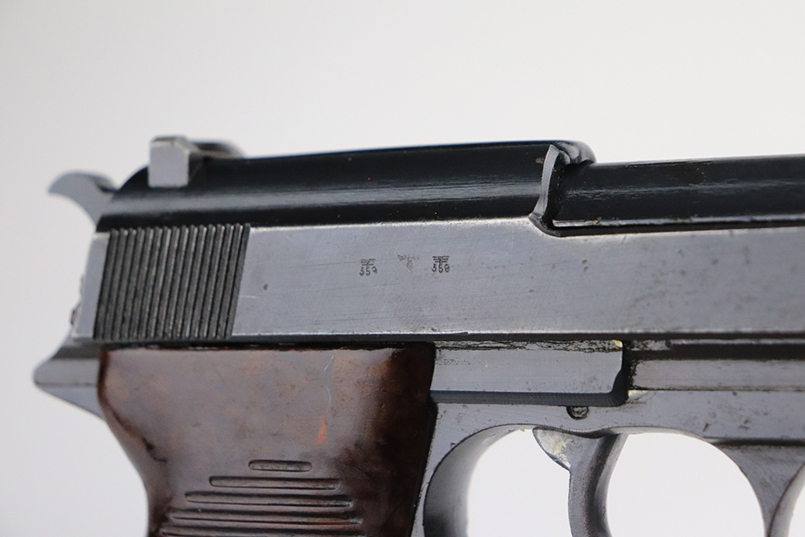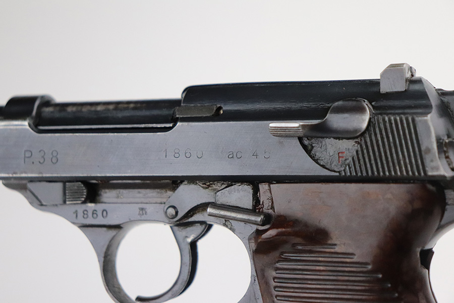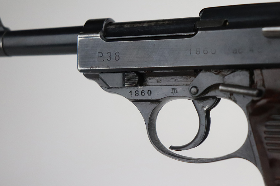 7/3/21 – This is an excellent example of a Walther P.38 issued to the Nazi military in 1945. It is all matching and has the proper “Eagle 359” military proofs. This one also has a asterisk proof on the left side of the slide, indicating it failed initial inspection and was sent back to the factory for repair. It has retained about 95-96% of its original finish. There areas of minor wear on the high edges of the slide, on the top of the barrel through the ejection port, around the muzzle, and on the underside of the trigger guard. Just a hint of thinning and patina on the front strap. Tiny freckles on the right side of the slide. Comes with excellent grips and a period-correct Walther magazine. Minty bore. De-cocker is functional.