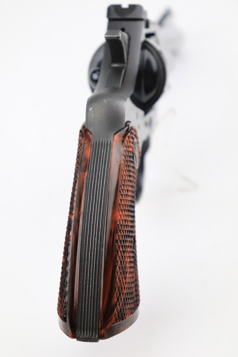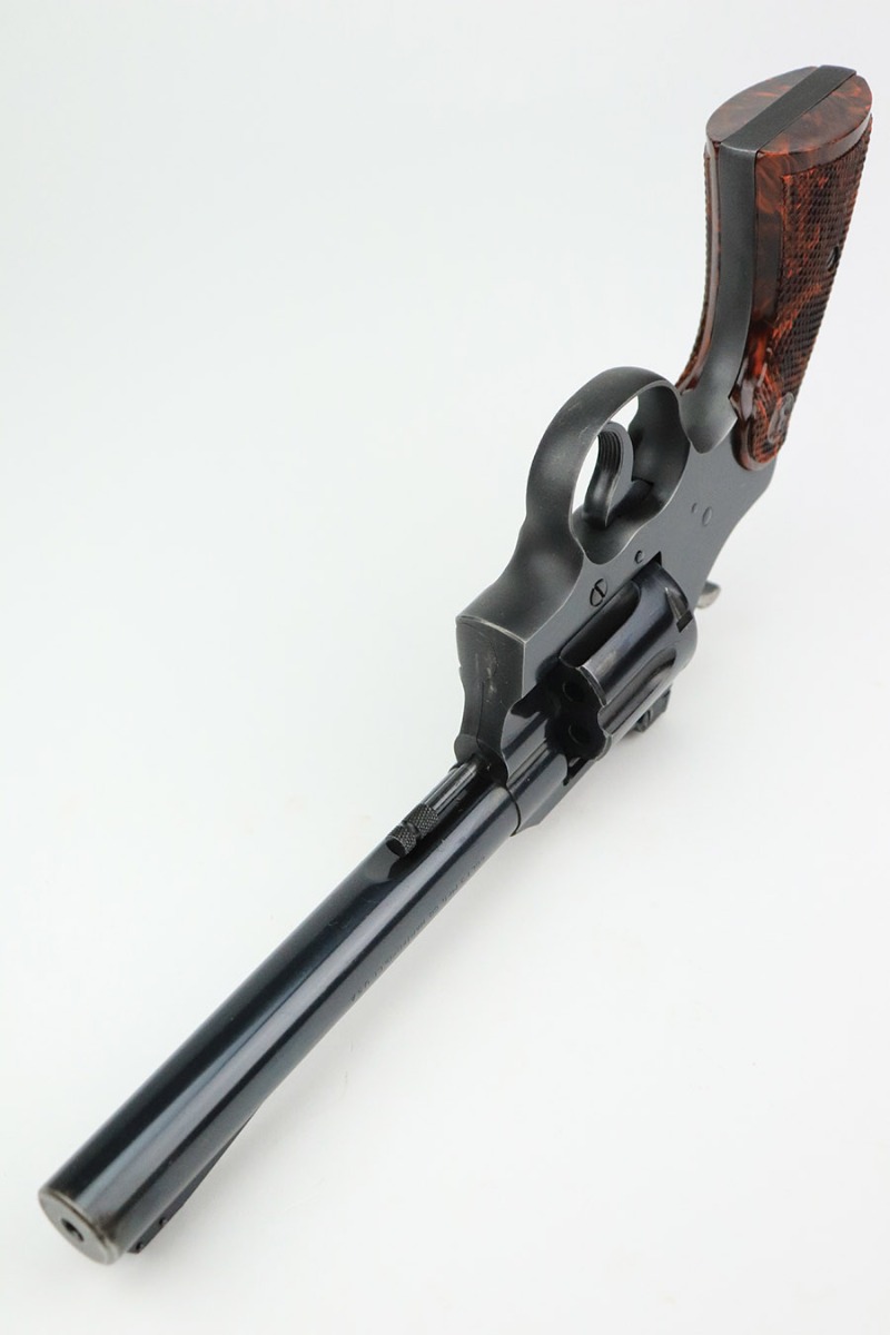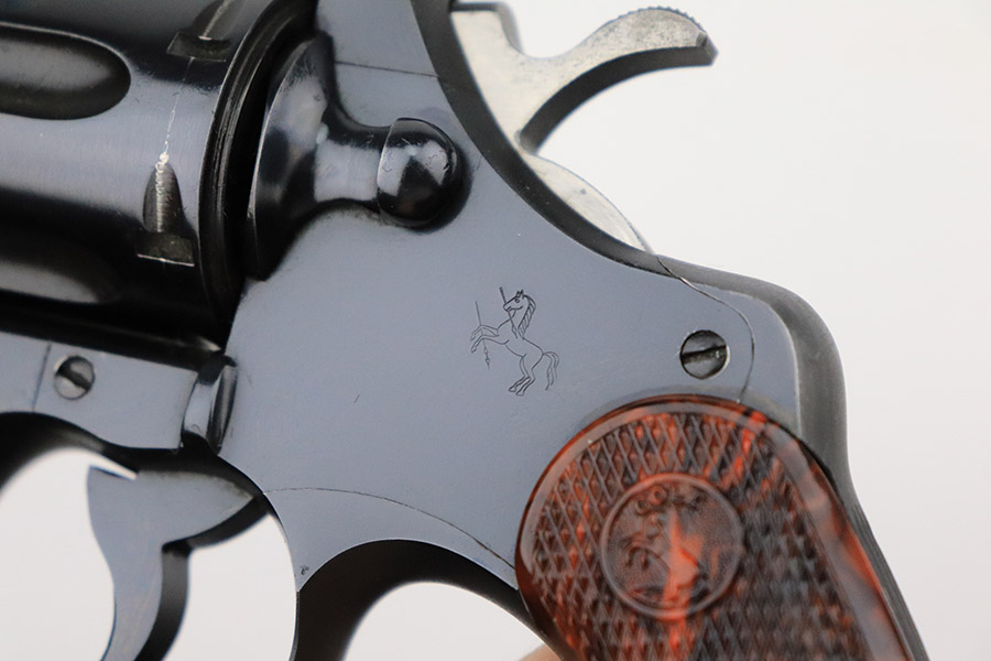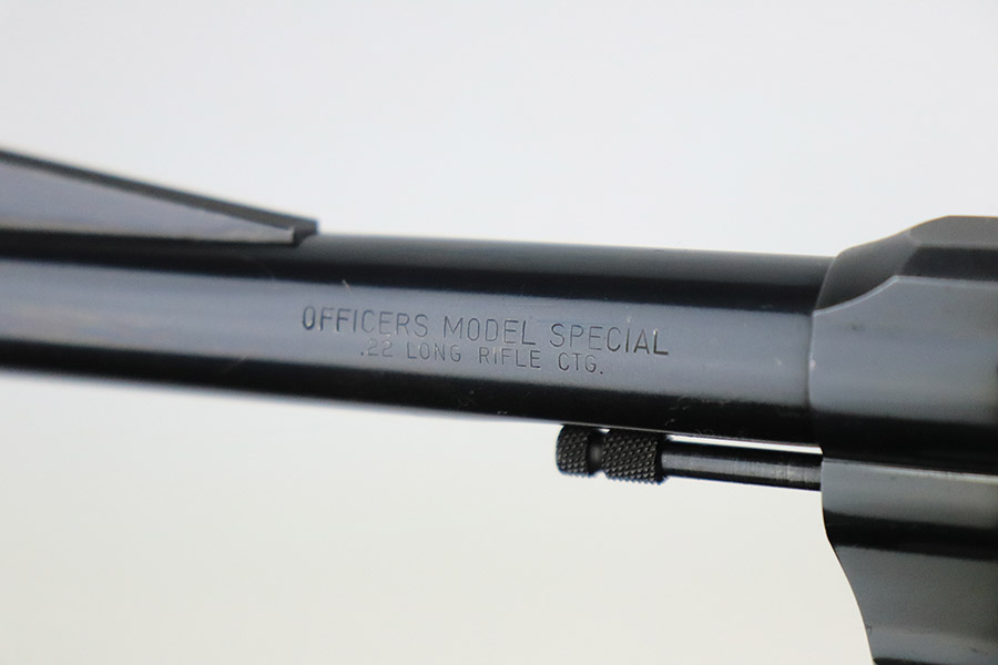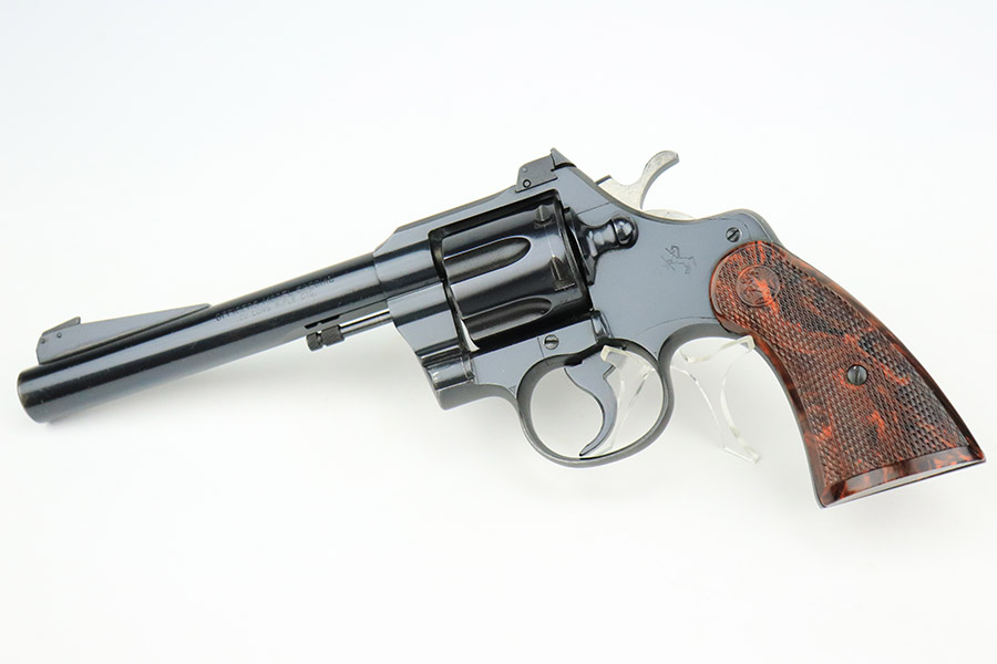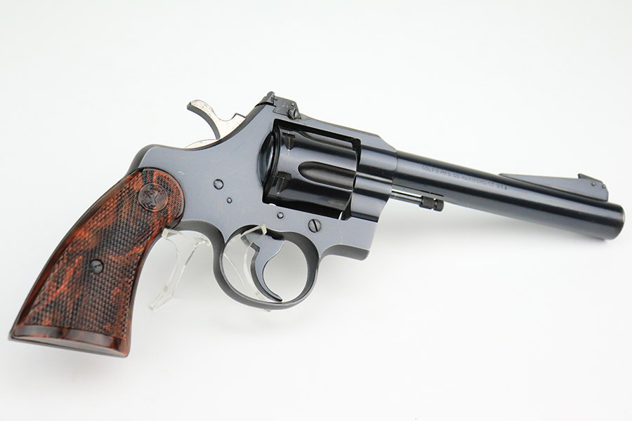 11/16/22 – This is an excellent example of a Colt Officers Model Special Revolver, manufactured in 1950 and chambered in .22 LR. It is all matching and has retained about 97% of its original bluing. There is minor wear around the muzzle, very minor thinning on the grip straps, a very light roll mark on the cylinder, and a few very light handling marks along the barrel. Comes with beautiful marbled brown and black plastic grips. Mint bore. The cylinder is tight, and the action is smooth.