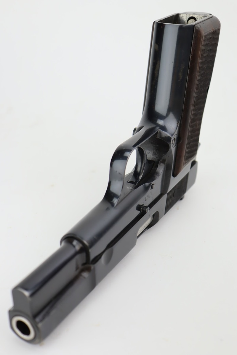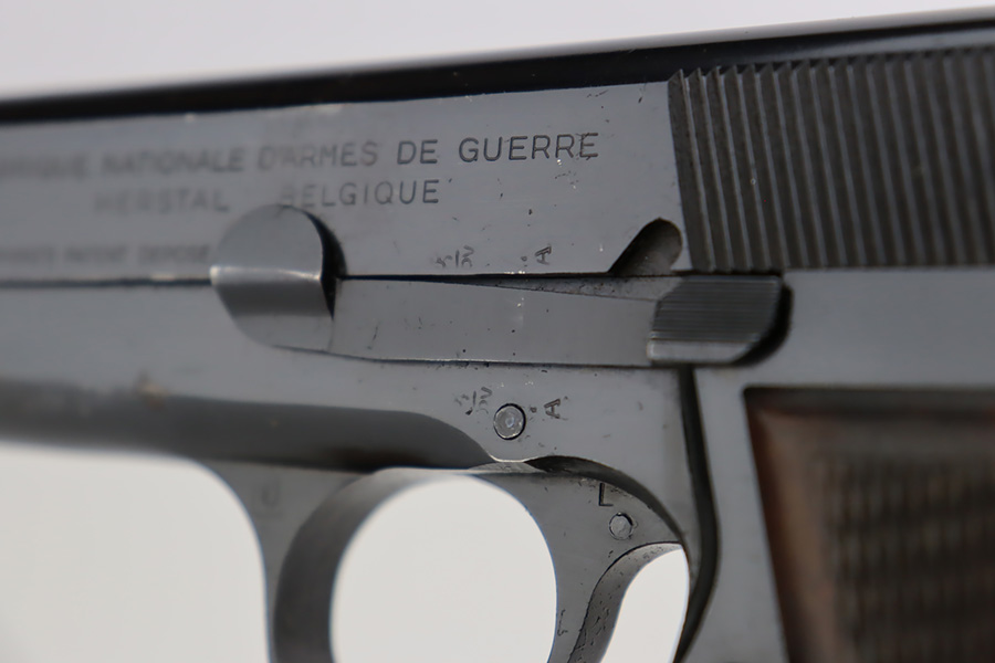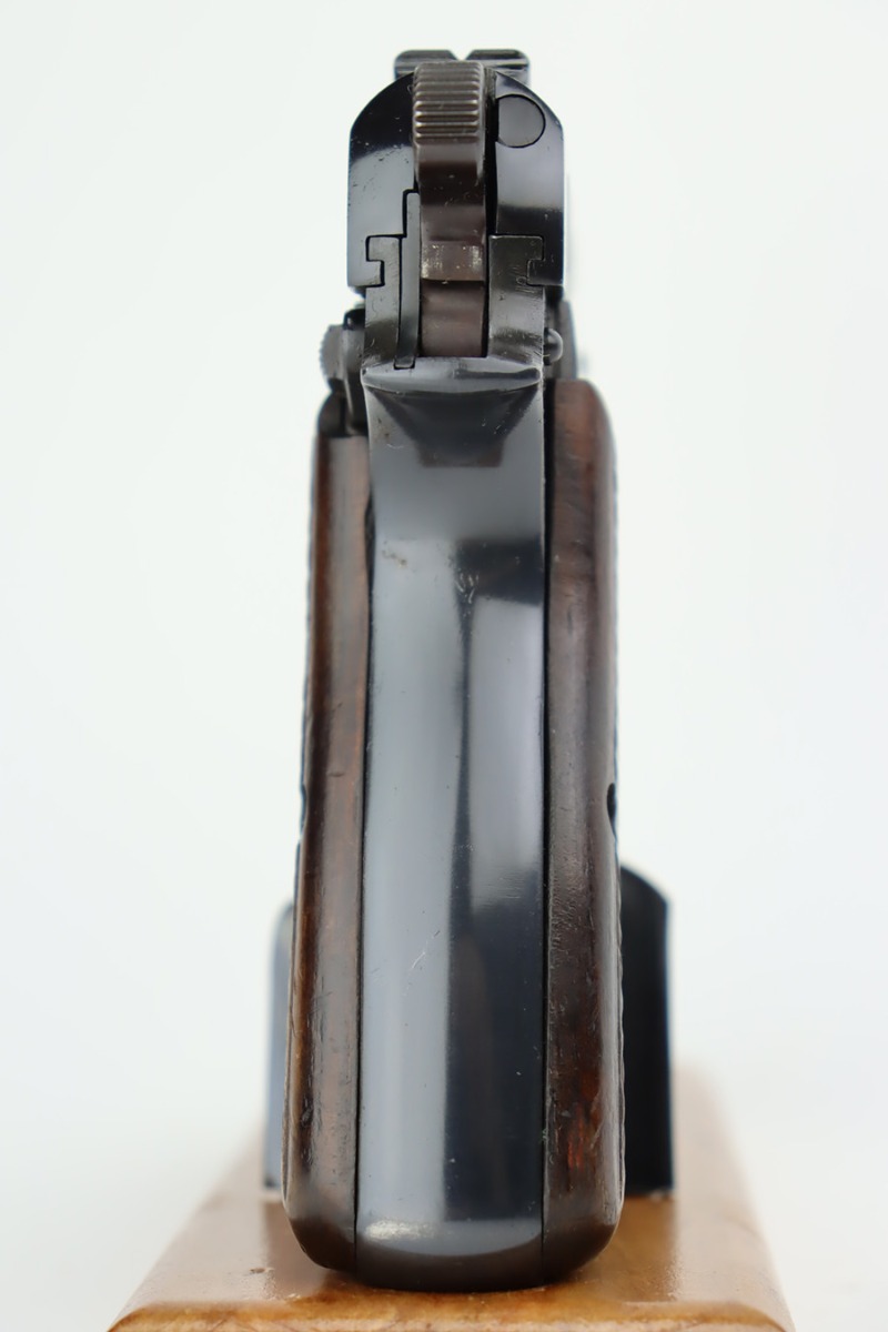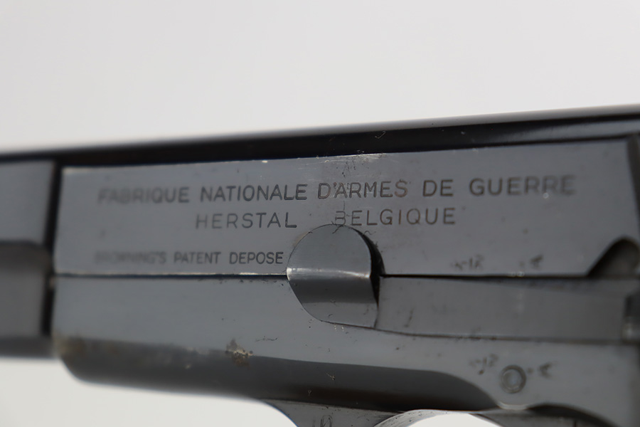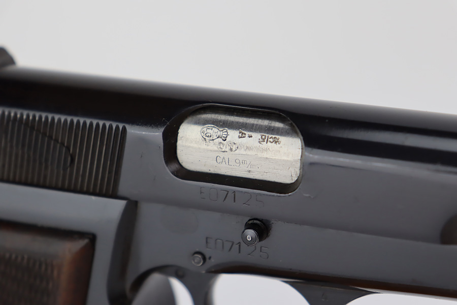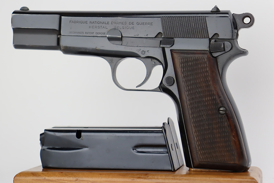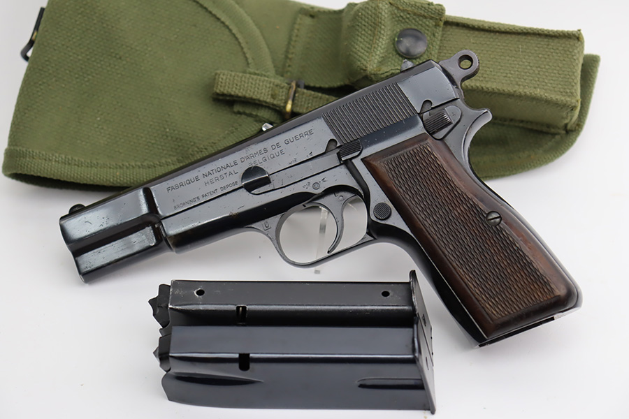 8/29/23 – This is an excellent example of an FN Browning Hi Power manufactured in the 1950’s. It is all matching and has the proper Belgian proofs. It comes as a rig with two magazines and a green canvas holster. The gun itself has retained about 97% of its high polish finish. There is very minor wear on some of the high edges, some light spotty wear on the front strap, and a few small spots of minor pitting on the left side of the frame. Fitted with excellent period-correct wood grips. The bore is shiny with strong rifling, but there is an area of very light freckling.