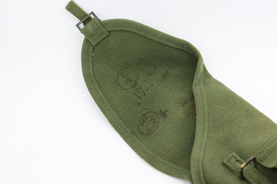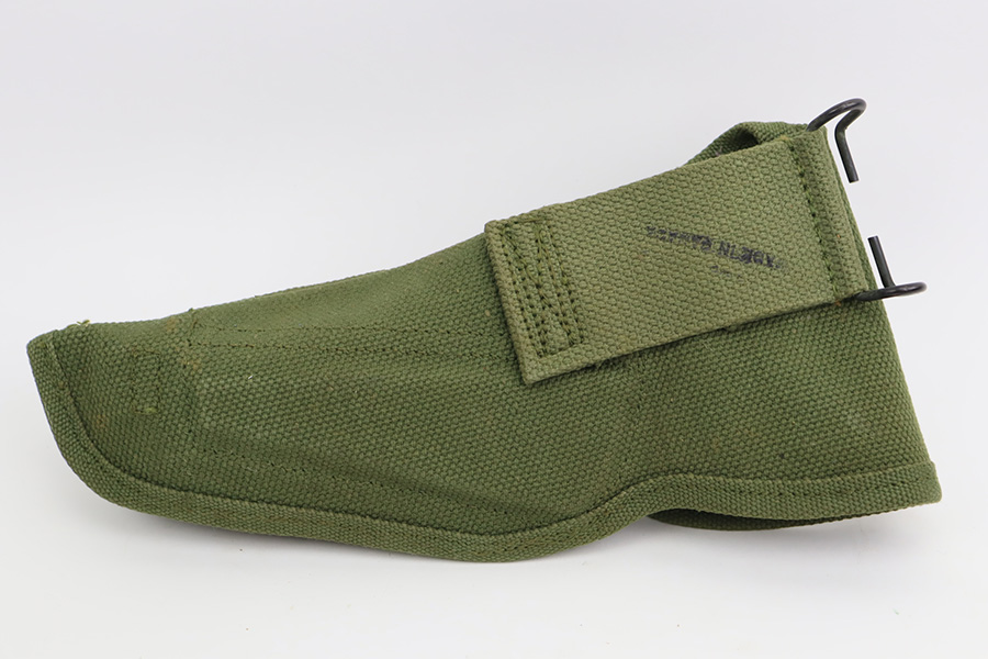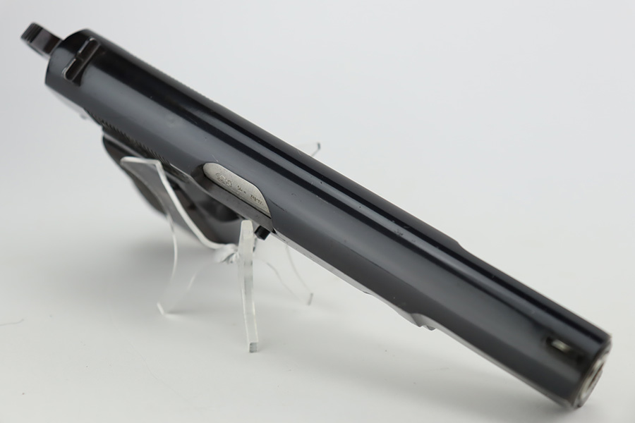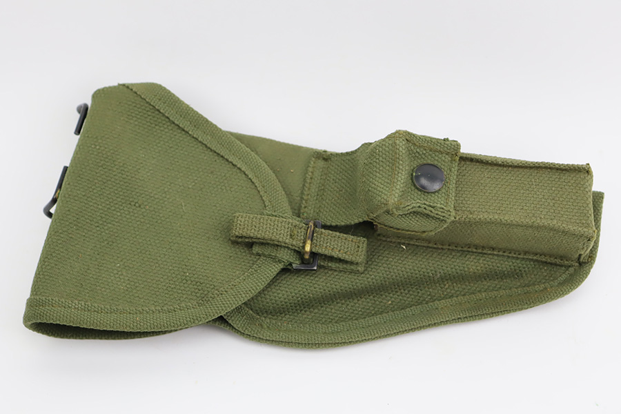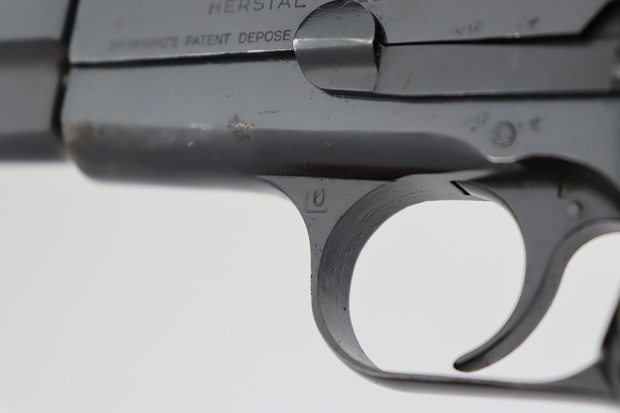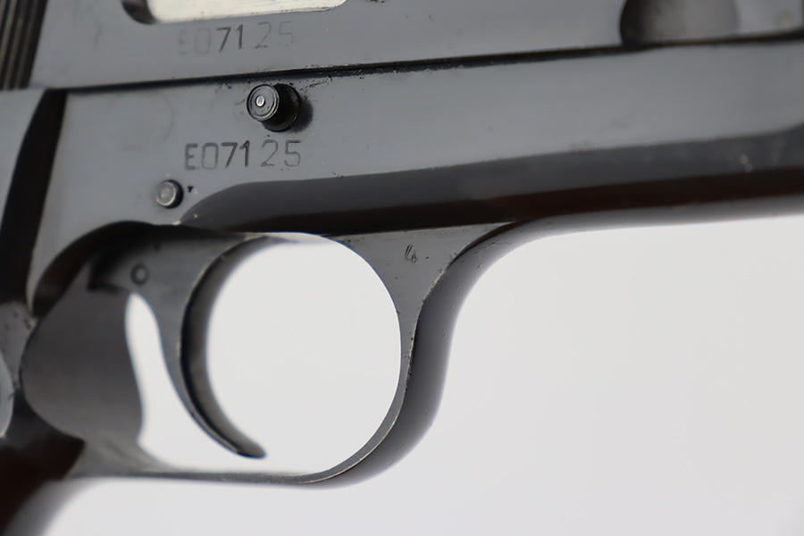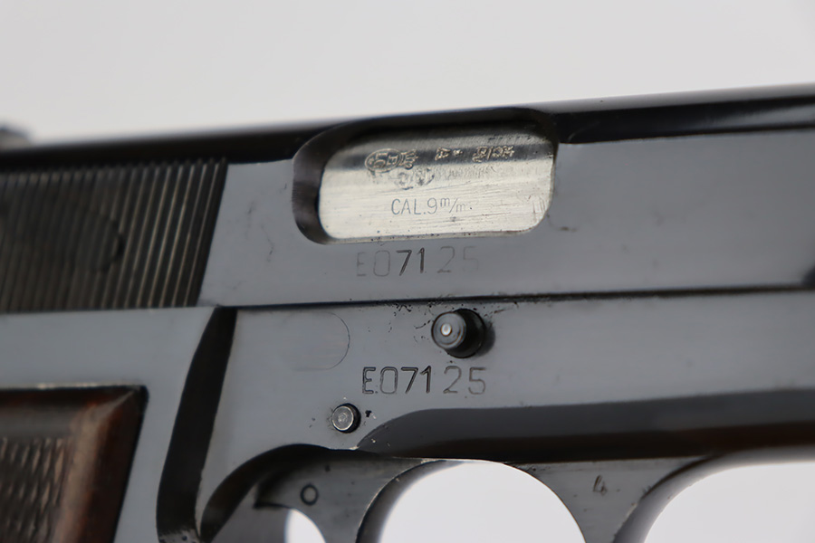8/29/23 – This is an excellent example of an FN Browning Hi Power manufactured in the 1950’s. It is all matching and has the proper Belgian proofs. It comes as a rig with two magazines and a green canvas holster. The gun itself has retained about 97% of its high polish finish. There is very minor wear on some of the high edges, some light spotty wear on the front strap, and a few small spots of minor pitting on the left side of the frame. Fitted with excellent period-correct wood grips. The bore is shiny with strong rifling, but there is an area of very light freckling.